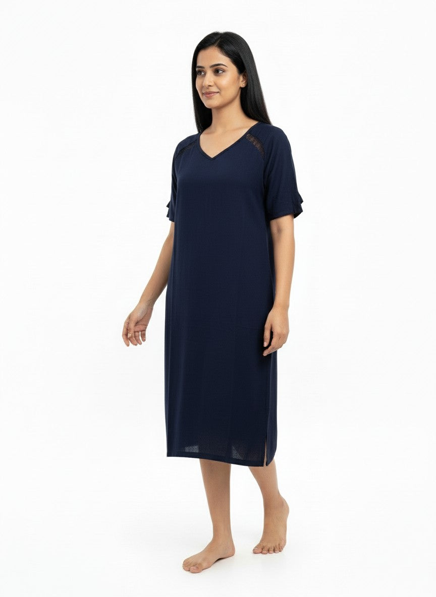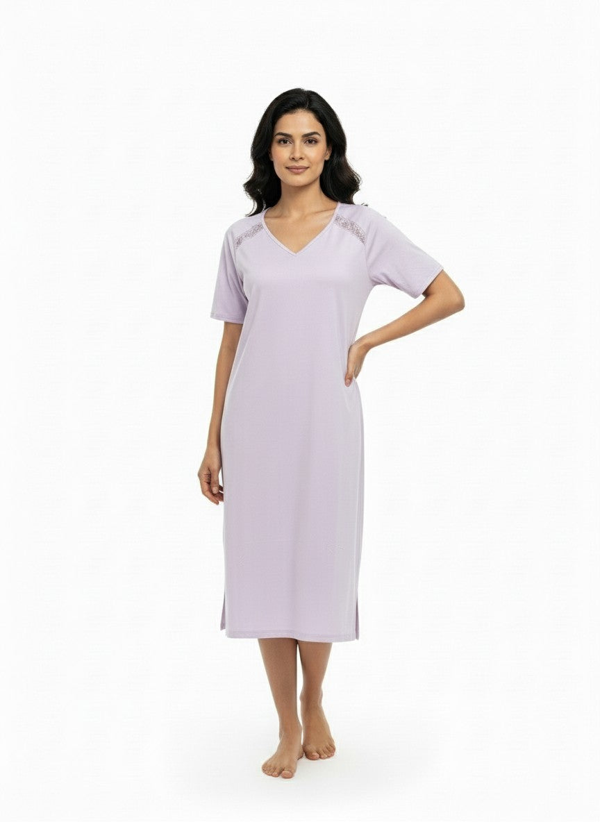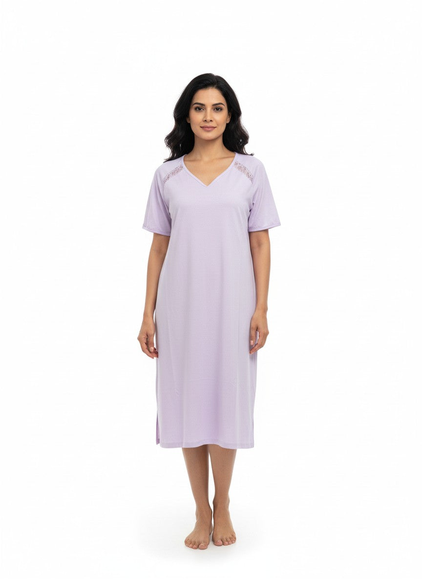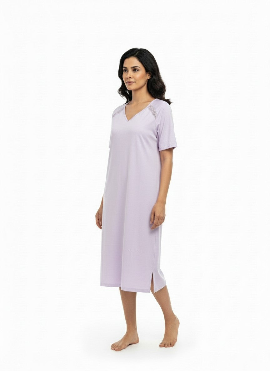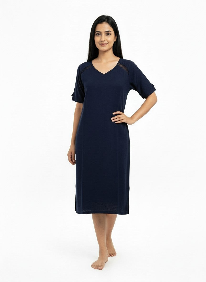 Experience playful and cute comfort with this Sweetdreams short nightie, designed for relaxed lounging and restful sleep. The regular fit silhouette features half sleeves and a flattering V-neck pullover style with a solid pattern that enhances its simplicity and elegance. Crafted from breathable, lightweight cotton fabric blended with stretch knit, it ensures flexibility and all-season wearability. Easy to care for with machine wash cold instructions, this nightie is perfect for everyday comfort and a cozy night.