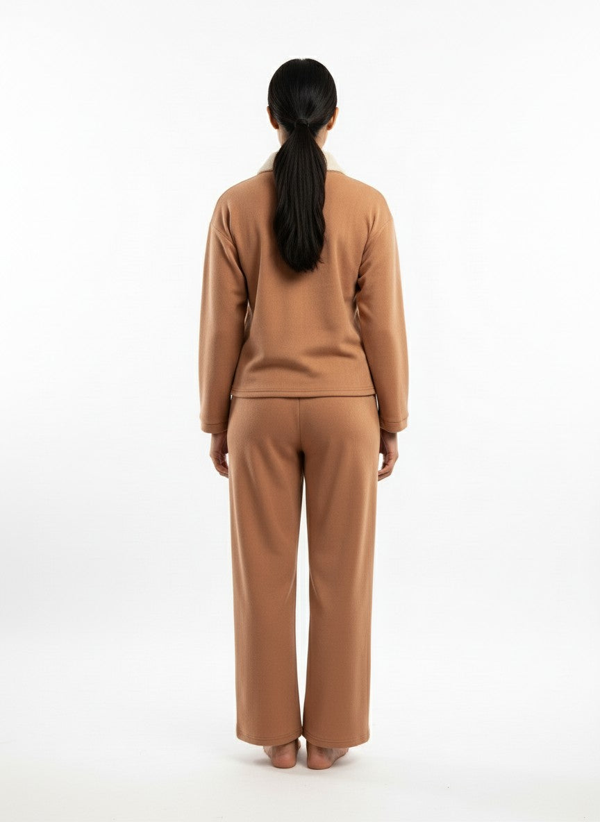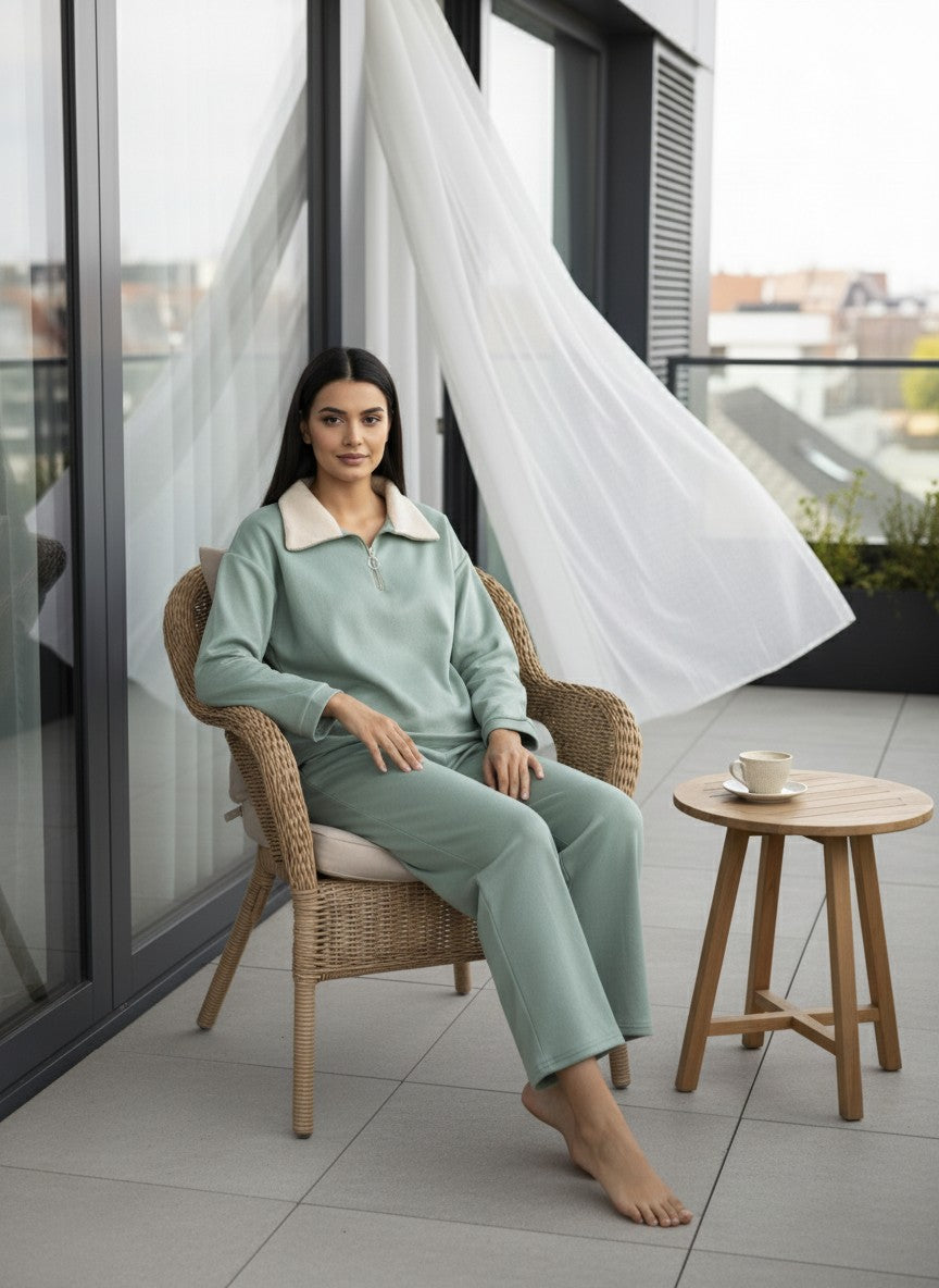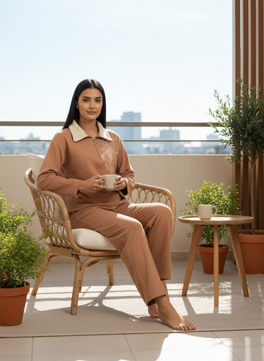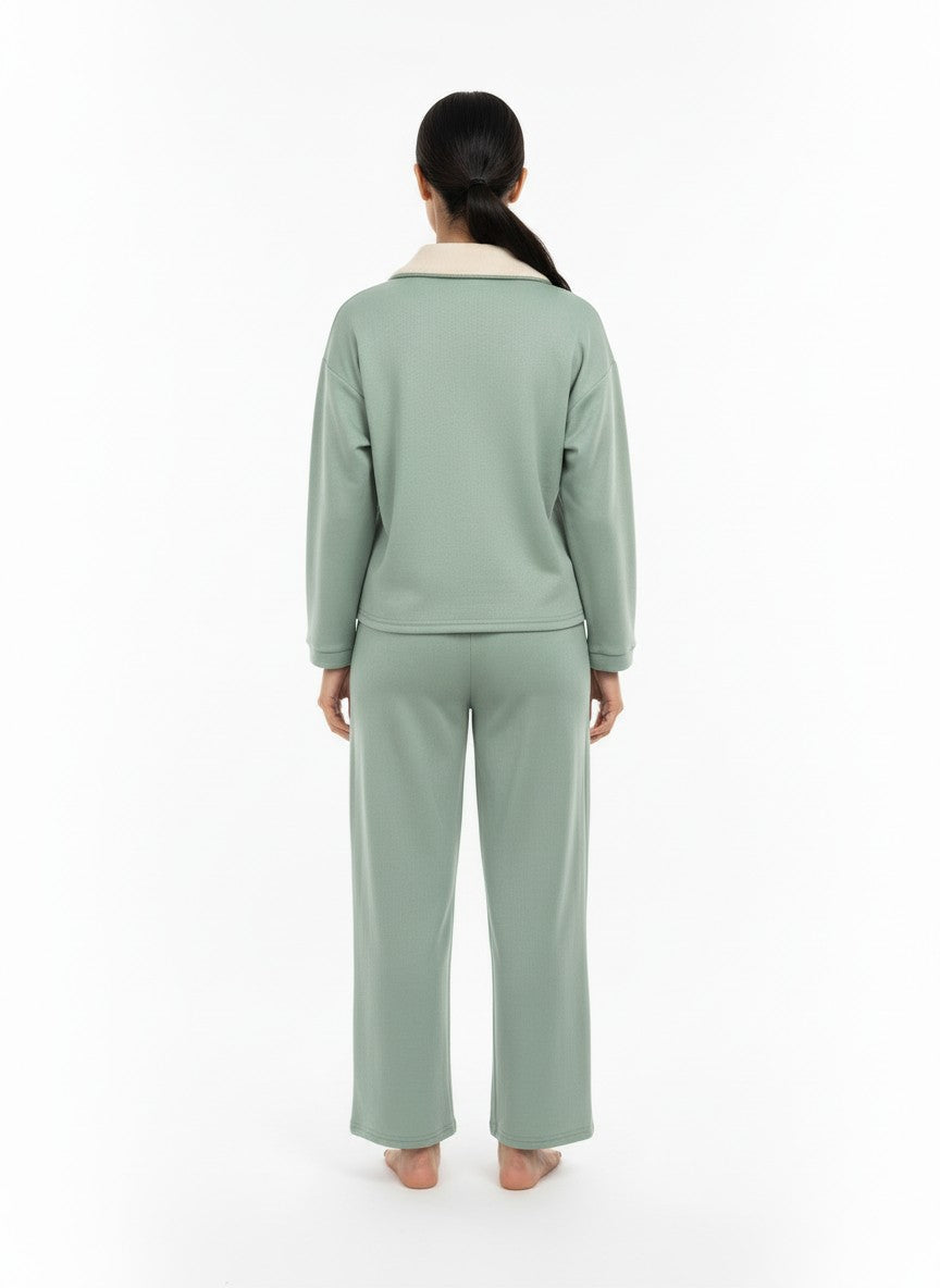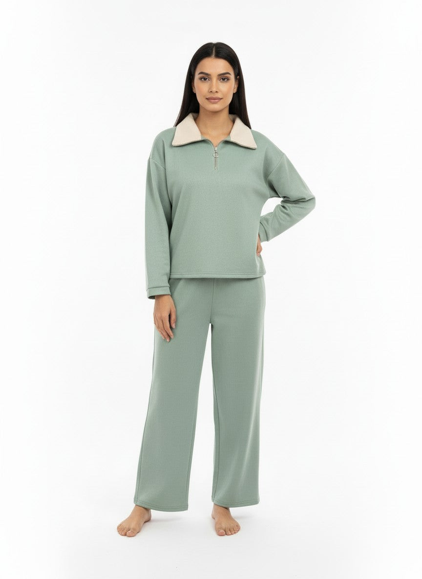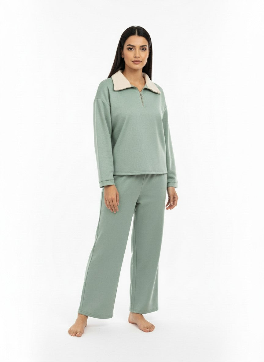 Experience ultimate comfort and a relaxed mood with this Sweetdreams loungewear coord set, perfect for travel and everyday wear. The regular fit silhouette with full sleeves, collar neck, and zipper closure offers ease and style with a solid dusty blue pattern. Crafted from breathable medium weight stretch suede fabric suitable for all seasons, it ensures cozy wear that is machine washable for easy care. Ideal for those seeking soft, stretchable, and practical everyday comfort.
