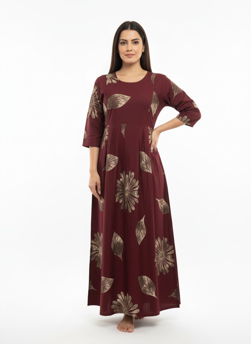 Experience unmatched comfort with this maroon maternity nightdress by Sukanya that offers a loose fit silhouette perfect for relaxation and restful nights. Featuring long sleeves, a round neck, pullover closure, and a charming floral pattern, this nightdress combines style and ease effortlessly. Crafted from lightweight, stretchable viscose fabric suitable for all seasons, it provides breathable softness throughout the day and night. Easy to care for with machine wash cold instructions, it's an ideal choice for maternity sleepwear designed to soothe and support during special moments.