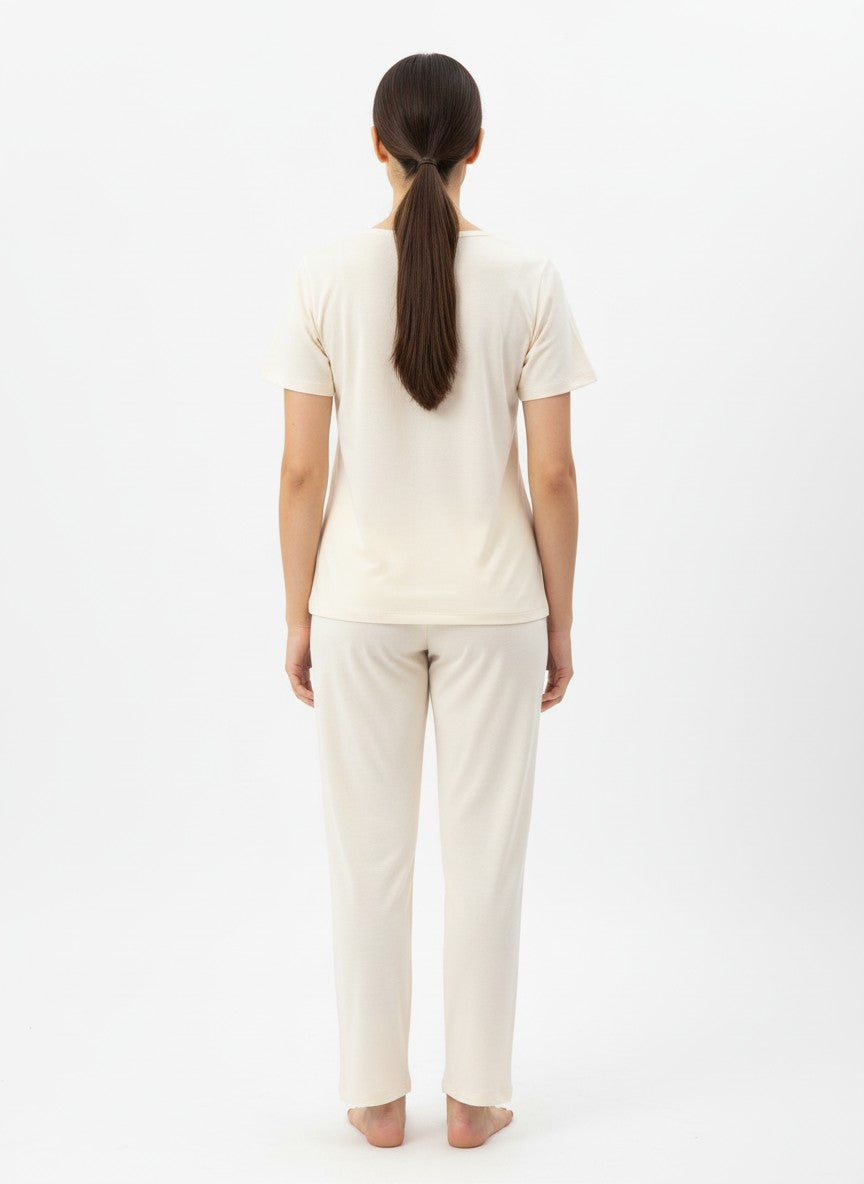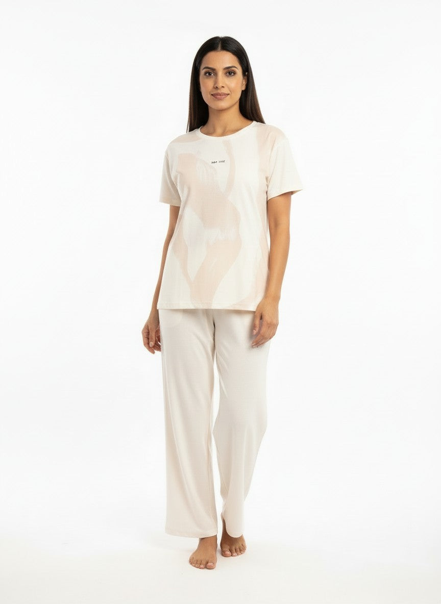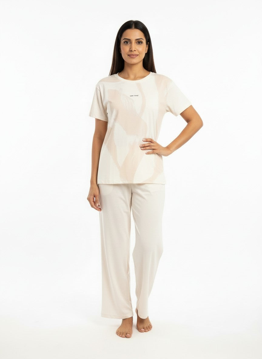 Experience ultimate comfort and modern minimalism with this SWEETDREAMS pyjama set, designed for all-season wear with a lightweight breathable feel. The regular fit silhouette features half sleeves, a round neckline, and a convenient pullover closure, adorned with an abstract pattern that adds subtle style. Crafted from Luxesoft fabric known for its stretchability and soft touch, it ensures cozy lounging and restful sleep. Easy to care for with machine wash cold instructions, this set is perfect for relaxed everyday comfort.
