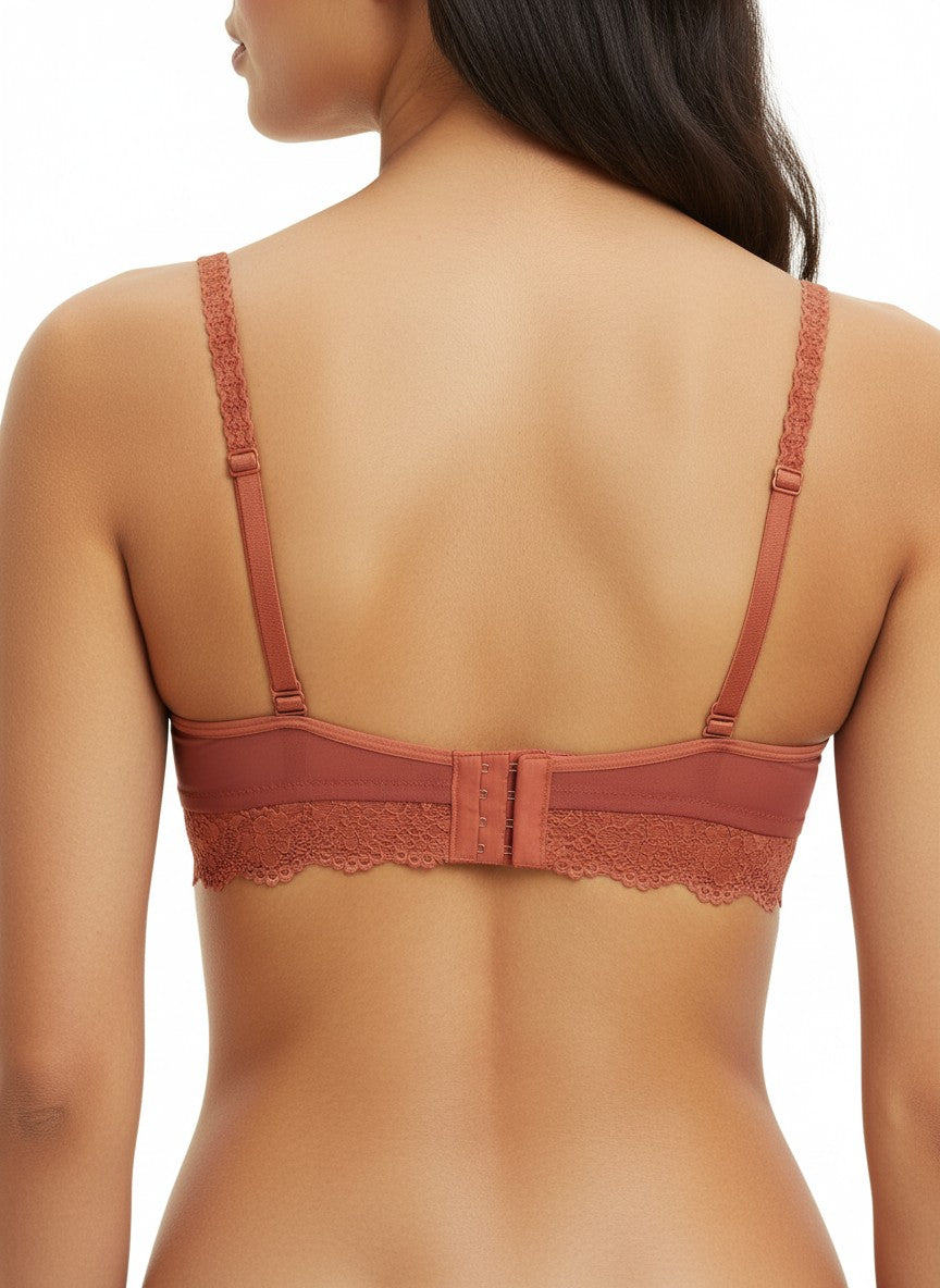 Clovia Lace Padded Bralette – Full Coverage is designed to offer reassuring comfort and confidence with its full coverage shape and non-wired construction, making it gentle for everyday wear while still providing dependable support. The padded cups enhance shape modestly, while the U-Back design, adjustable straps, and hook-and-eye closure help ensure a secure, customized fit that stays in place through your day. Crafted in lace, it offers a soft, feminine feel with a delicate texture that sits comfortably against the skin, making it suitable for regular use when you want both ease and style. The solid brown shade adds understated versatility to your lingerie drawer, and with simple hand wash care, this bralette remains a practical choice for frequent wear without compromising its elegant look.