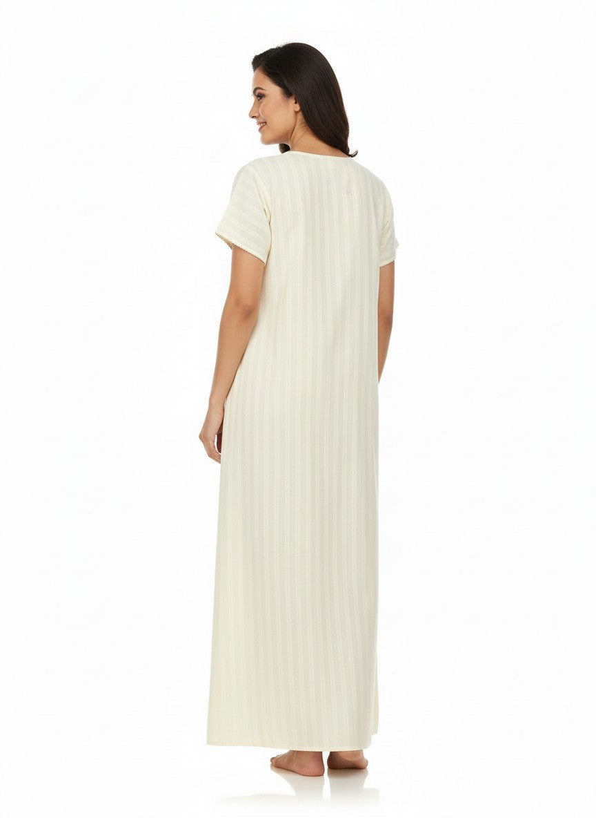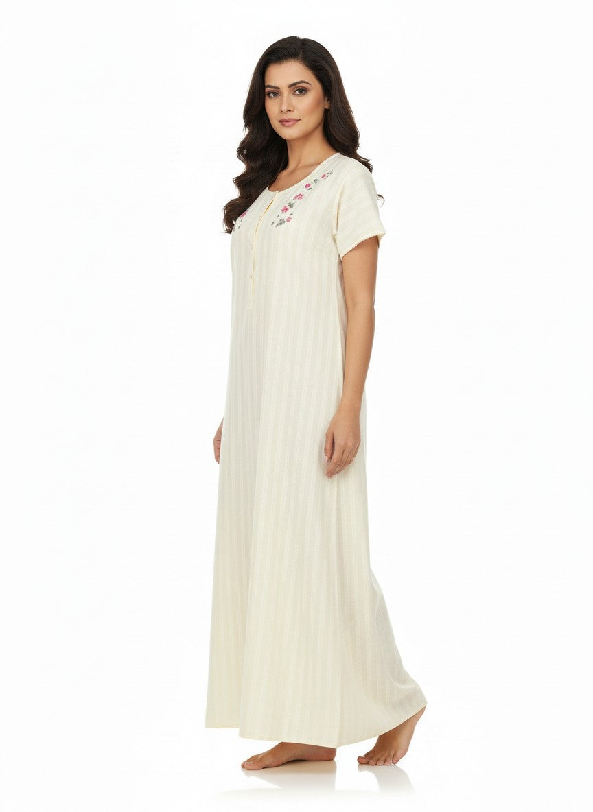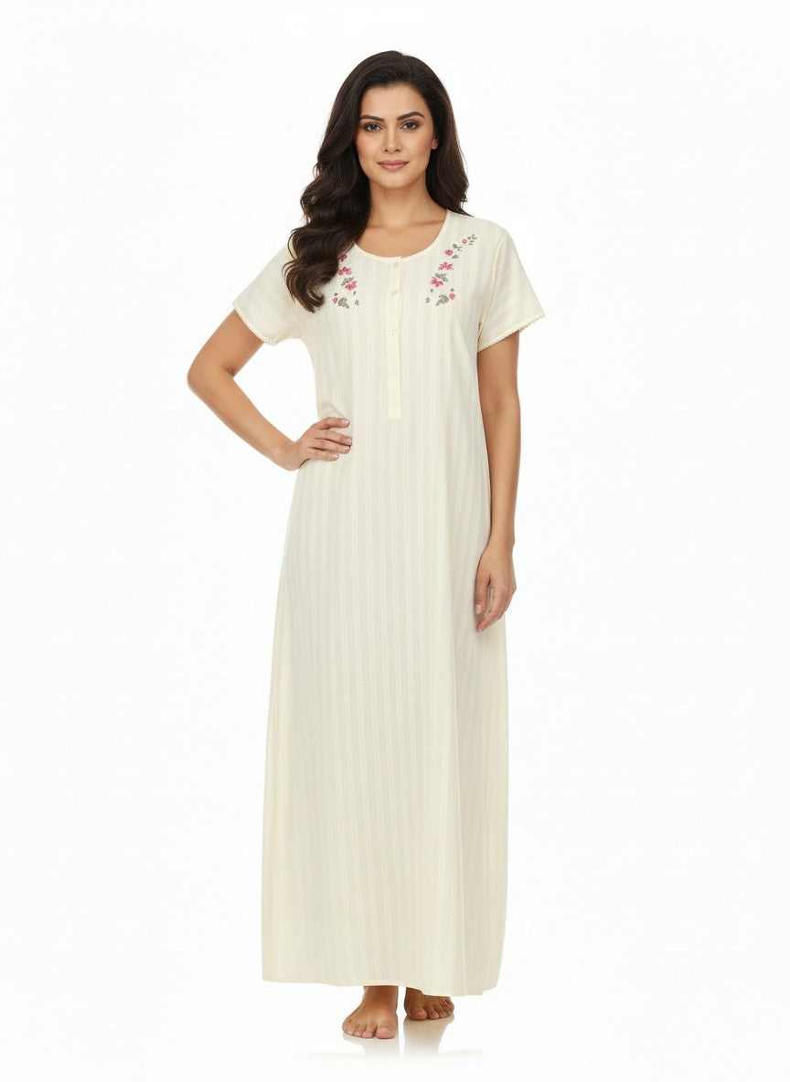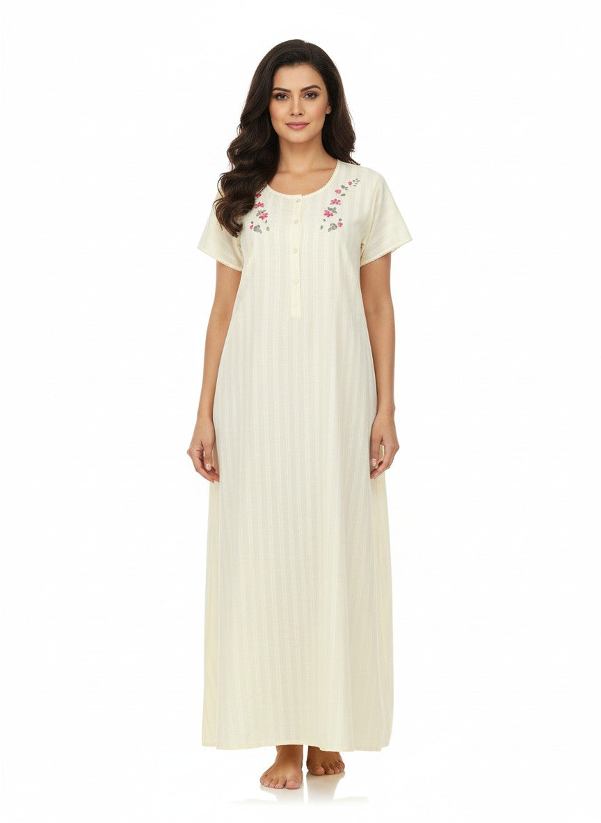Experience everyday comfort with this Velvet nightdress designed for ultimate softness and a relaxed mood. The A-Line silhouette features half sleeves, a round neck, and button closure, enhanced by elegant embroidered detailing. Made from breathable medium weight cotton, this non-stretchable garment is suitable for all seasons. Easy to care for with machine wash cold instructions, it is perfect for lounging and peaceful nights.