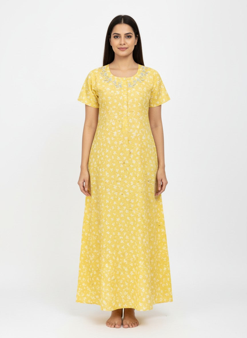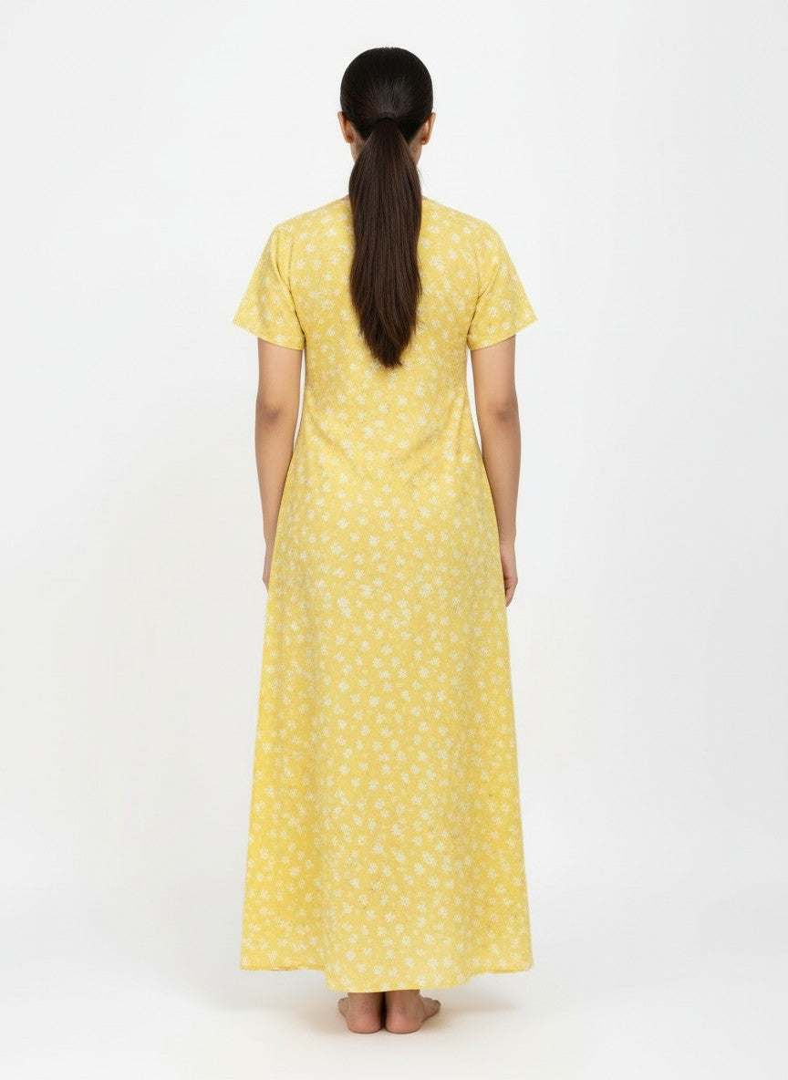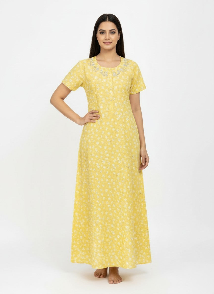 This Velvet nighty offers everyday comfort with a lightweight, breathable cotton fabric perfect for summer. Its floral pattern on an A-line silhouette with half sleeves, a round neckline, and button closure enhances relaxation and style. Machine wash cold for easy care.