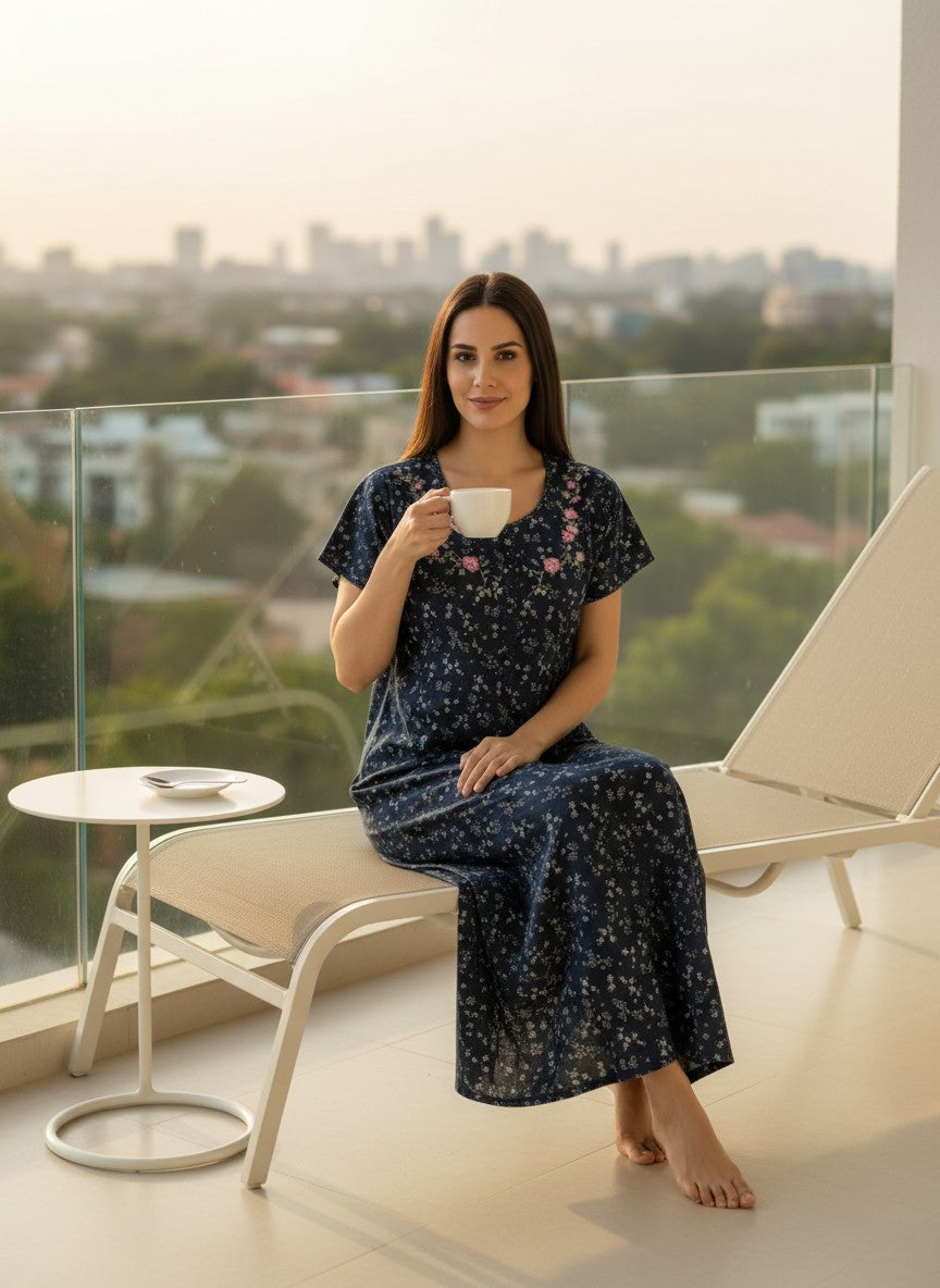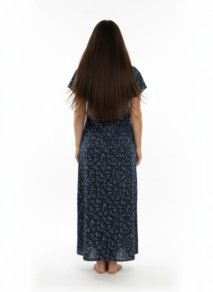 Enjoy everyday comfort with this lightweight, stretchable nightdress that exudes softness and ease, perfect for relaxing or sleeping. Featuring a flattering A-line silhouette with half sleeves, a round neckline, and a convenient pullover closure, it boasts a charming floral pattern that enhances its tranquil vibe. Crafted from cotton, it offers breathable comfort suitable for all seasons, and it is easy to care for with machine wash cold instructions, making it an ideal choice for loungewear and nighttime wear.