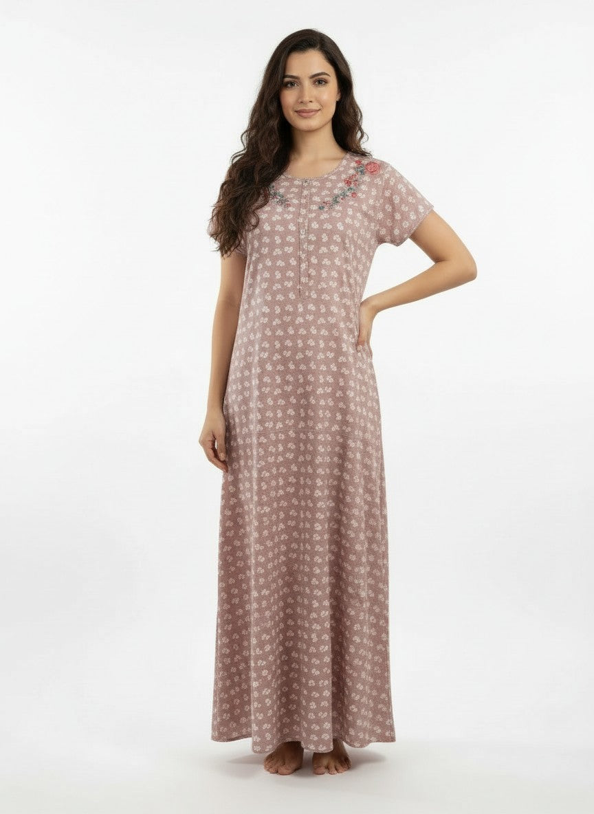 Experience everyday comfort with this Velvet nightdress designed for softness and relaxation. The regular fit silhouette features half sleeves, a round neckline, and a pullover closure showcasing a charming floral pattern. Made from lightweight cotton fabric, it offers breathability, stretchability, and suitability for all seasons. Easy to care for with machine wash cold instructions, this nightdress is perfect for lounging and peaceful sleep.