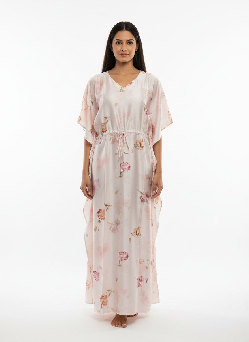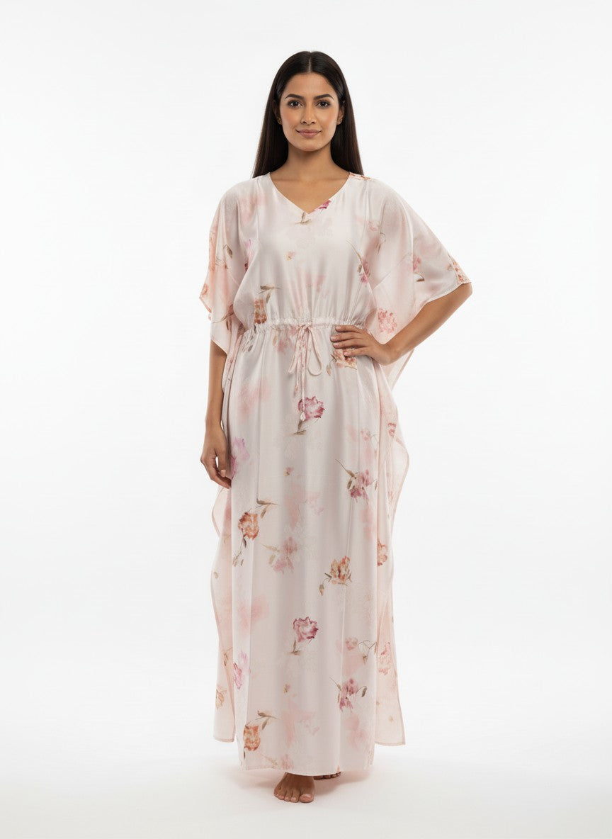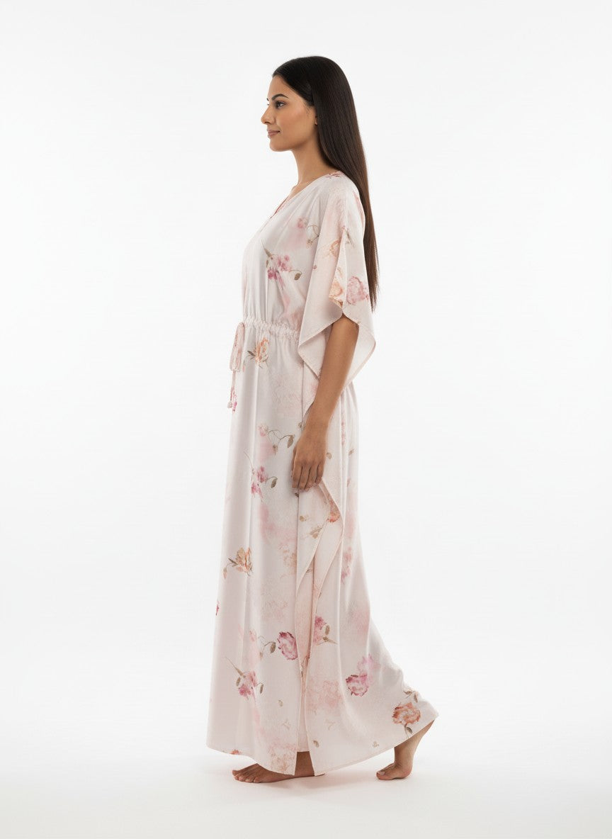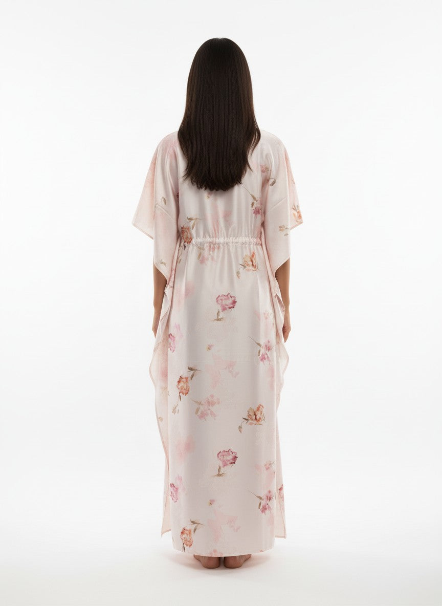 Embrace relaxed comfort with this lightweight Italian satin nightdress, perfect for all seasons and lounging in luxe style. Designed with a relaxed fit, long sleeves, a V-neckline, and a slip-on closure, it showcases a delicate floral pattern for elegant ease. The breathable, stretchable Italian satin fabric ensures softness and comfort, while machine wash cold care instructions make it practical for everyday wear.