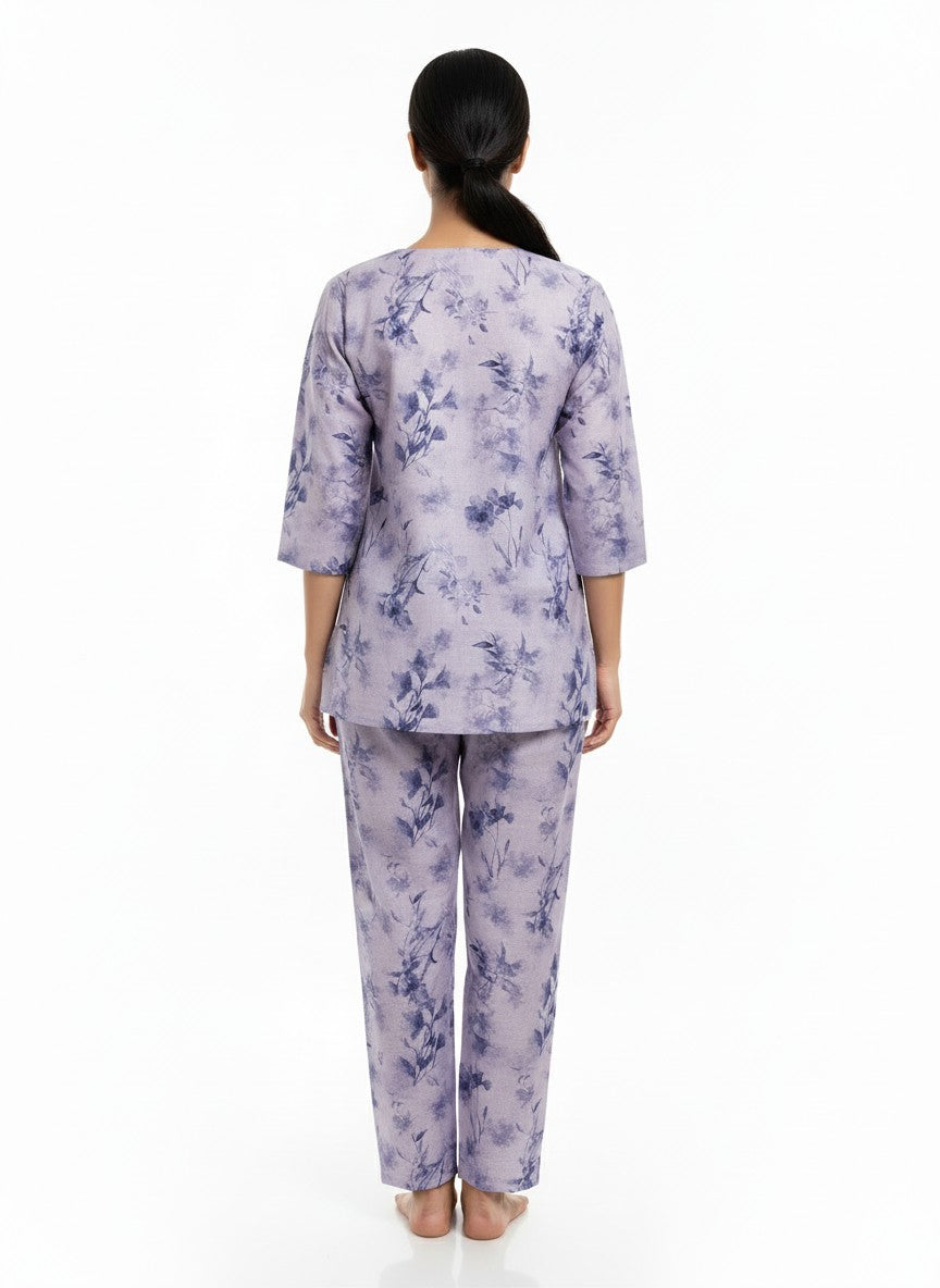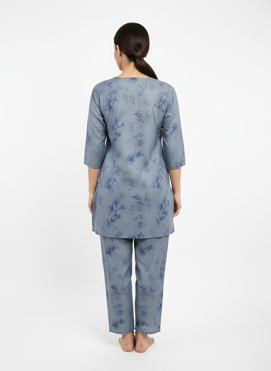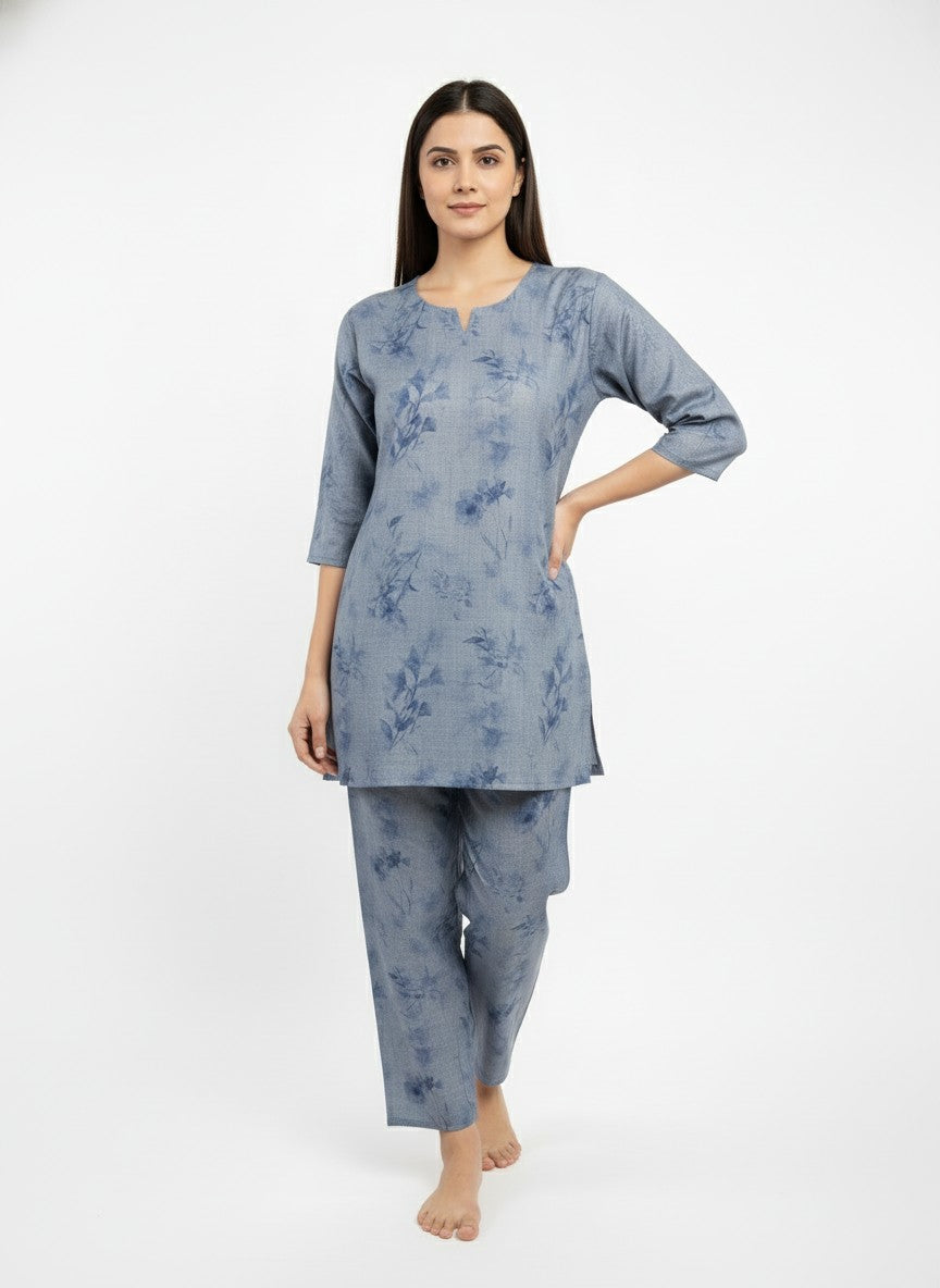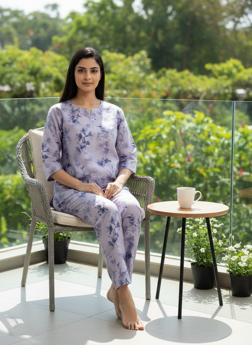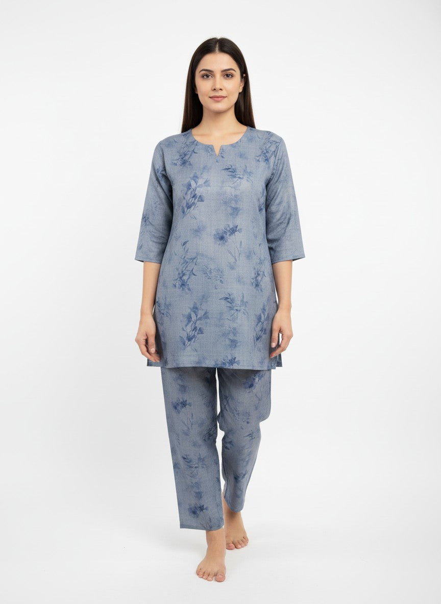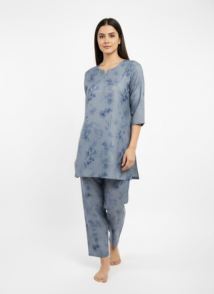Embrace the gentle comfort and soothing softness of this beautiful kurti set, perfect for relaxing at home or casual outings. Featuring a regular fit silhouette with long sleeves, a classic collar neck, and a pullover closure, it showcases an elegant floral pattern that adds a touch of grace. Crafted from breathable medium-weight linen fabric, it offers non-stretchable durability and all-season wearability. Easy to care for with machine wash cold instructions, this set is an ideal choice for everyday lounging and effortless style.