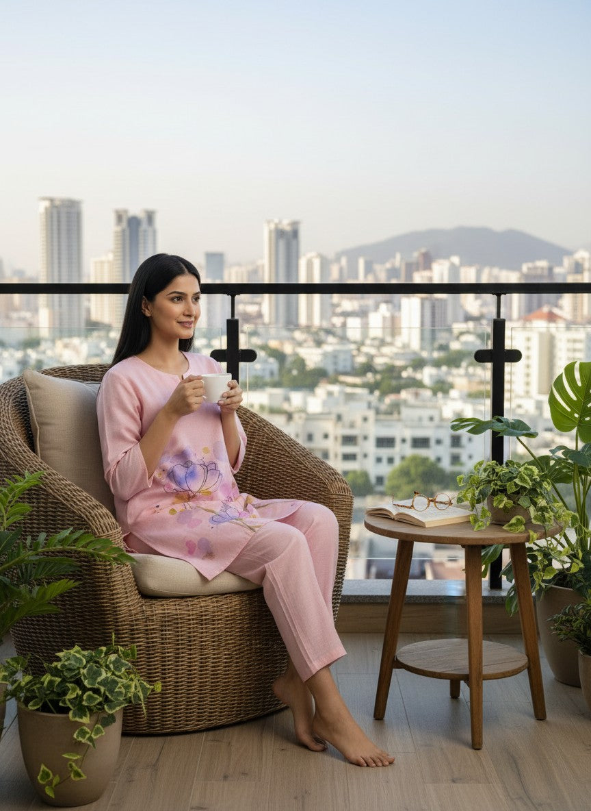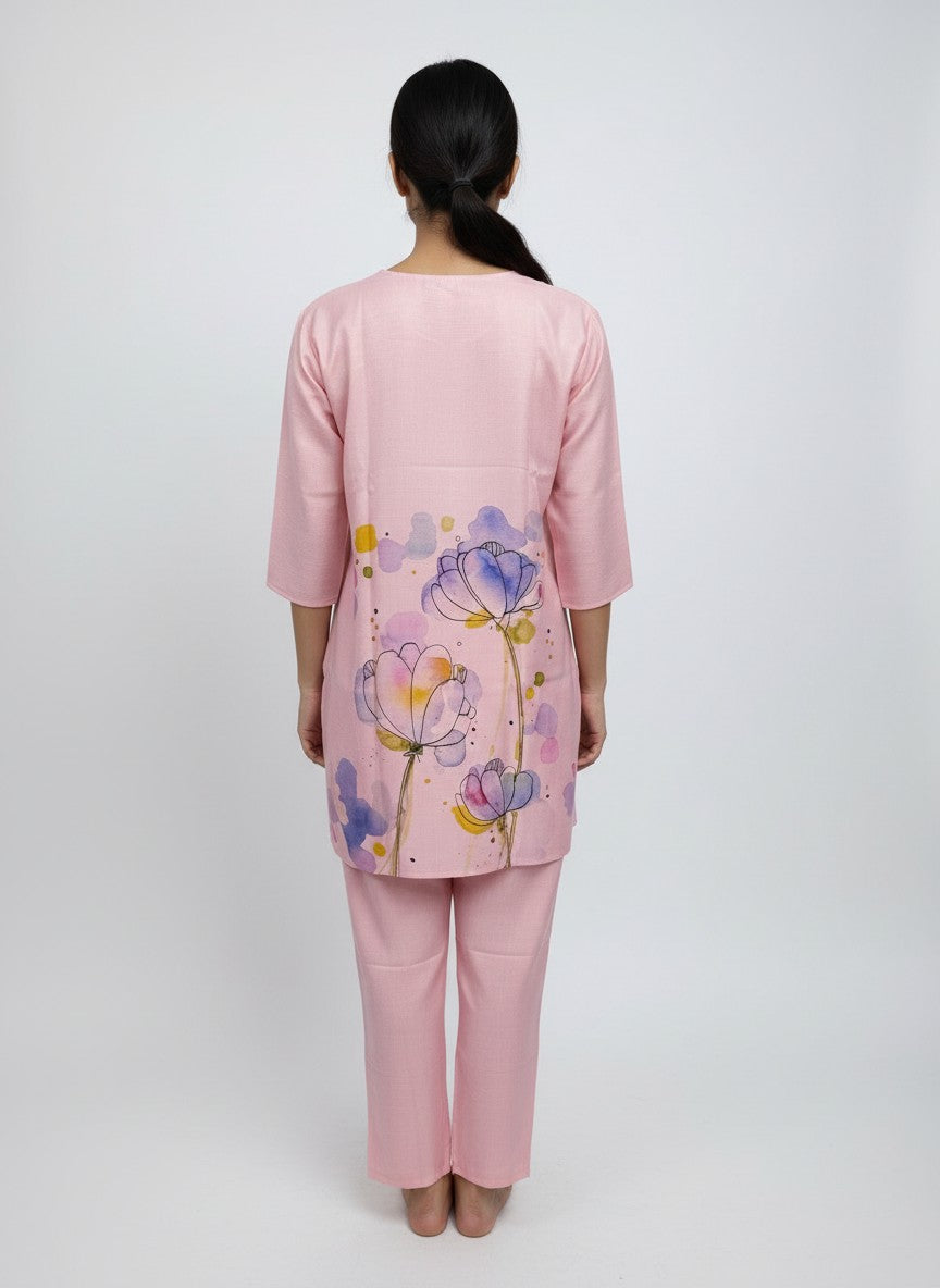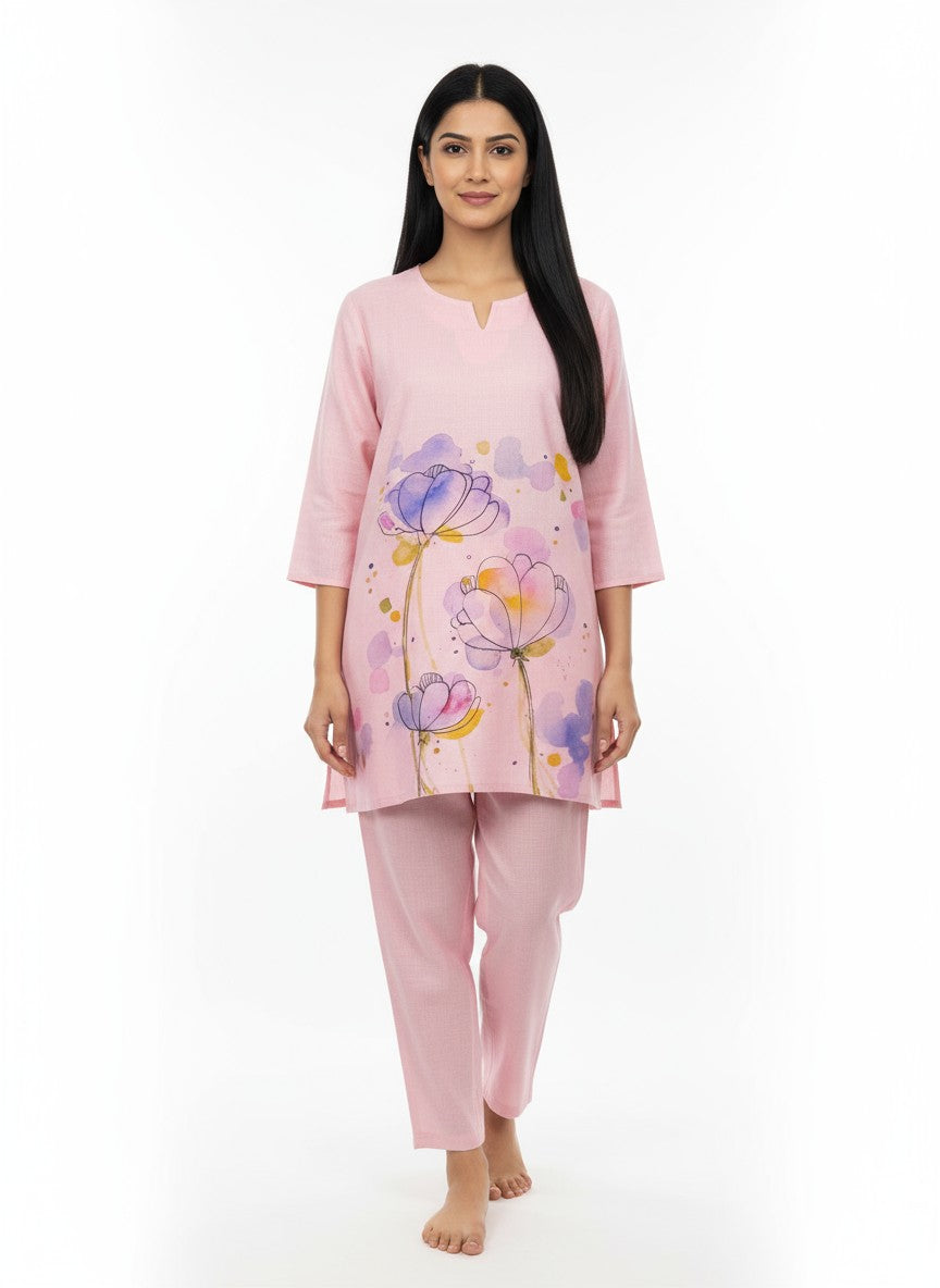 Experience ultimate comfort and a soothing mood with this elegant Womenstyle kurti set, designed for lounging and everyday ease. Featuring a regular fit silhouette with long sleeves, a collar neck, and a pullover closure, it is adorned with a delicate floral pattern that adds charm. Crafted from breathable medium-weight linen fabric, it offers non-stretchable comfort ideal for all seasons. Easy to care for with machine wash cold instructions, this kurti set is perfect for home and lounge wear, combining style with practical comfort.