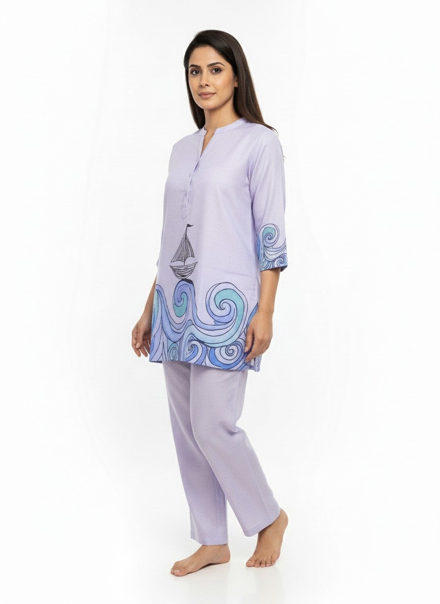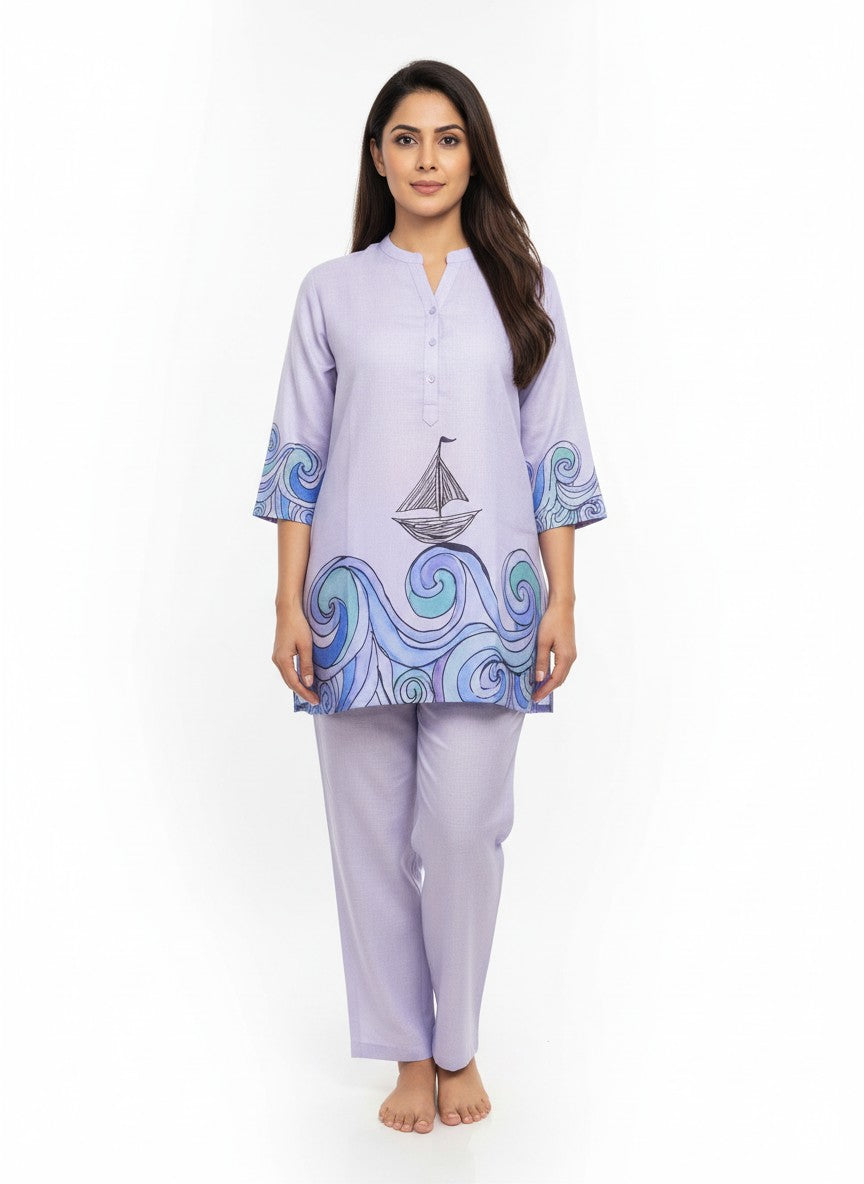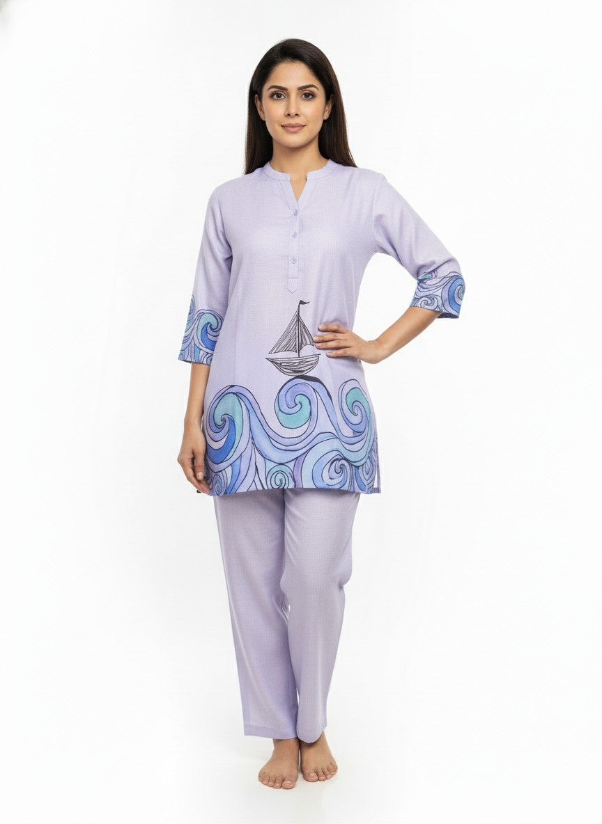 Experience unmatched comfort with this WOMENSTYLE kurti set, designed to envelop you in softness and ease, perfect for home and lounge wear. Featuring a regular fit silhouette with long sleeves, a collar neck, and button closure, it showcases a beautiful graphic print that adds a touch of artistic flair. Crafted from breathable linen fabric, it offers medium weight and non-stretchable properties suitable for all seasons. Easy to care for with machine wash cold instructions, this kurti set is an ideal choice for everyday relaxation and stylish lounging.
