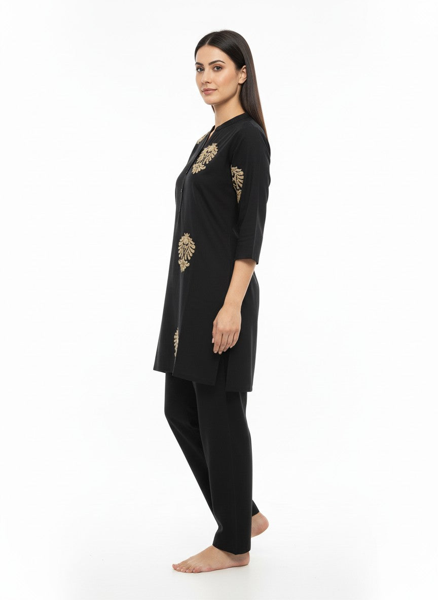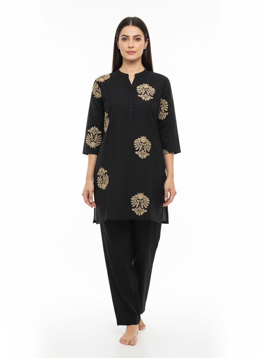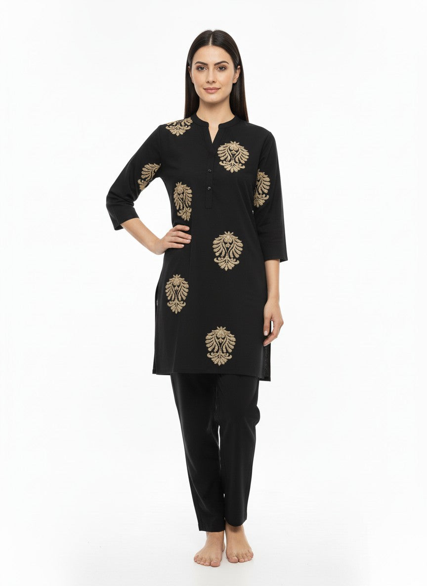 Experience ultimate comfort and softness ideal for home and lounge wear with this regular fit kurti set featuring long sleeves, a collar neck, and button closure. The embroidered pattern adds a touch of elegance, crafted from lightweight breathable linen fabric that provides stretch and is suitable for all seasons. Easy to care for with machine wash cold instructions, this kurti set is perfect for everyday comfort and relaxed living.