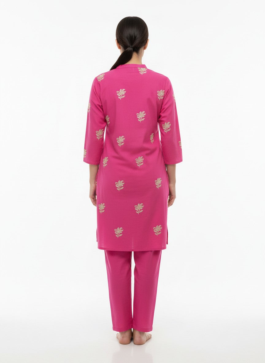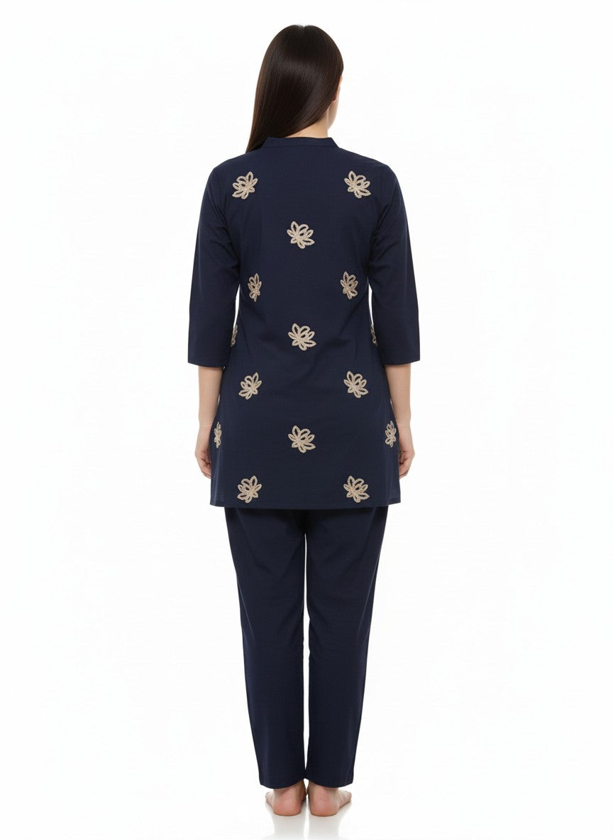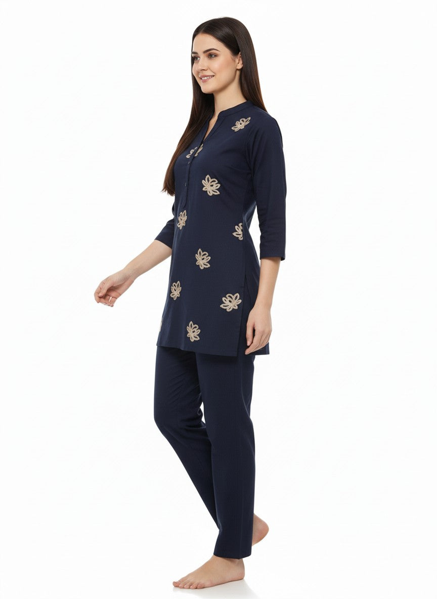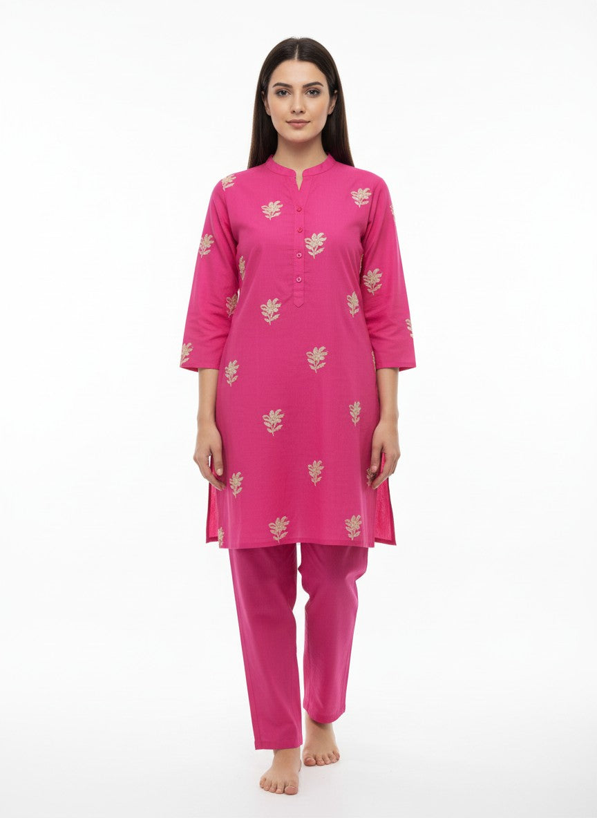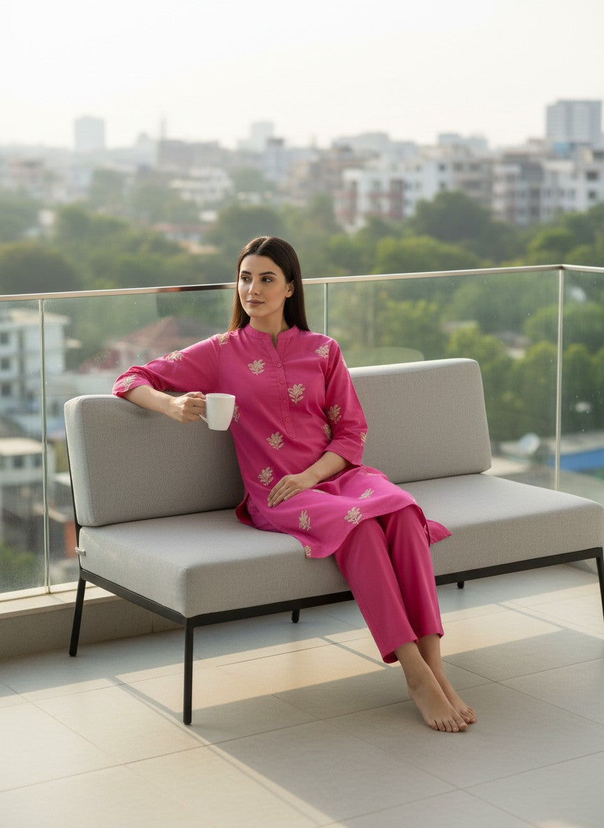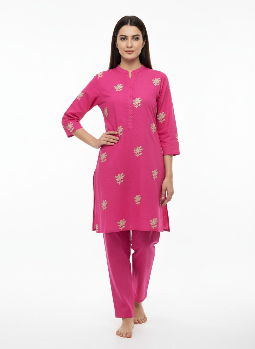 Experience the serene comfort and effortless style of this Womenstyle kurti set, designed for relaxed home and lounge wear. Featuring a regular fit silhouette with long sleeves, collar neck, and button closure, it showcases elegant embroidered detailing for a refined look. Crafted from breathable, lightweight linen, it offers stretchability and all-season suitability, ensuring you stay comfortable throughout the day. Easy to care for with hand wash separately instructions, this kurti set is perfect for lounging, casual wear, or everyday comfort.