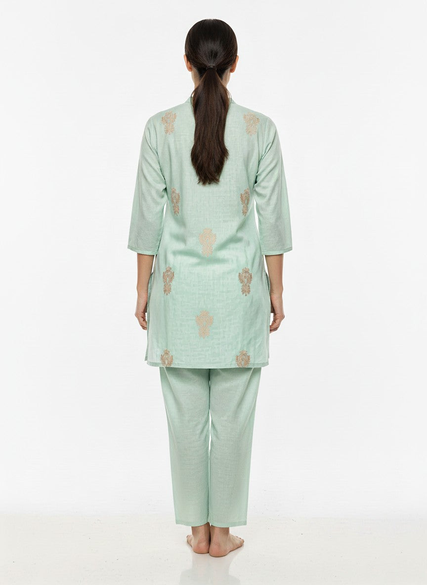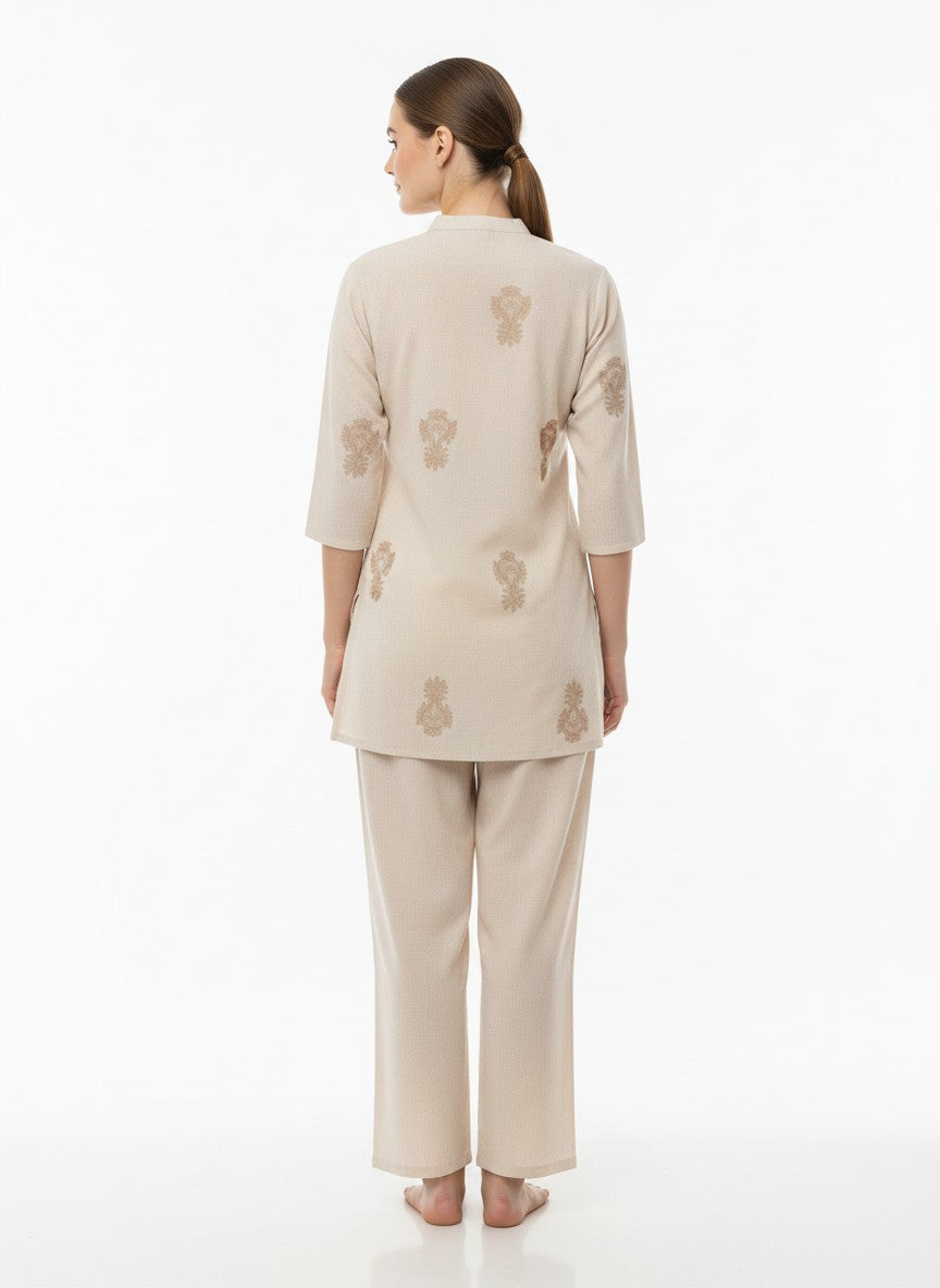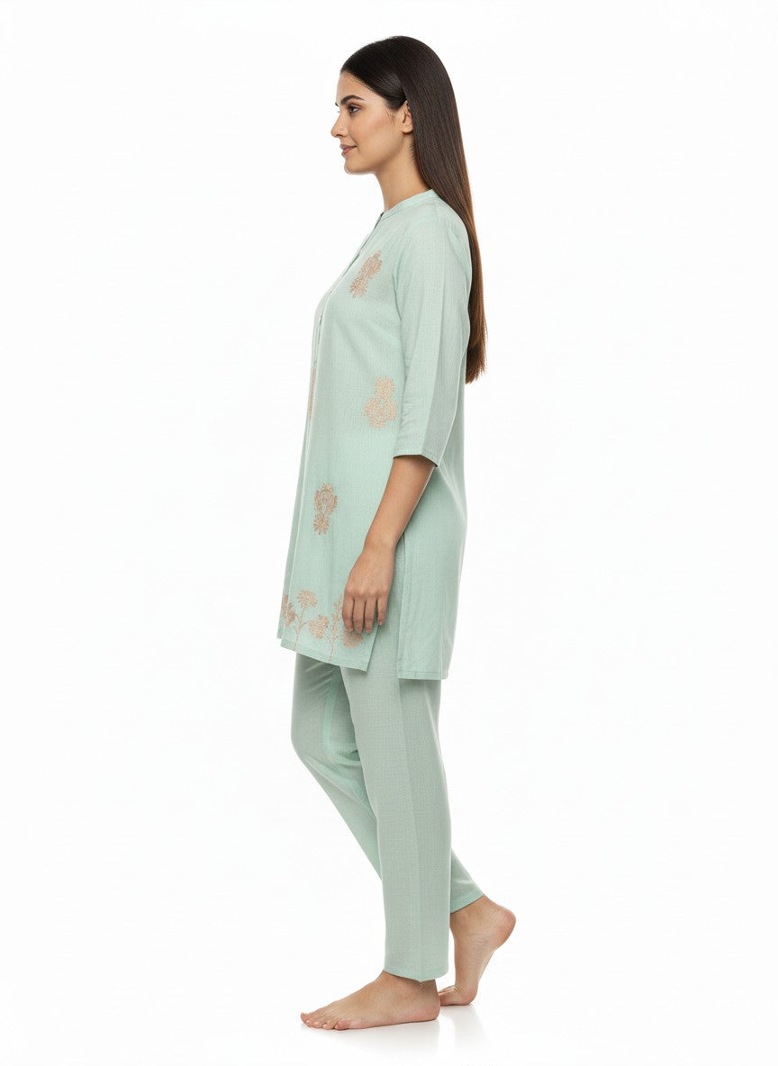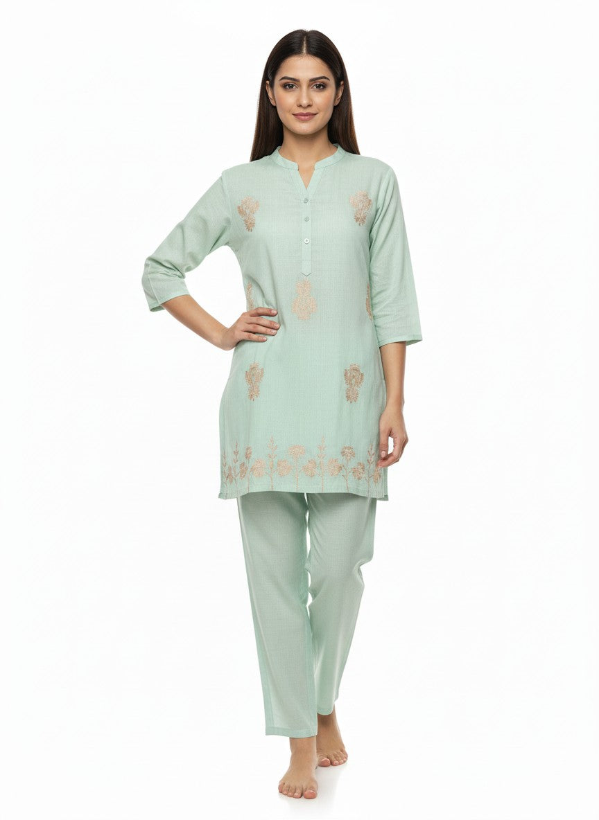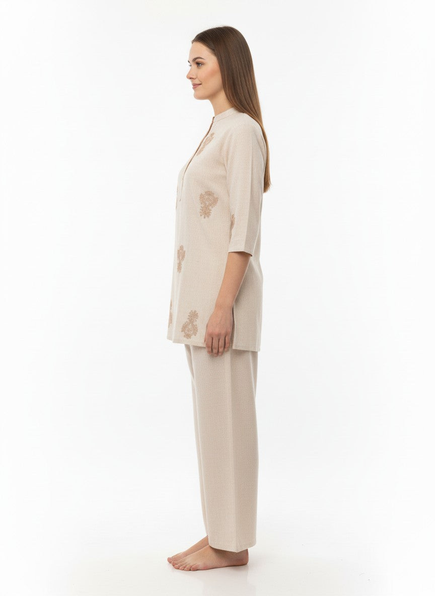 Experience ultimate ease and comfort with this beautifully embroidered kurti set, designed for a relaxed regular fit with long sleeves, a collar neck, and button closure that make it perfect for all seasons. Crafted from lightweight breathable linen fabric with a stretchable quality, it ensures you stay comfortable whether lounging at home or going about your day. Easy to care for with machine wash cold instructions, it's an ideal choice for everyday effortless style and comfort.