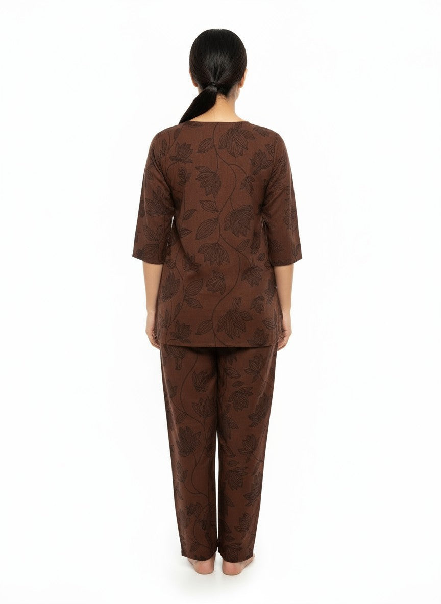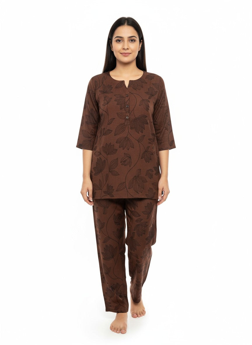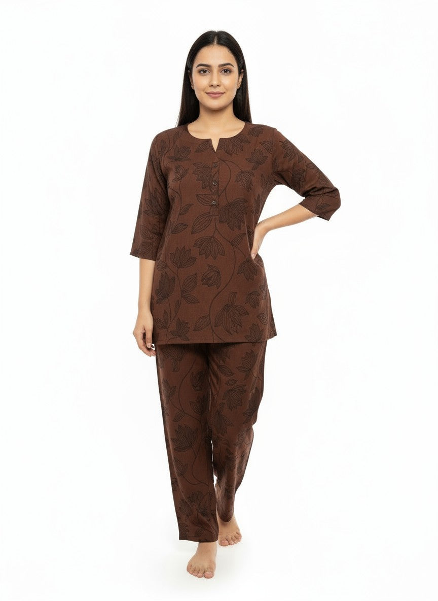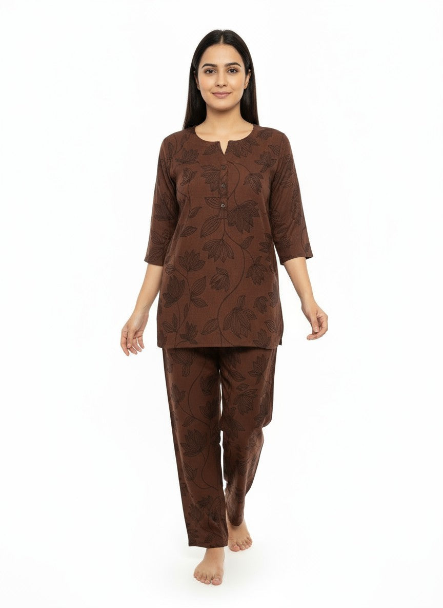 Experience cozy and elegant comfort with this maroon kurti set, designed for effortless style and ease. The regular fit silhouette with half sleeves, a round neck, and button closure highlights its graceful floral pattern, perfect for all seasons. Crafted from Koreon Modal Silk fabric, it offers a soft, medium weight texture with non-stretchable quality for breathable wear. Easy to maintain with machine wash cold instructions, this kurti set blends comfort and sophistication for your everyday wardrobe.