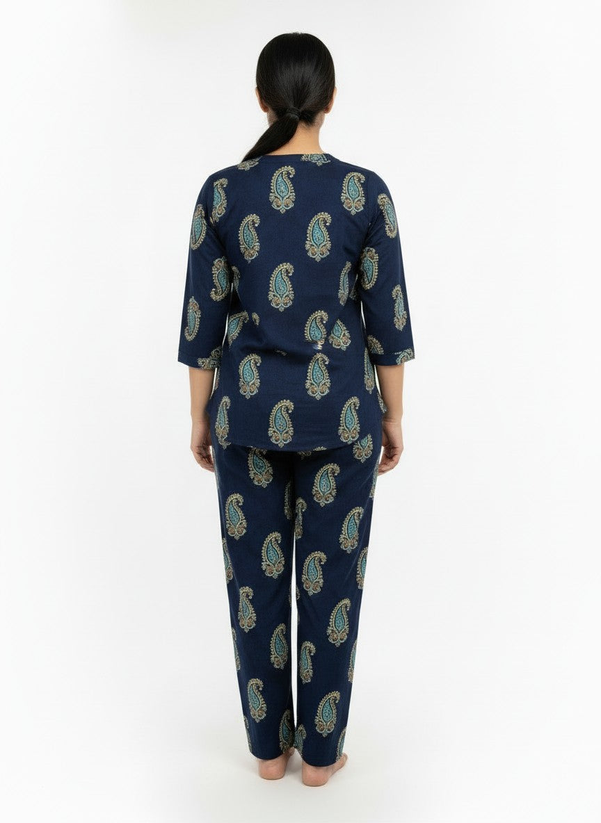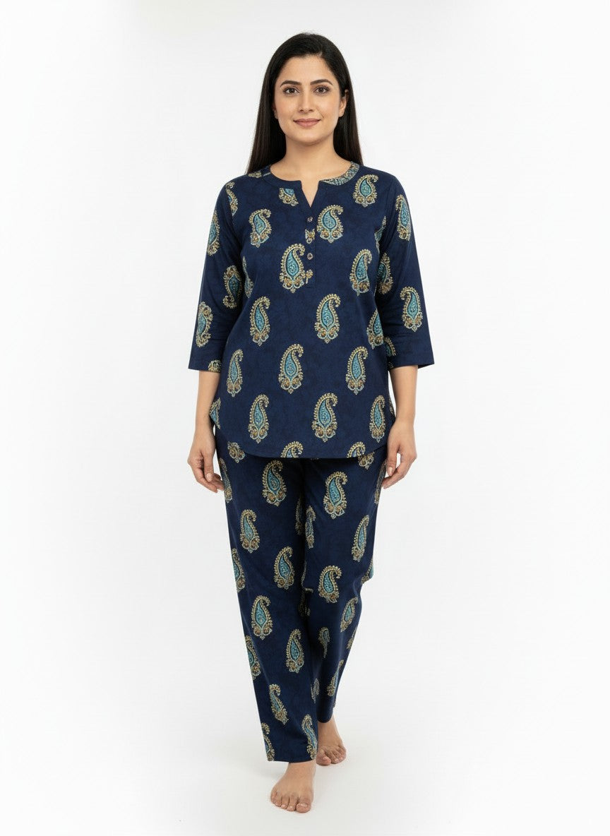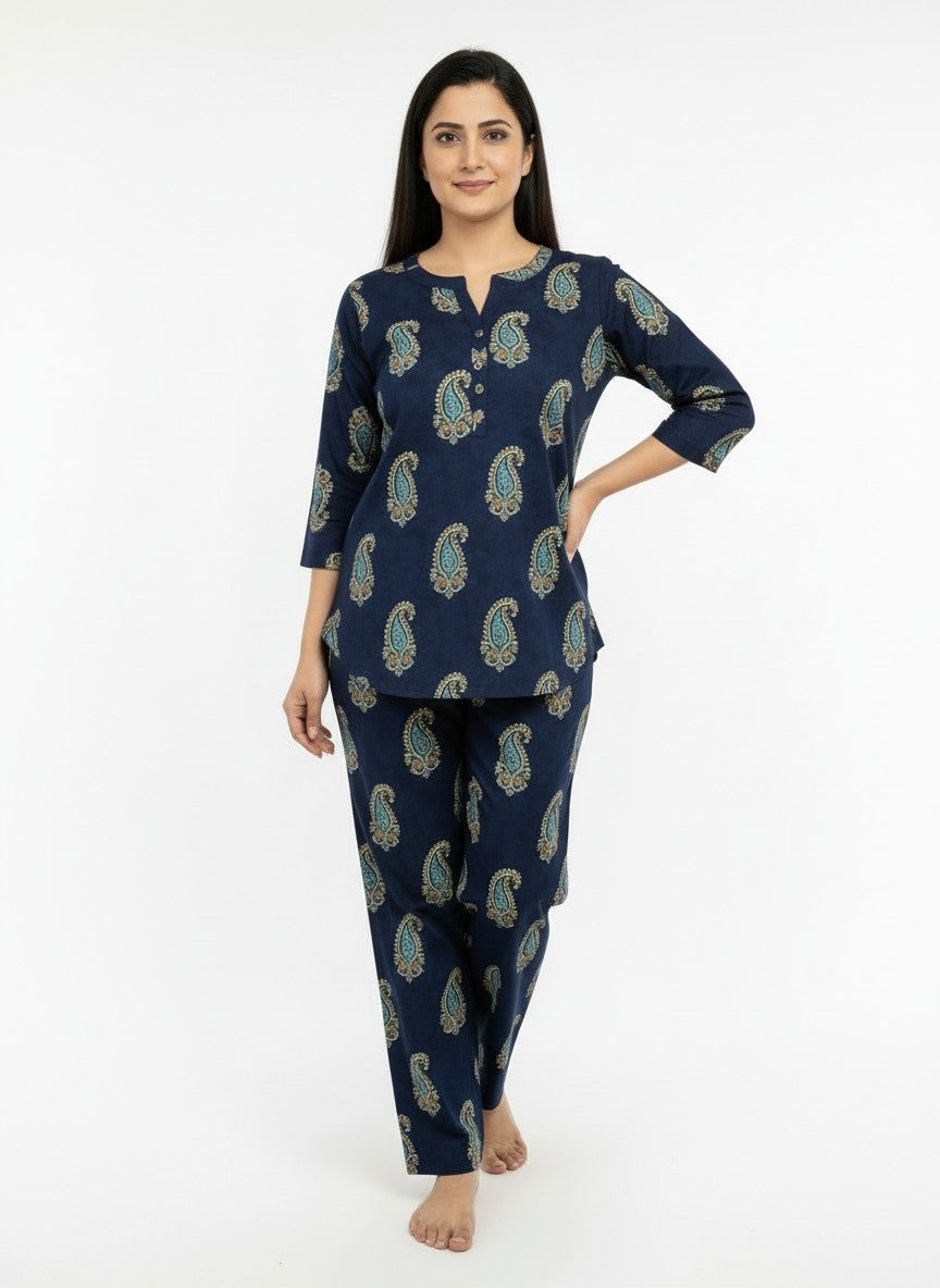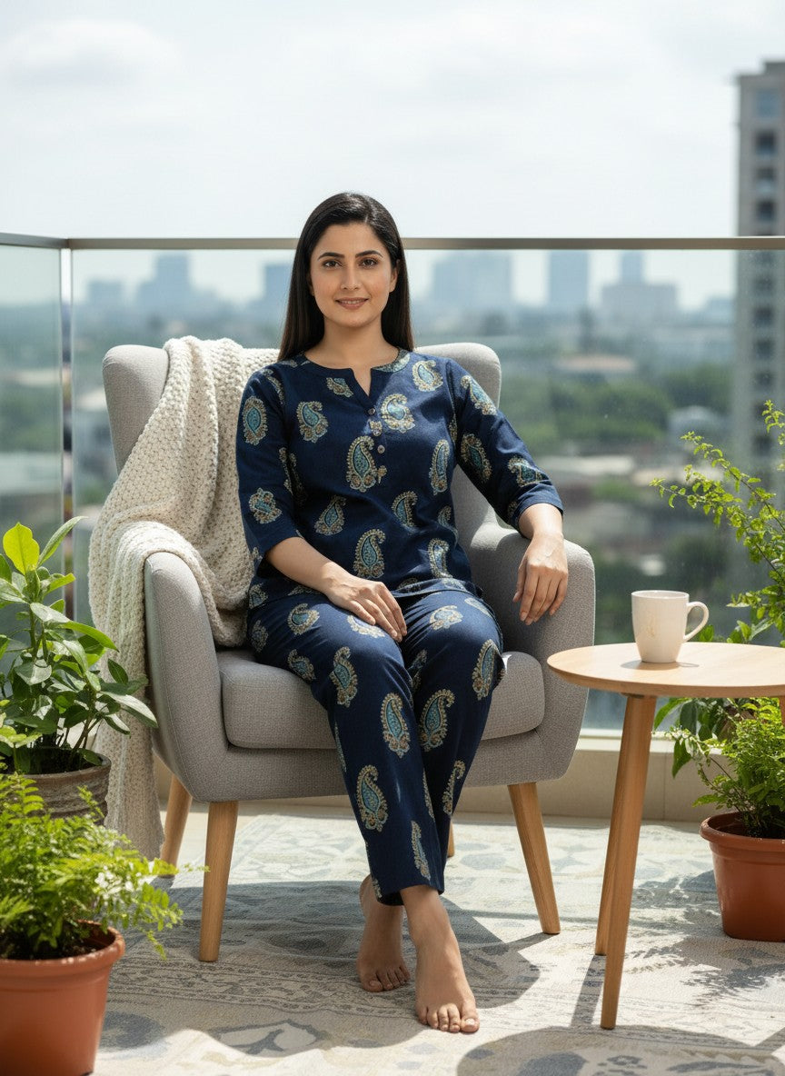 Experience the soothing comfort of this Kurti Set, crafted to enhance your relaxation and everyday ease with its soft, breathable cotton fabric ideal for all seasons. The regular fit silhouette features long sleeves, a round neckline, and button closure, adorned with an abstract pattern that brings subtle elegance to your loungewear. Made from lightweight cotton, this non-stretchable piece offers natural breathability and easy care with machine wash cold instructions, making it a perfect choice for home and lounging occasions.