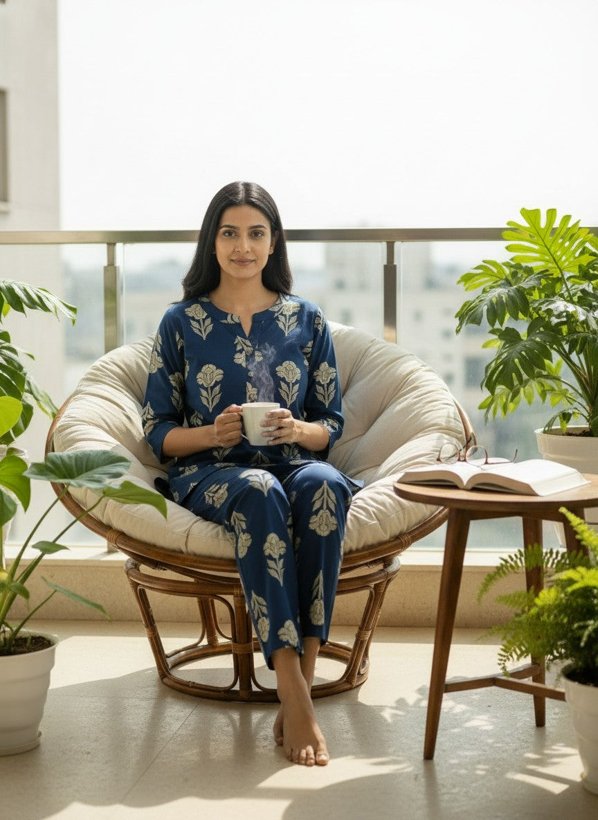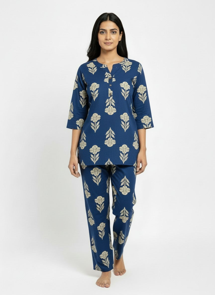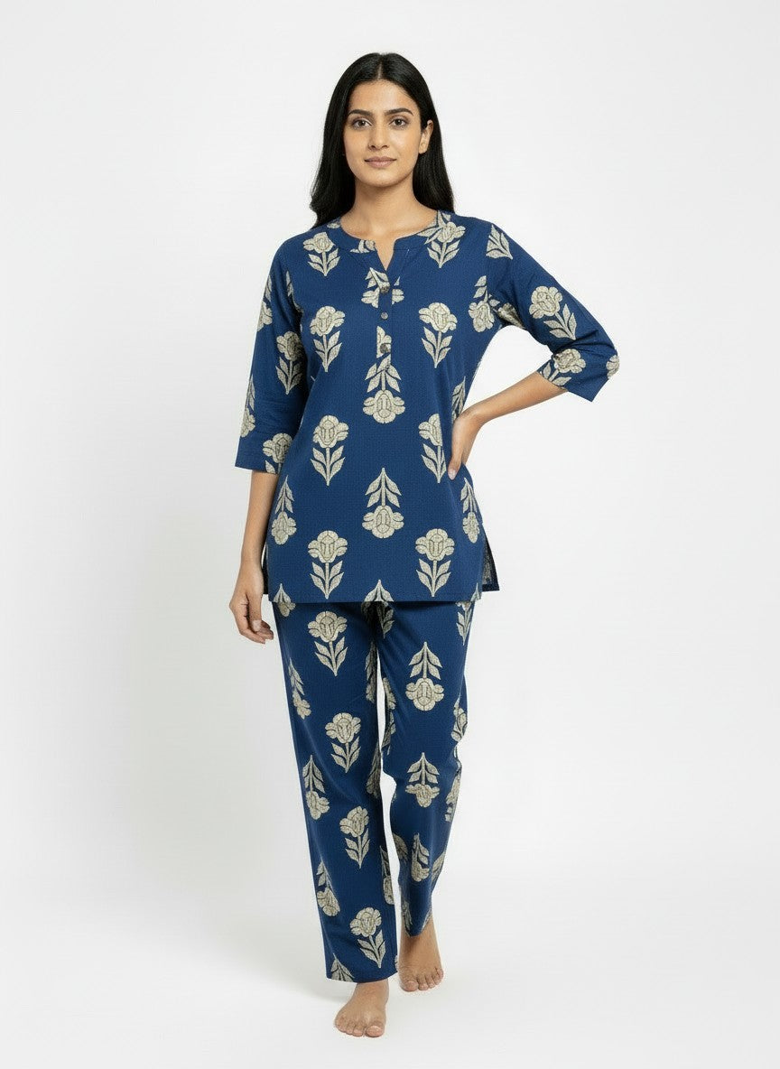Experience ultimate comfort and softness with this versatile Kurti Set, perfect for lounging and everyday wear. It features a regular fit silhouette with long sleeves, a round neckline, and button closure, adorned with an elegant floral pattern. Made from breathable, lightweight cotton, this outfit is suitable for all seasons and requires machine wash cold for easy care. Ideal for those seeking a stylish yet comfortable home and lounge outfit.