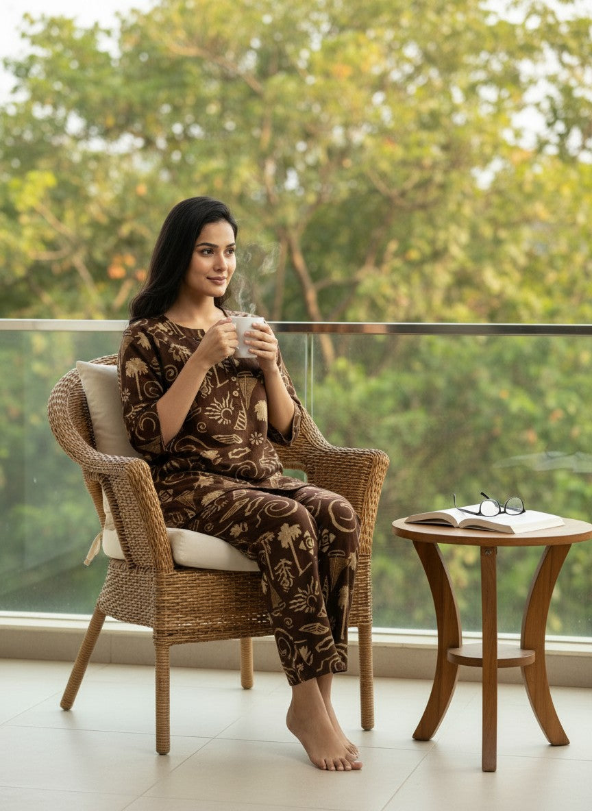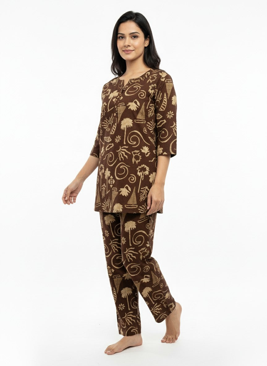 Experience ultimate comfort and tranquility at home with this relaxed fit kurti set designed for everyday lounging. It features long sleeves, a round neck, and button closure, adorned with an abstract pattern that adds subtle elegance. Crafted from lightweight cotton, this breathable fabric ensures comfort across all seasons with its non-stretchable feel. Designed for easy care with machine wash cold instructions, this kurti set is perfect for those seeking soft, durable loungewear that blends style and practicality.