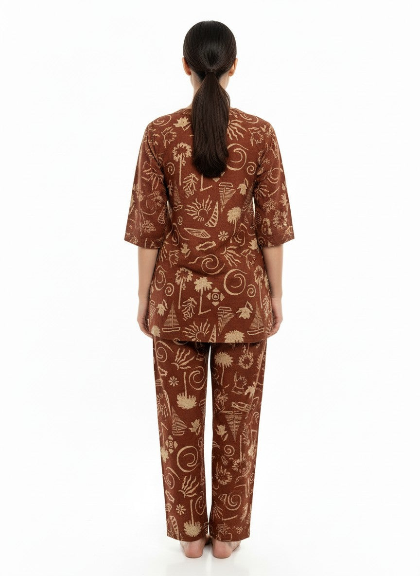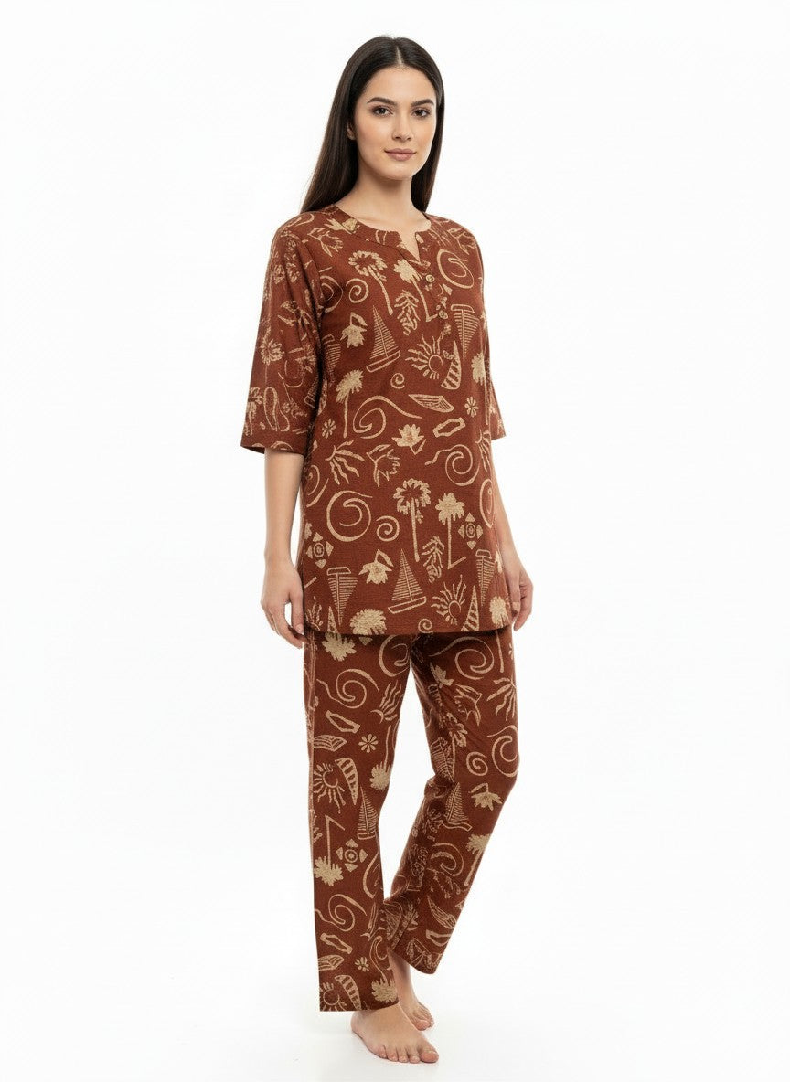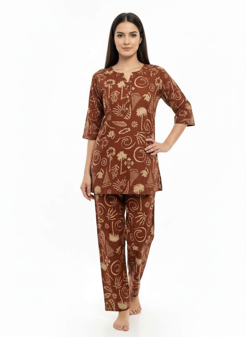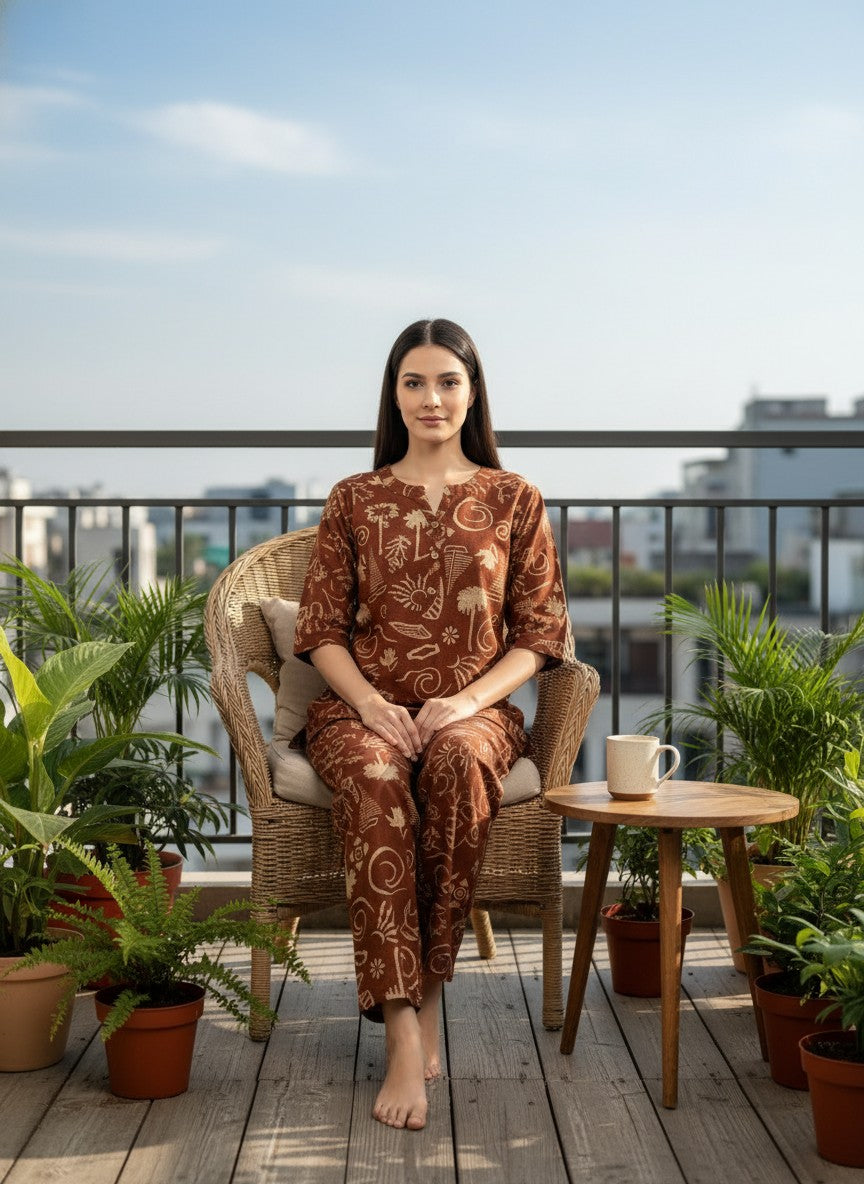 Experience the soothing comfort of this lightweight brown kurti set from Bhx-Eo, perfect for relaxing at home or casual everyday wear. Designed in a regular fit silhouette with long sleeves, a round neck, and button closure, it features an abstract pattern that adds a touch of charm. Crafted from breathable cotton fabric, it ensures all-season comfort with non-stretchable durability. Easy to maintain with machine wash cold instructions, this kurti set combines style and convenience for your loungewear collection.
