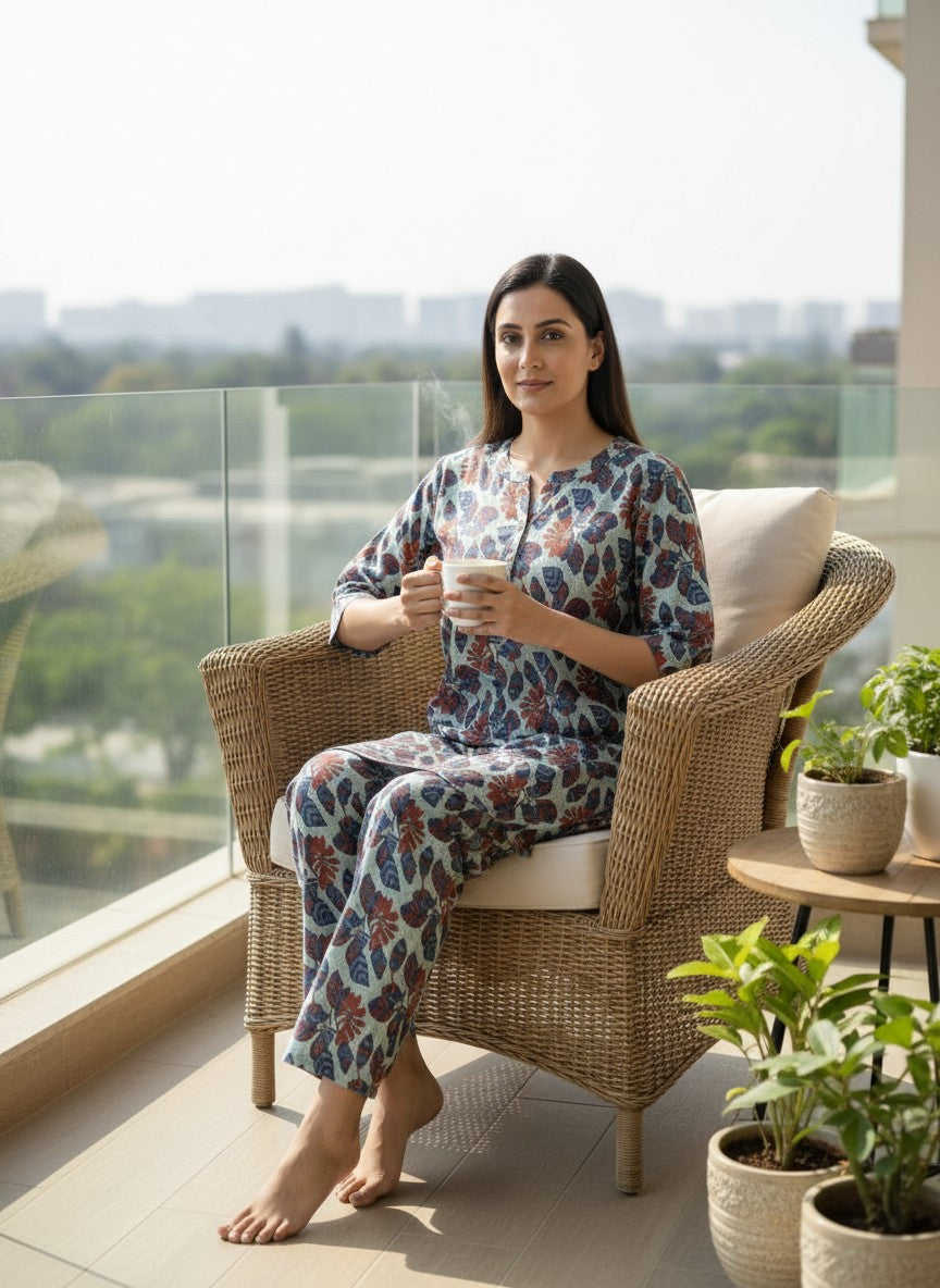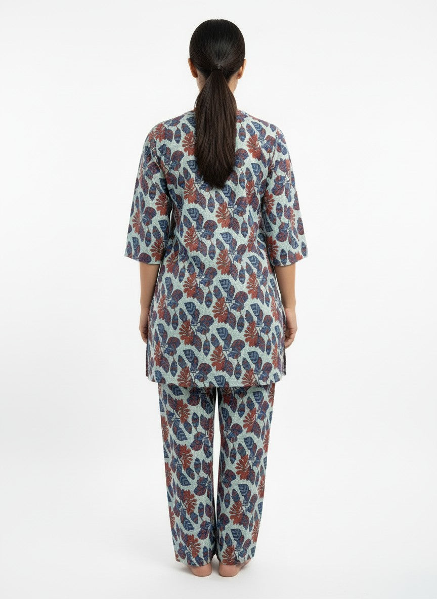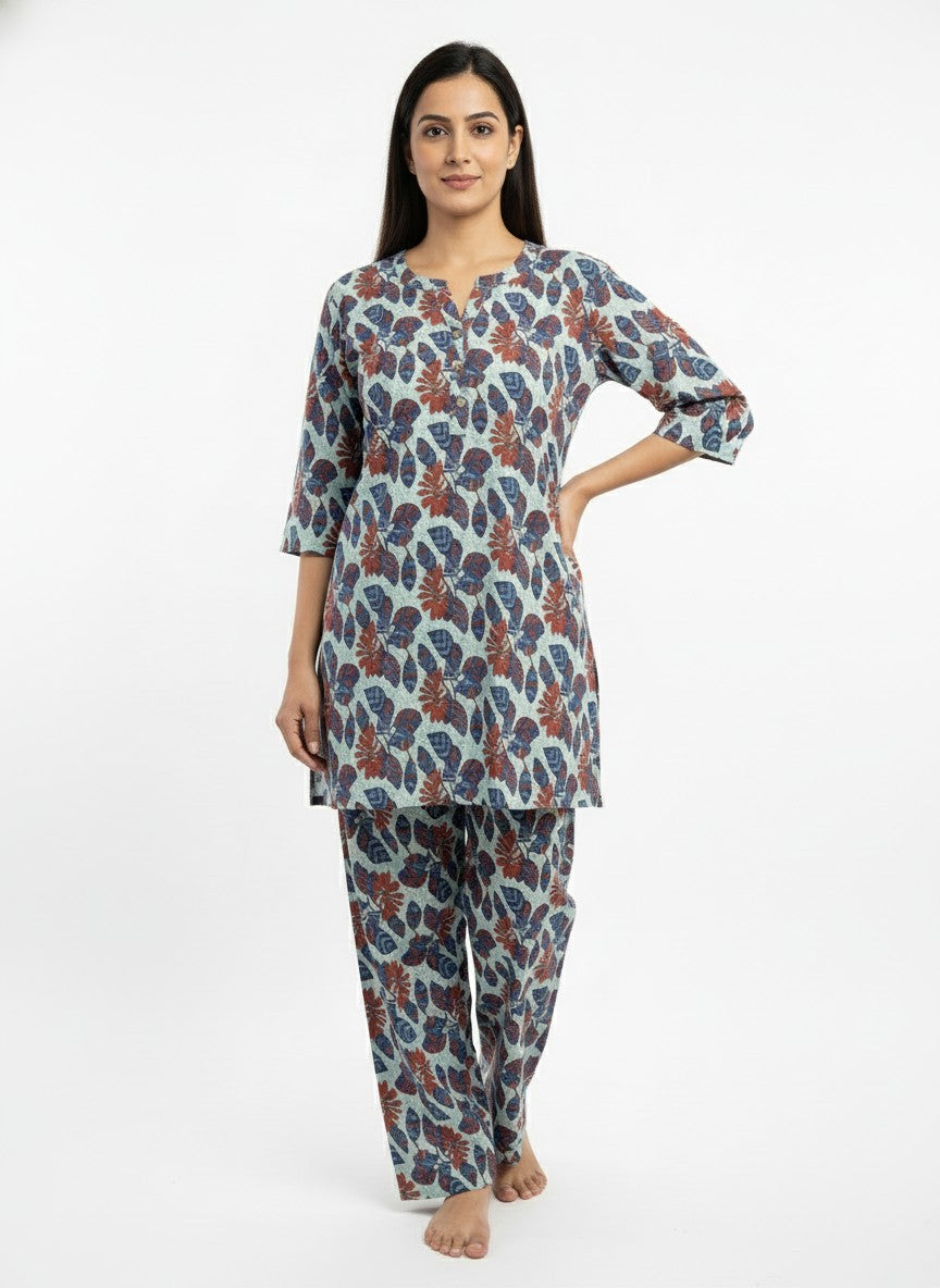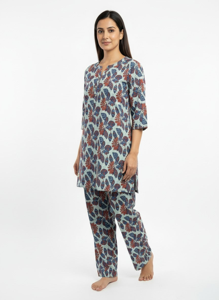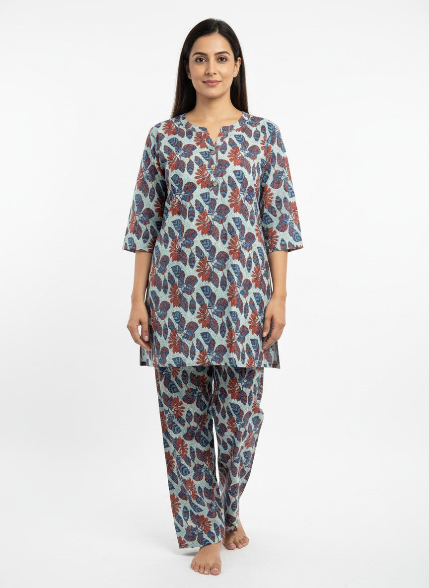 Experience the gentle comfort of this BHX-EO Kurti Set designed for relaxing at home or casual loungewear. The regular fit silhouette features long sleeves, a round neckline, and button closure, all adorned with a subtle floral pattern that enhances its soothing aesthetic. Crafted from soft breathable cotton, this lightweight fabric offers ideal comfort for all seasons without stretch. Easy to care for with machine wash cold instructions, this set is perfect for everyday comfort and unwinding moments.
