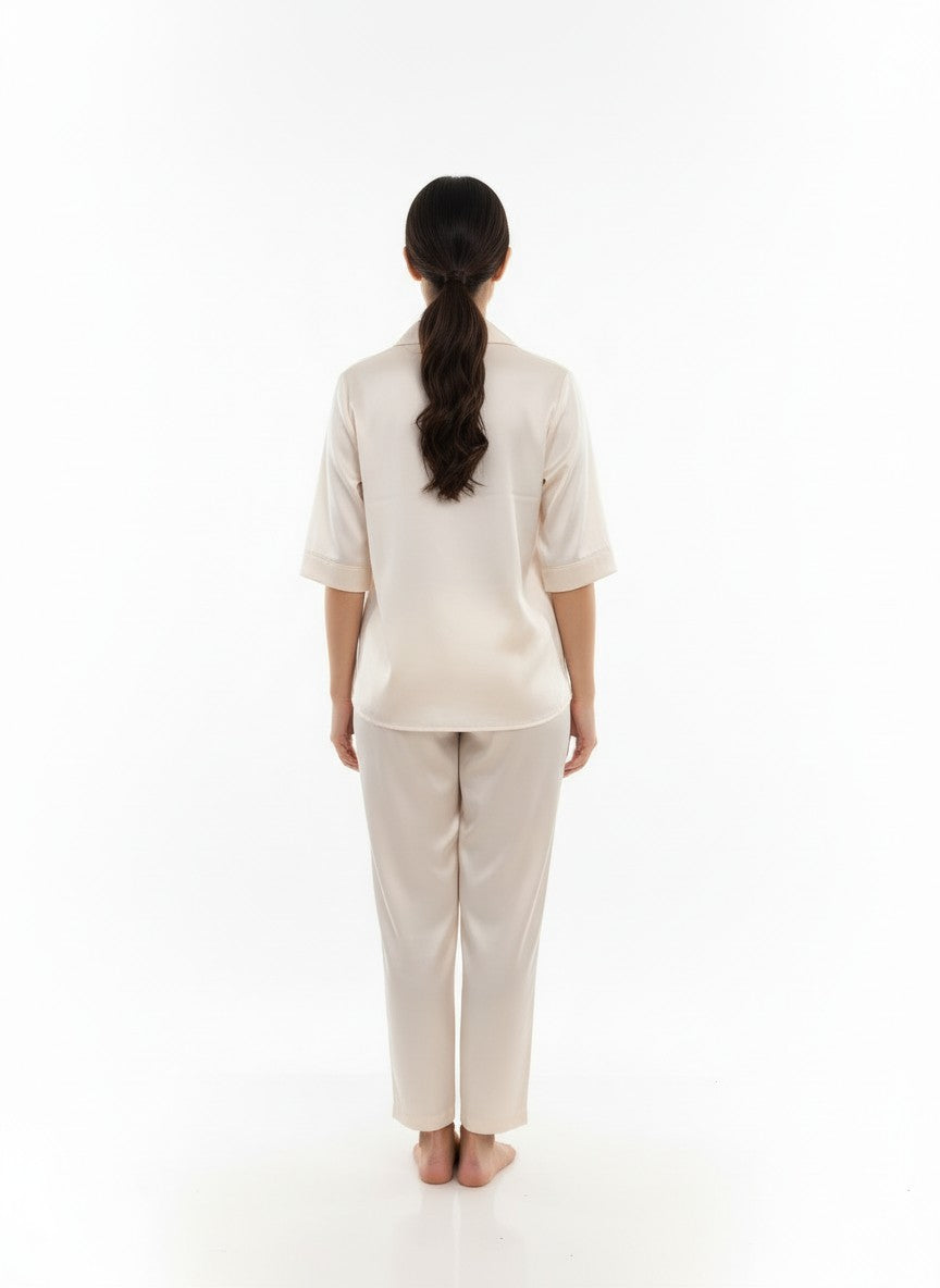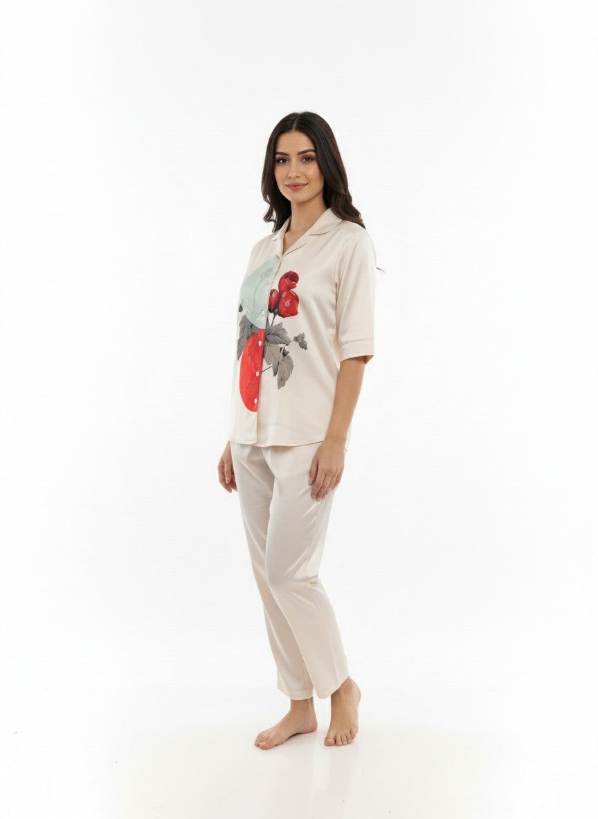 Experience ultimate comfort and relaxed elegance with this Womenstyle pyjama set, featuring a regular fit silhouette, half sleeves, collar neck, and button closure, all adorned with a charming floral pattern. Crafted from Italian satin fabric, it offers a medium weight, non-stretchable feel that is breathable and suitable for all seasons. Designed for effortless care with machine wash cold instructions, this luxe lounge set is perfect for lounging, sleep, or everyday comfort.