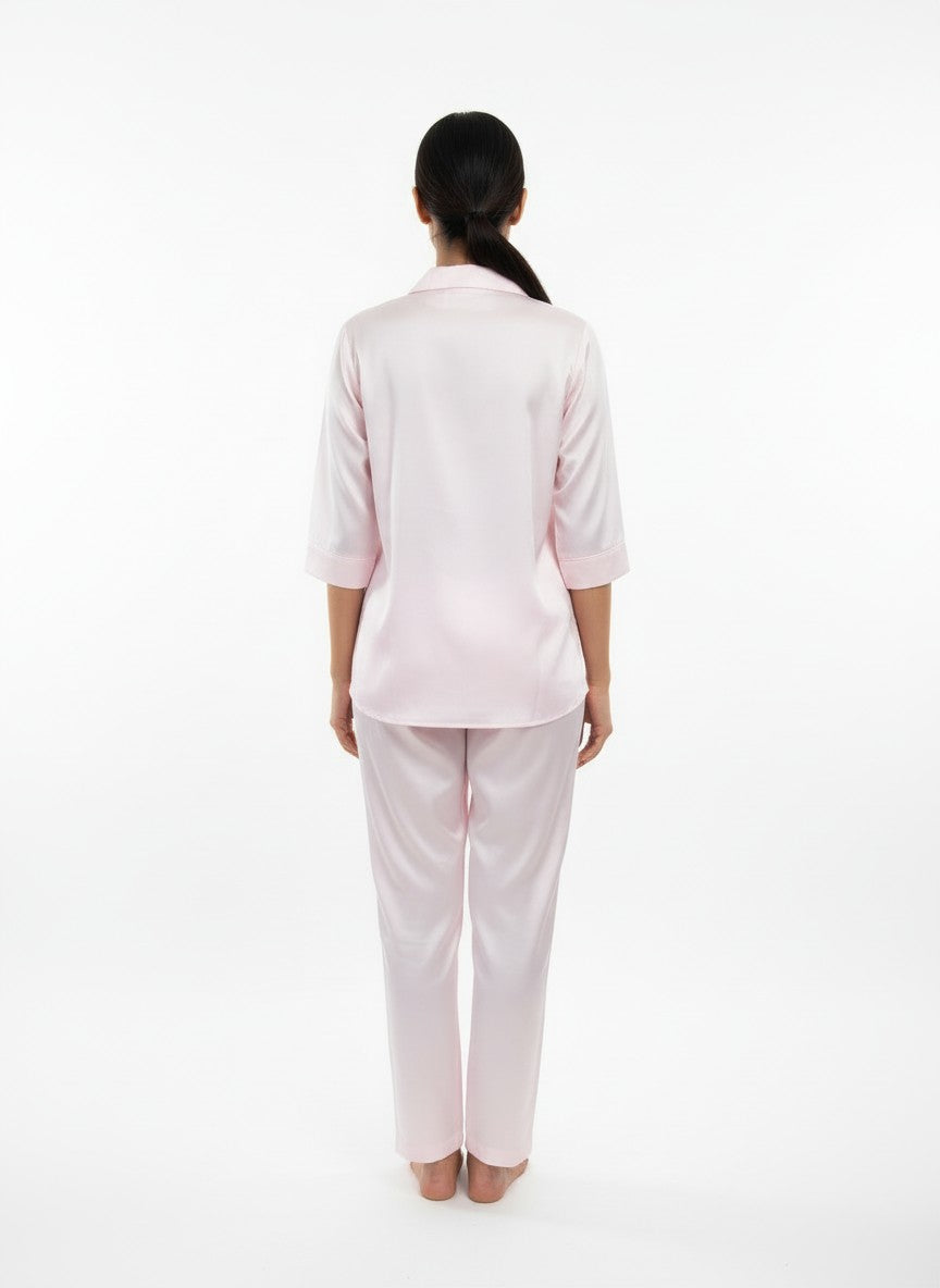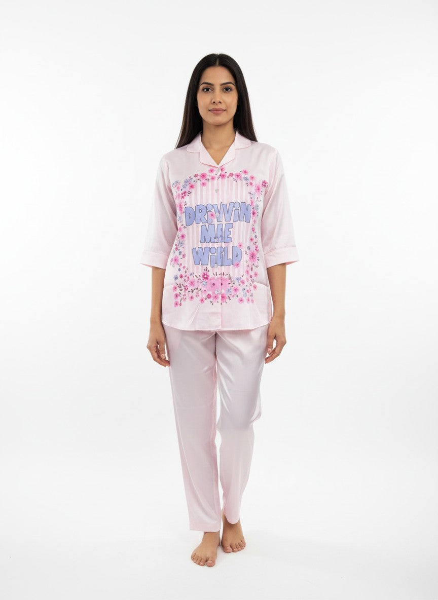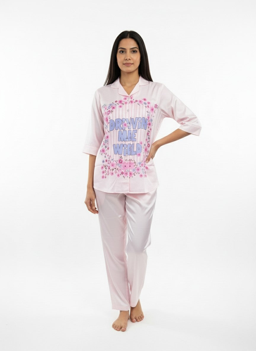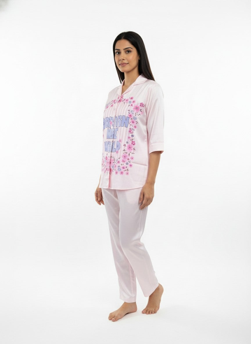 Experience ultimate comfort and a soothing mood with this luxe lounge nightwear set, crafted for all-season relaxation and sleep. The regular fit silhouette features half sleeves, a collar neck, and button closure adorned with a charming floral pattern, offering both style and ease. Made from lightweight Italian satin, this garment provides breathable, non-stretchable performance perfect for year-round wear. Easy to care for with machine wash cold, it's an ideal choice for lounging and everyday comfort.