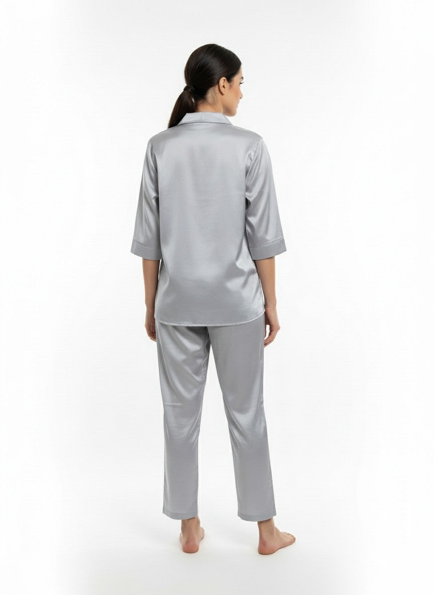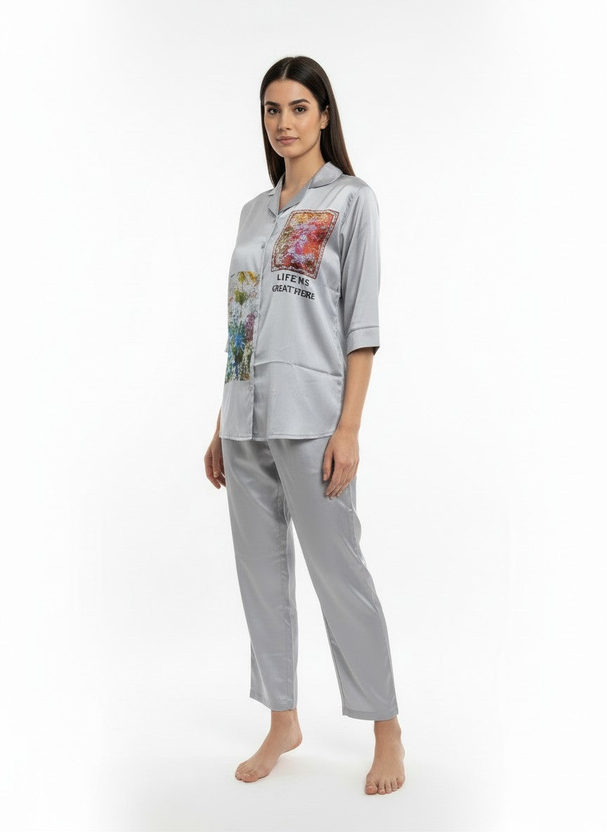 Experience ultimate comfort and relaxed elegance with this Luxe Lounge Pyjama Set, designed to envelop you in softness and ideal for all seasons. Crafted with a regular fit silhouette featuring half sleeves, a collar neck, and button closure, it showcases a subtle graphic print that adds visual interest. Made from Italian Satin, this medium weight, non-stretchable fabric ensures breathability and comfort, complemented by easy care with machine wash cold instructions. Perfect for lounging or peaceful sleep, this set combines style and practicality seamlessly.