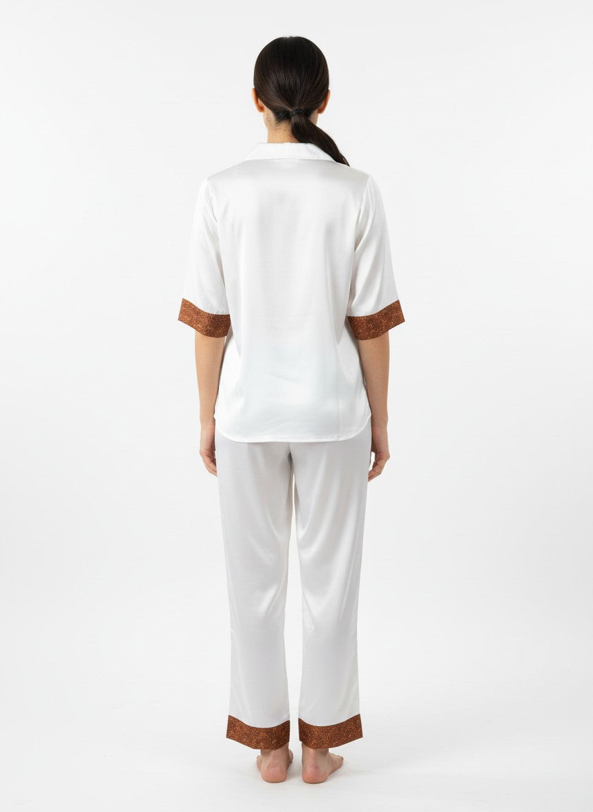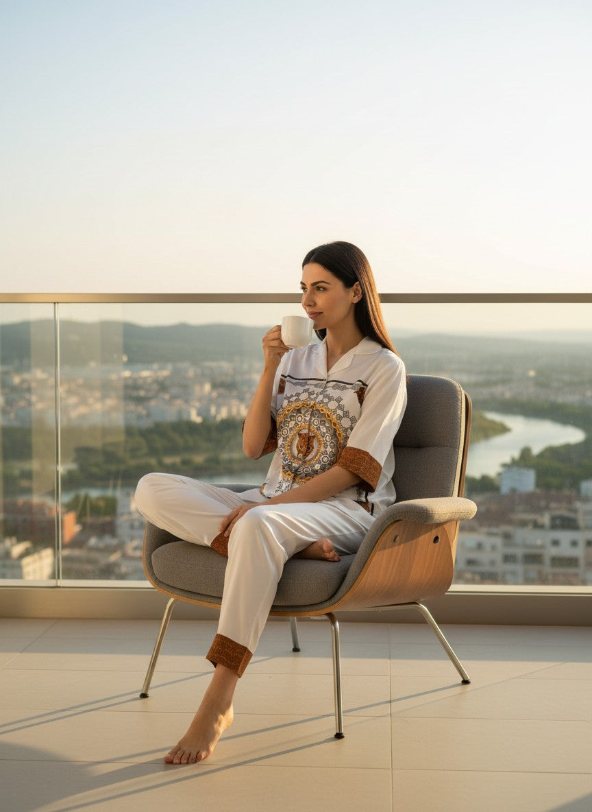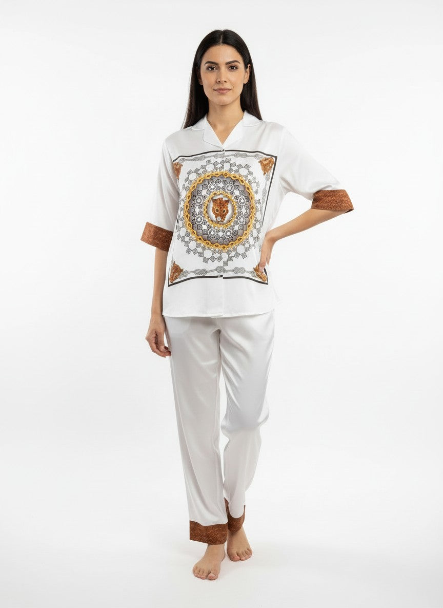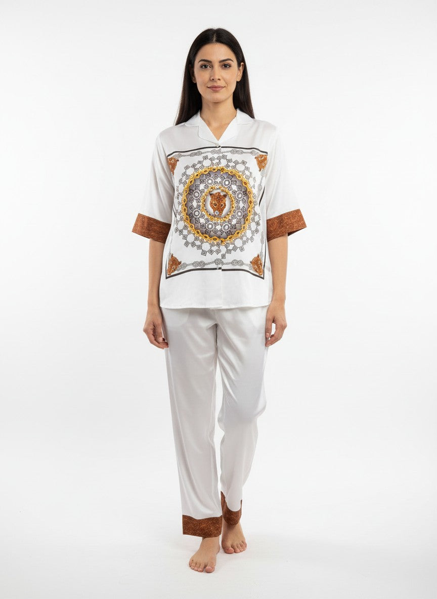 Experience serene comfort with this Womenstyle nightwear set, designed for relaxed lounging and restful sleep. The regular fit silhouette features long sleeves, a collar neck, and button closure, enriched by an abstract pattern that adds a touch of elegance. Made from lightweight Italian satin, this stretchable fabric ensures breathability and all-season suitability. Easy to care for with machine wash cold instructions, it is perfect for everyday comfort and a luxe lounge vibe.