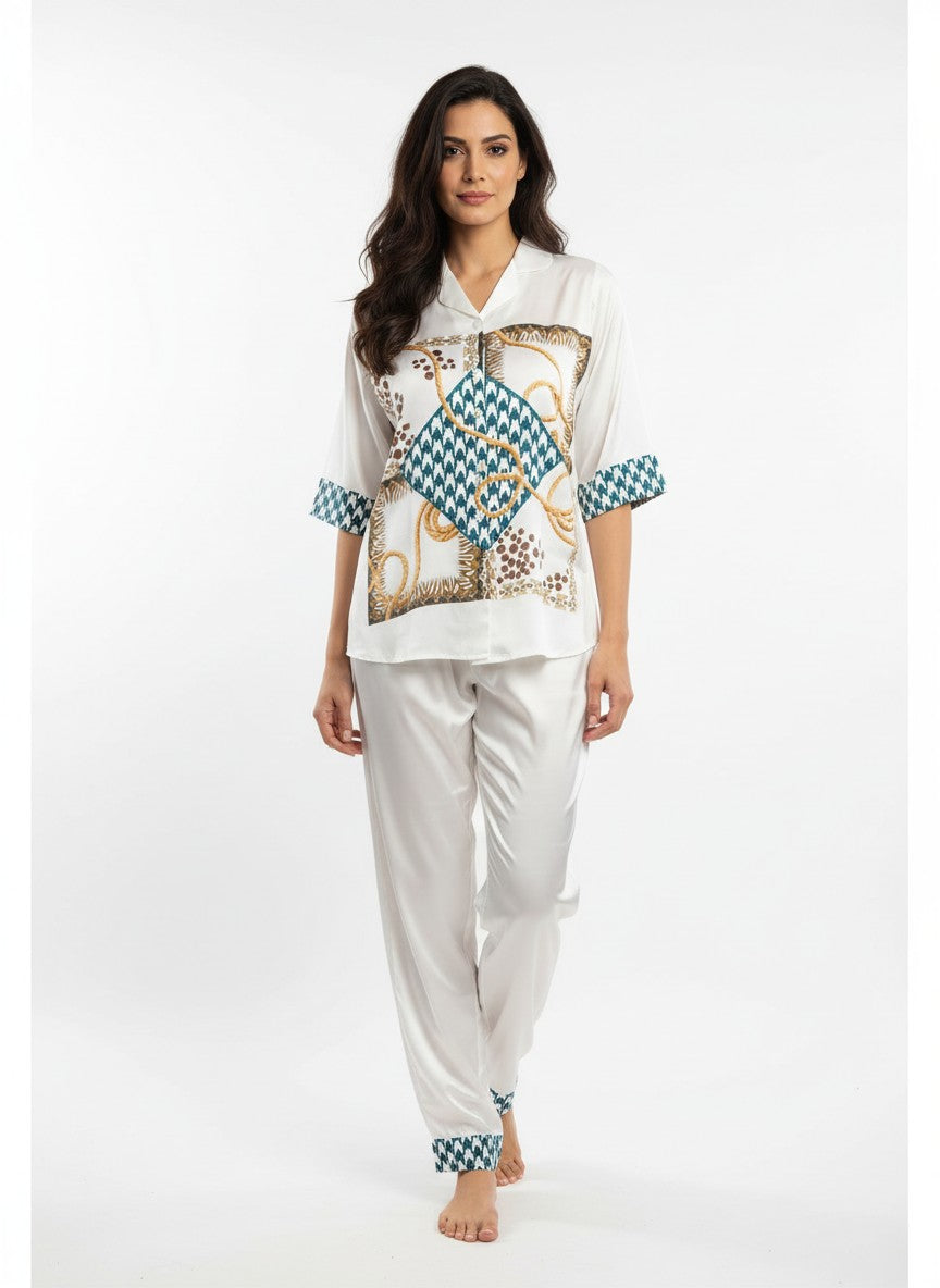 Experience luxurious comfort with this Womenstyle pyjama set, designed for a relaxed mood and ideal for lounging or sleep. The regular fit silhouette features long sleeves, a collar neck, and button closure adorned with an abstract pattern, blending style with ease. Crafted from lightweight Italian satin, this fabric offers breathability, stretchability, and year-round comfort. Easy to care for with machine wash cold instructions, this set ensures everyday elegance and comfort.