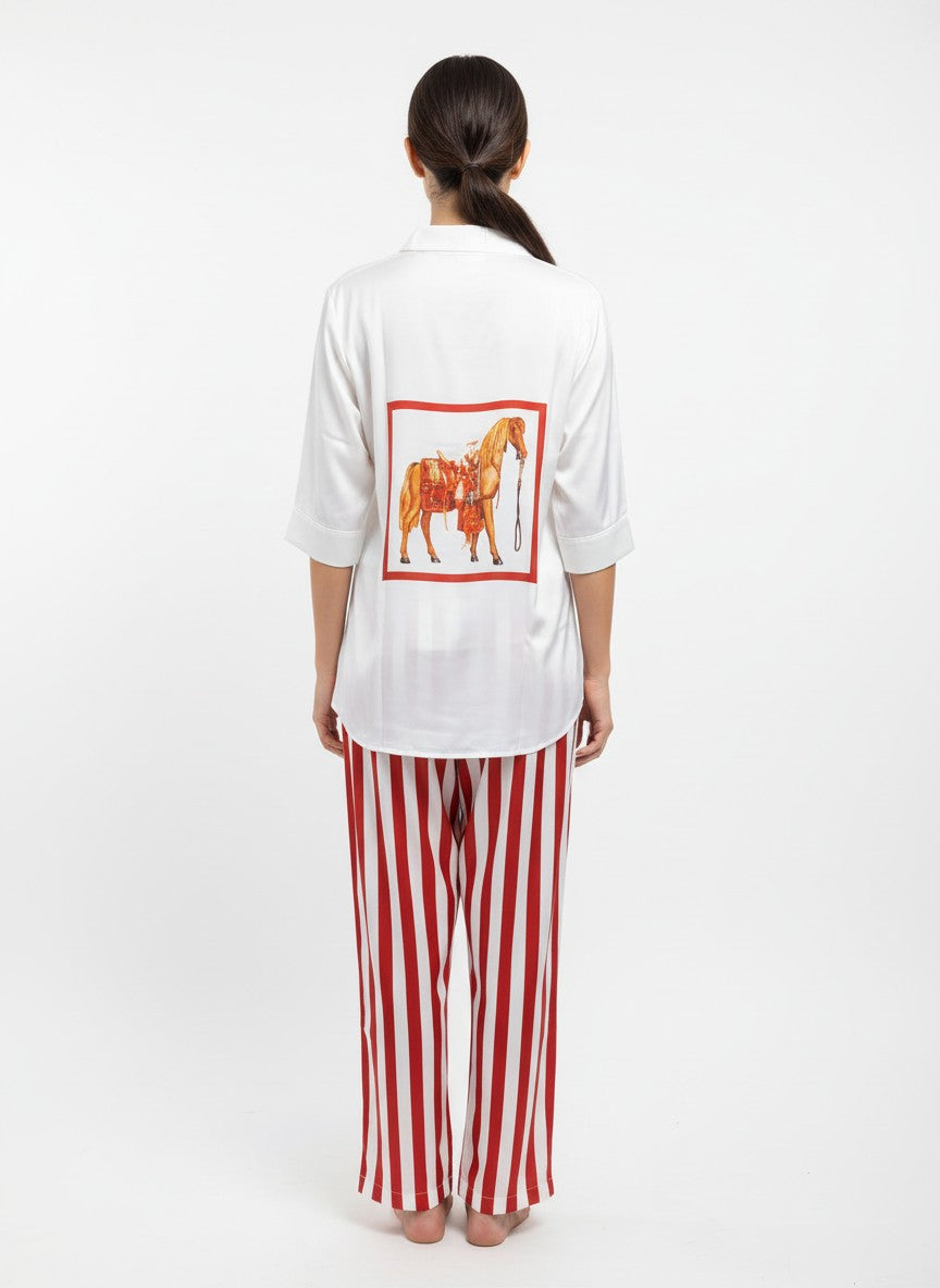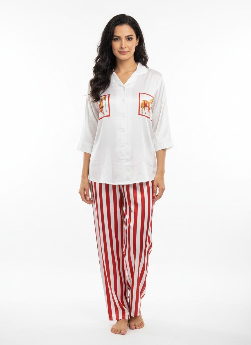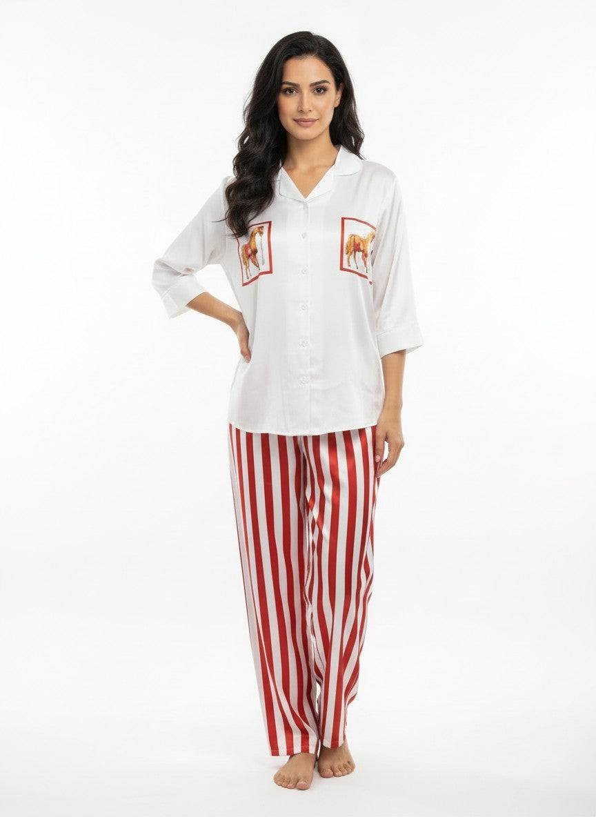 Experience ultimate comfort and luxury with this Womenstyle pyjama set, designed for relaxation and everyday ease. Featuring a regular fit silhouette, long sleeves, a collar neck, and button closure, it boasts a stylish graphic print. Crafted from Italian satin, it offers a lightweight feel, stretchability, and suitability for all seasons. Easy to care for with machine wash cold instructions, this set is perfect for lounging or sleep in refined comfort.