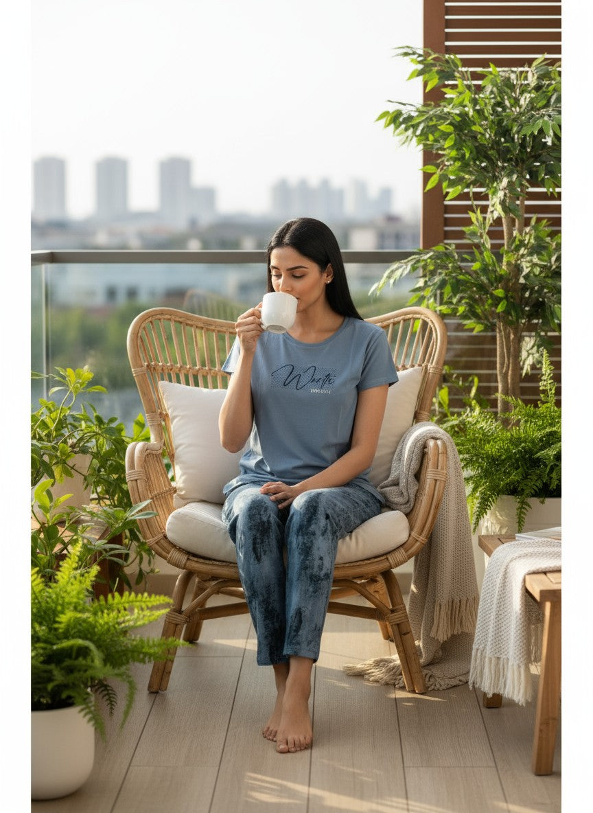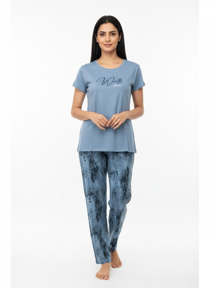 Experience everyday comfort with this SUKANYA nightwear set, designed for emotional ease and softness ideal for lounging or sleep. The Pyjama set features a regular fit silhouette with half sleeves and a round neck pullover style finished in an abstract pattern. Crafted from hosiery fabric, it offers lightweight breathability with stretch suitable for all seasons. Easy to care for with machine wash cold instructions, it is perfect for relaxing moments at home.