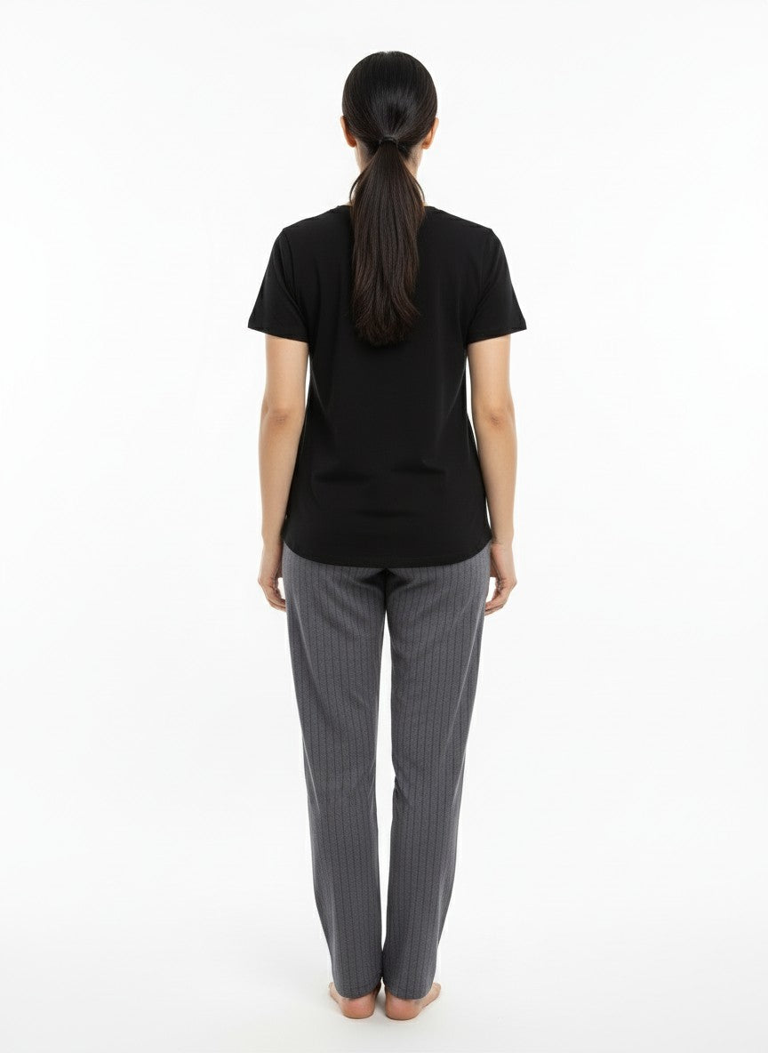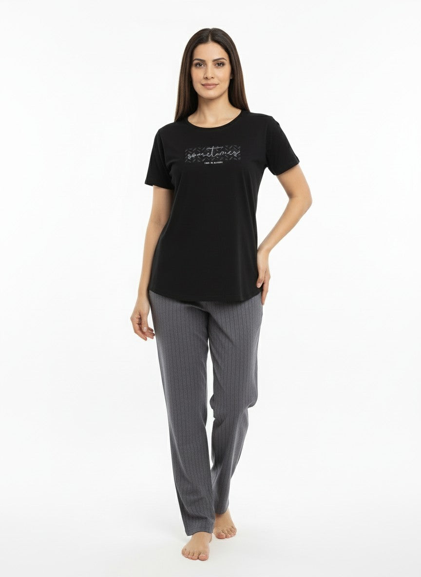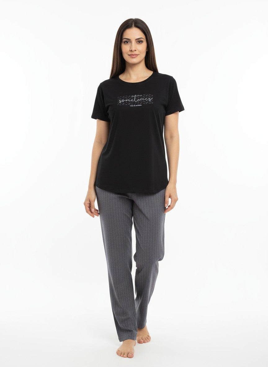 Experience everyday comfort with this Sukanya pyjama set designed in a regular fit silhouette featuring half sleeves, a round neckline, and a pullover closure enhanced by a graphic print. Crafted from lightweight, breathable hosiery fabric that is stretchable and suitable for all seasons, it promises softness and ease throughout your lounging or sleeping hours. Easy to care for with machine wash cold instructions, this set is perfect for relaxed comfort anytime.