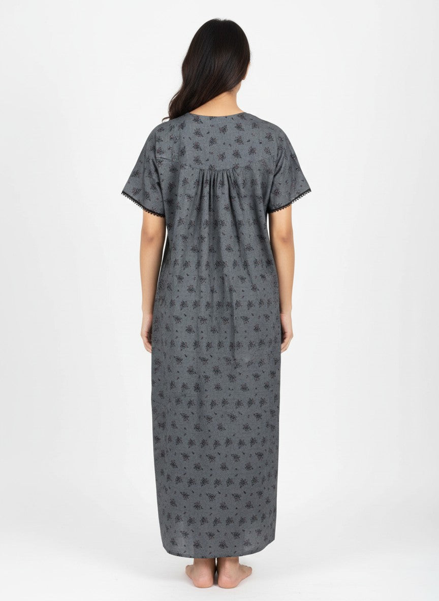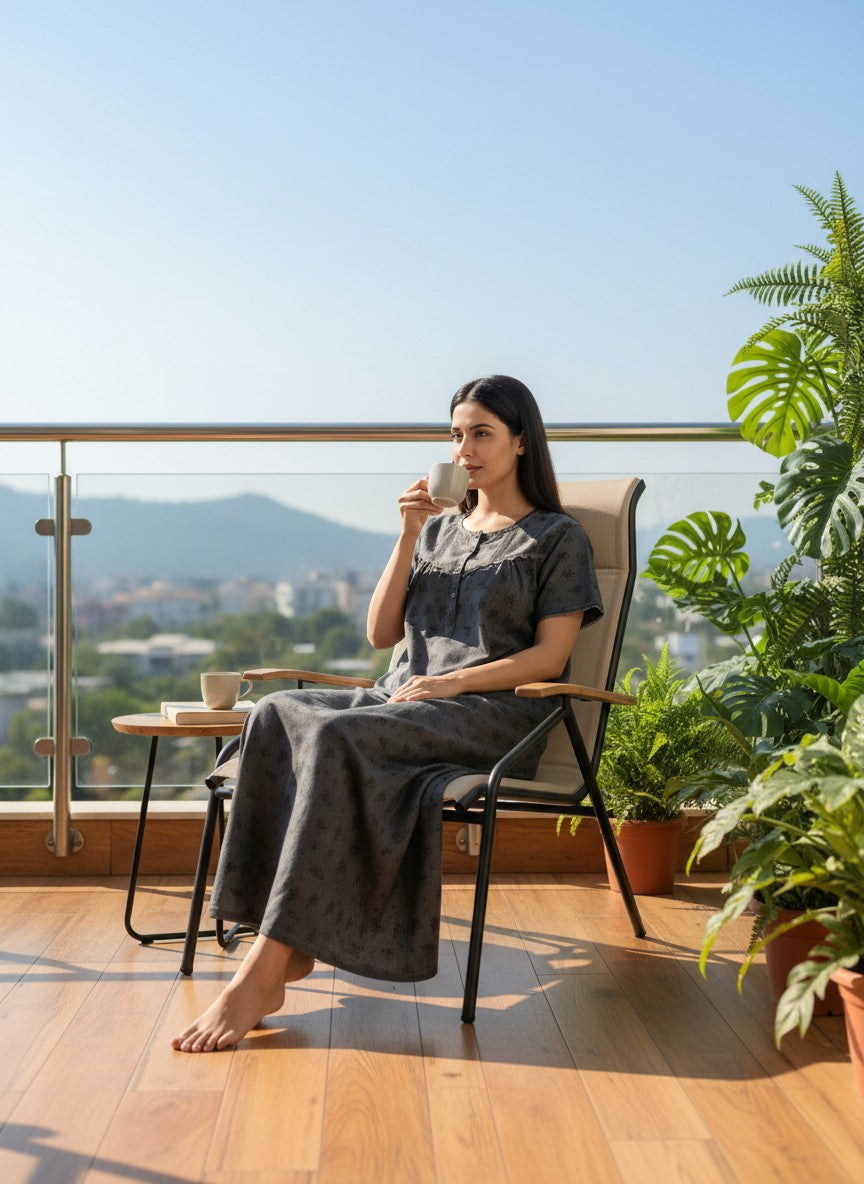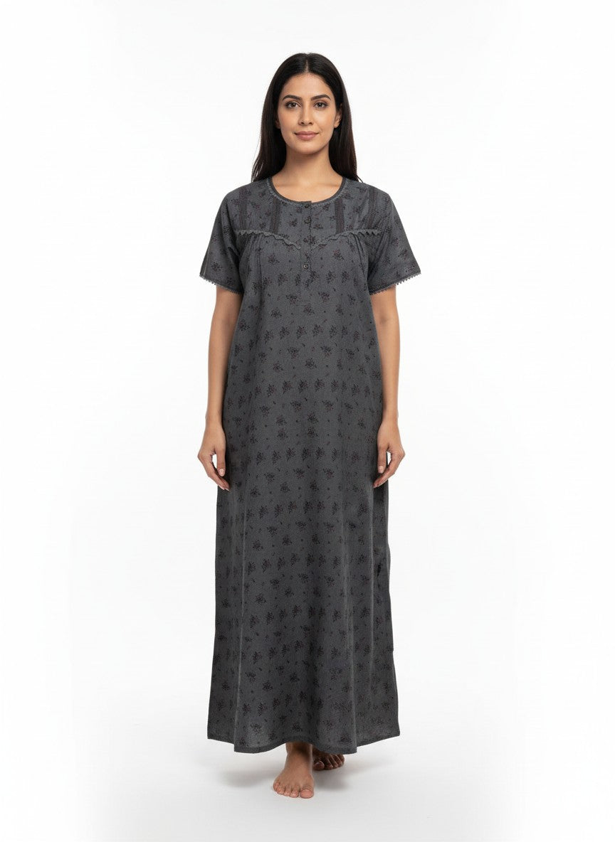 Experience everyday comfort with this relaxed fit nighty that offers a soothing softness ideal for lounging or sleep. Featuring a floral pattern, half sleeves, round neckline, and button closure, it combines style and ease effortlessly. Made from lightweight breathable Tenceldenim fabric with stretchability, it suits all seasons while ensuring comfort throughout. Easy to care for with machine wash cold instructions, it's a perfect addition to your nightwear collection.