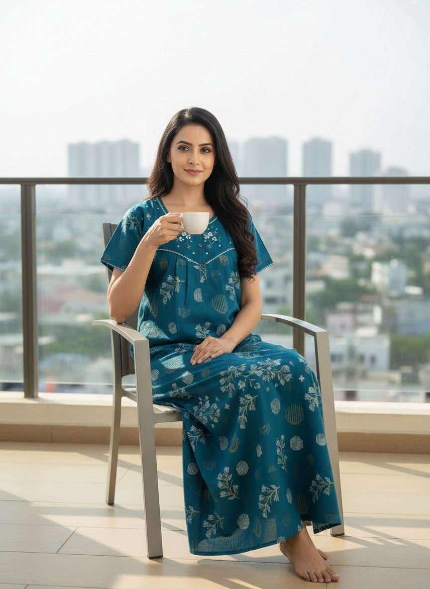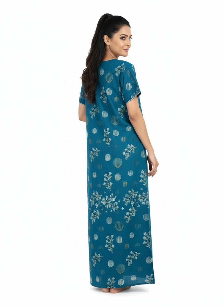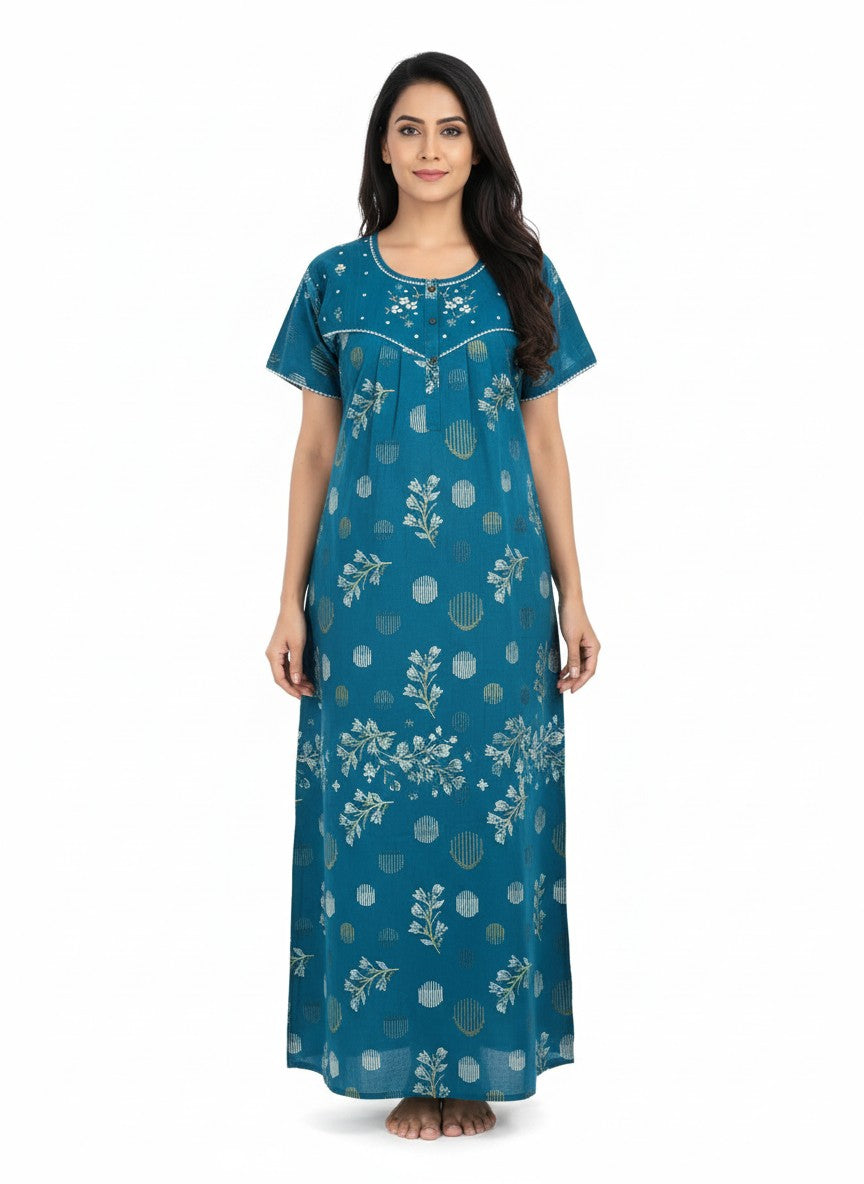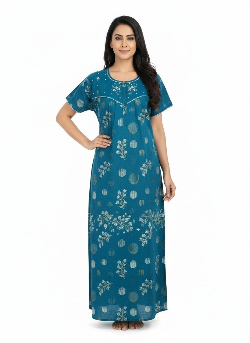 Experience everyday comfort with this BHX-EO nighty designed for emotional ease and softness during lounging or sleep. The regular fit silhouette features half sleeves, a round neck, and a slip-on closure adorned with a floral pattern, delivering a breezy and pleasing design. Crafted from lightweight cotton fabric, it offers breathability and stretch, suitable for all seasons. Easy care with machine wash cold makes it a practical choice for daily wear.