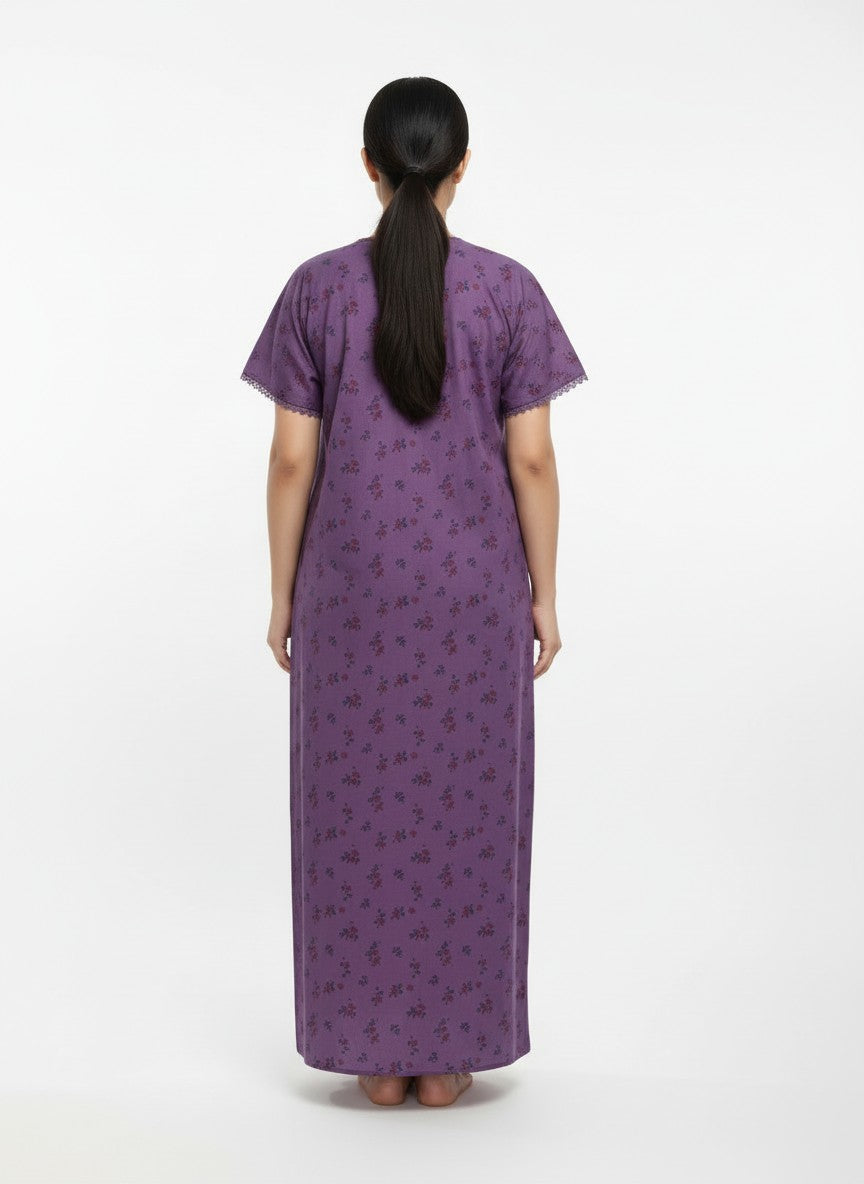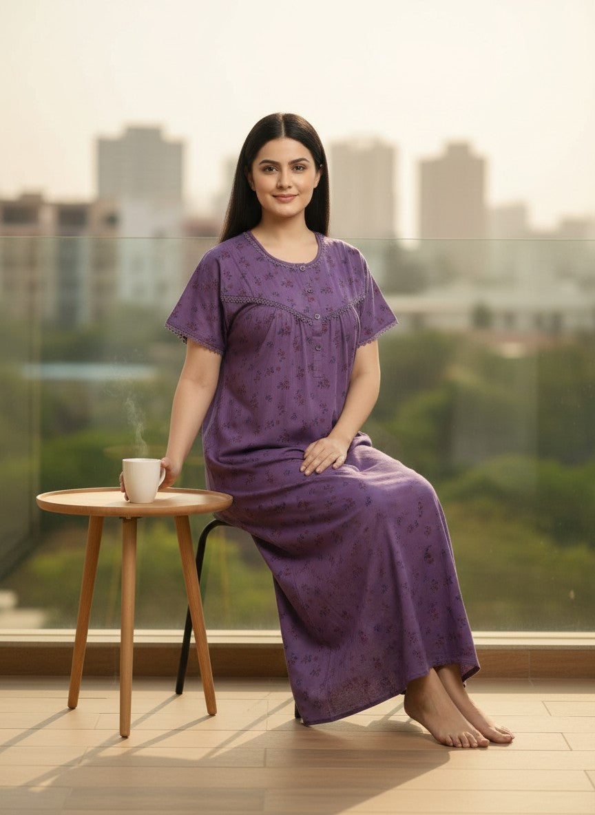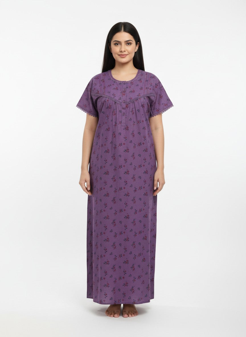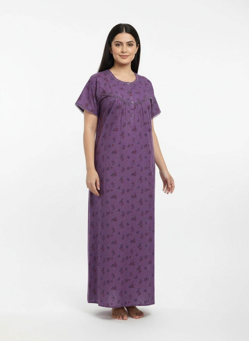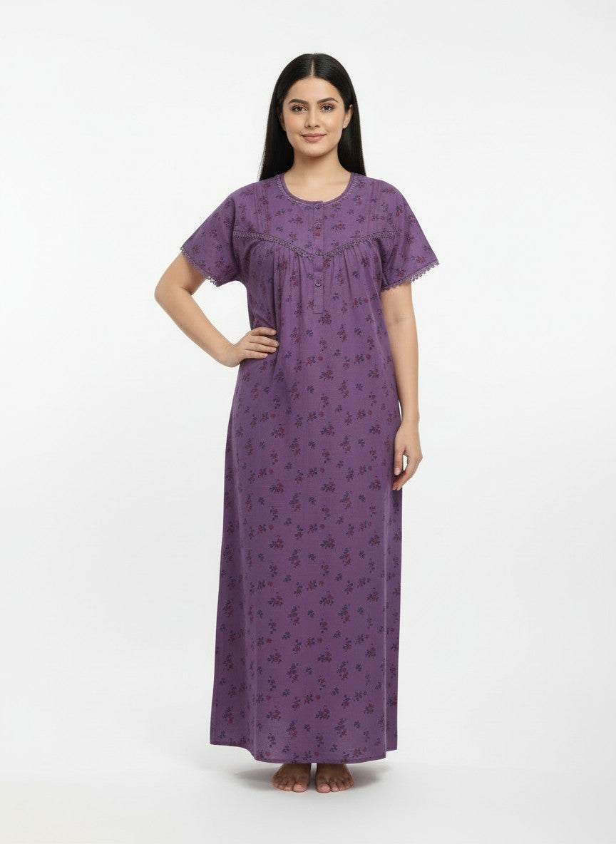 Experience everyday comfort with this BHX-EO nightdress featuring a regular fit silhouette with half sleeves, a round neckline, and slip-on closure adorned with a delicate floral pattern. Crafted from lightweight cotton, it ensures breathability and stretchability suitable for all seasons, providing a soft and soothing touch perfect for lounging or sleep. Easy care with machine wash cold makes it an ideal addition to your nighttime wardrobe.