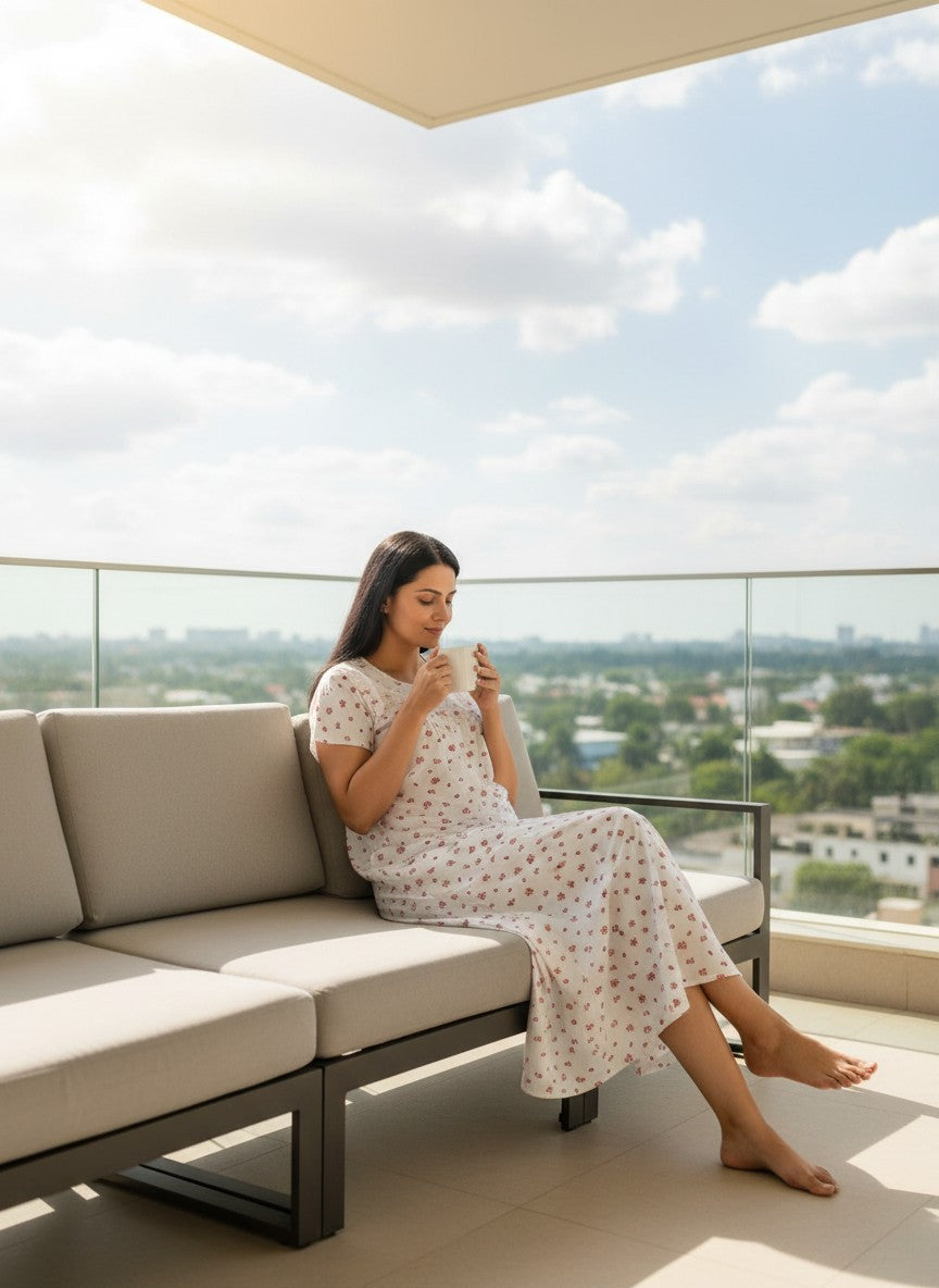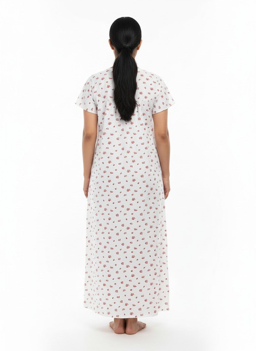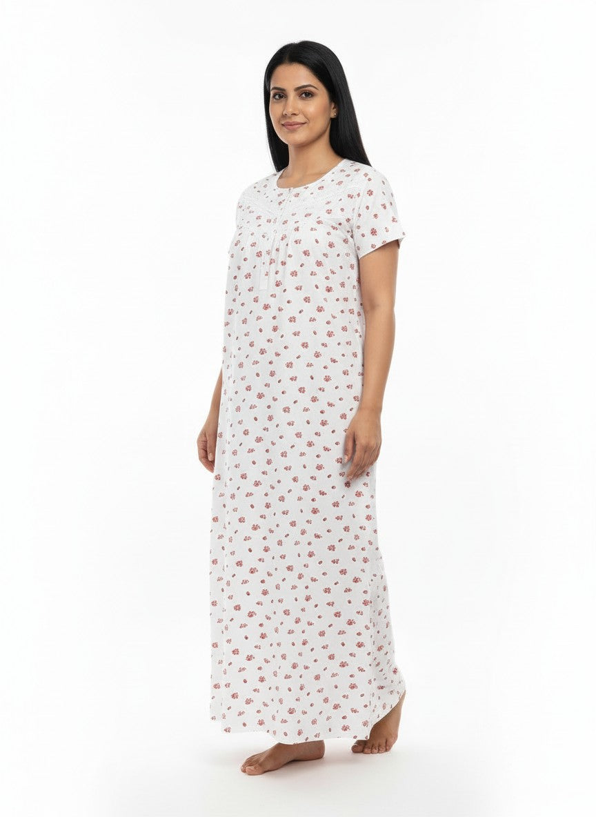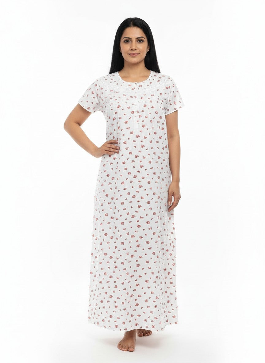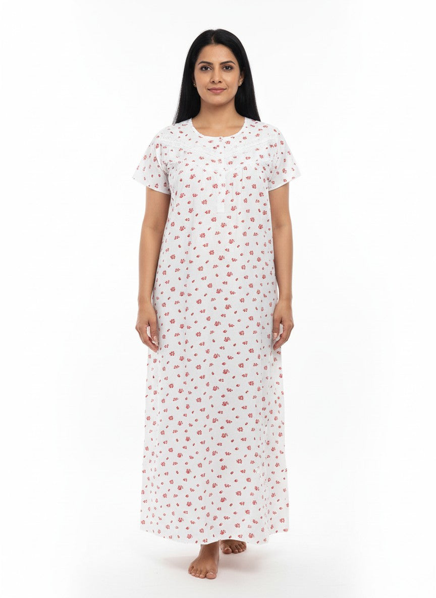 Experience everyday comfort with this BHX-EO Nighty featuring a regular fit silhouette, half sleeves, a round neckline, and a pullover closure adorned with a delicate floral pattern. Made from lightweight cotton fabric, it provides breathability and stretchability, perfect for all seasons. Easy to care for with machine wash cold, this nightdress is ideal for lounging and a restful night's sleep.