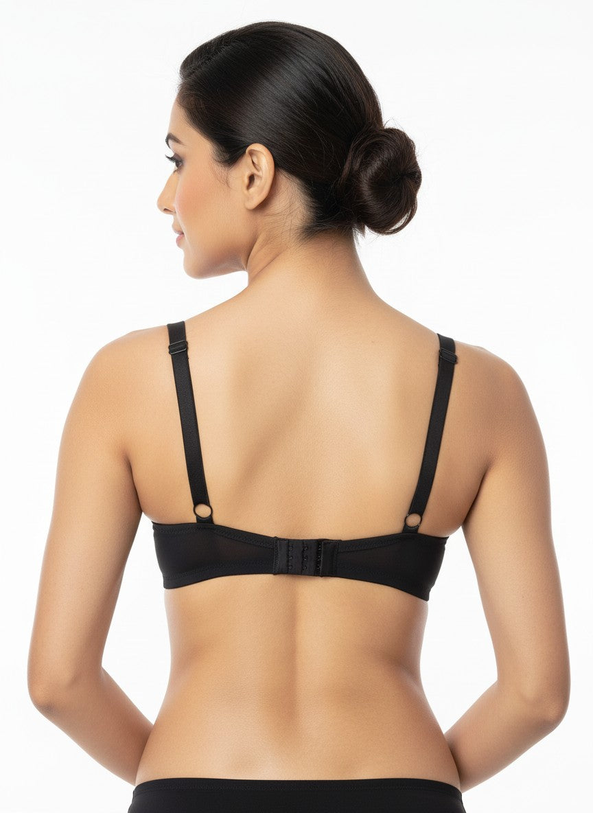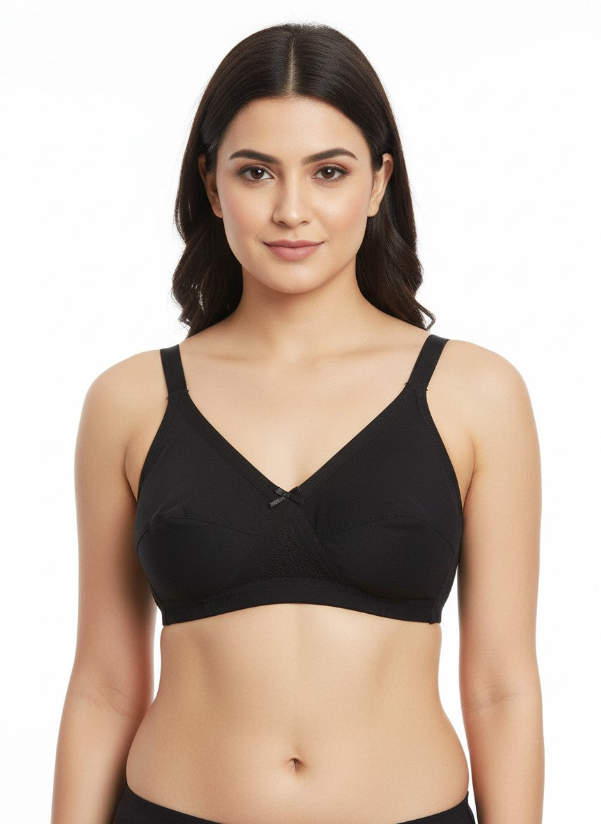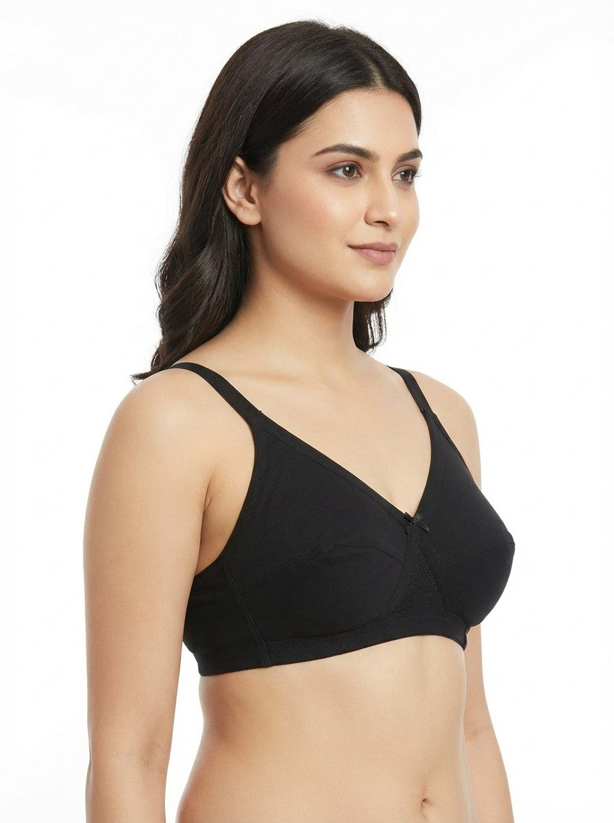 The Zivame Single Layered Non Wired Full Coverage T-Shirt Bra is designed to offer reassuring comfort and confidence for everyday wear, with full coverage cups that gently envelop the bust and a non-wired, non-padded construction that feels soft and natural against the skin. Crafted from breathable Cotton Elastane fabric, it provides a smooth, comfortable feel while allowing ease of movement, making it suitable for long hours of regular use. The straight back design, adjustable straps and secure hook-and-eye closure work together to provide a customized fit and steady support, helping the bra stay comfortably in place throughout the day. In a classic black solid pattern that slips discreetly under most outfits, this bra combines understated style with dependable comfort, and its hand wash care ensures the fabric and fit remain fresh and supportive over time.
