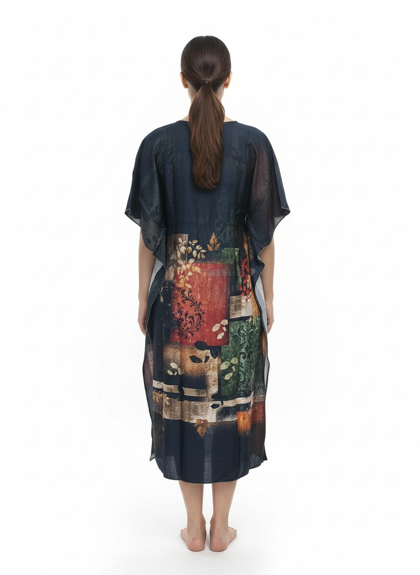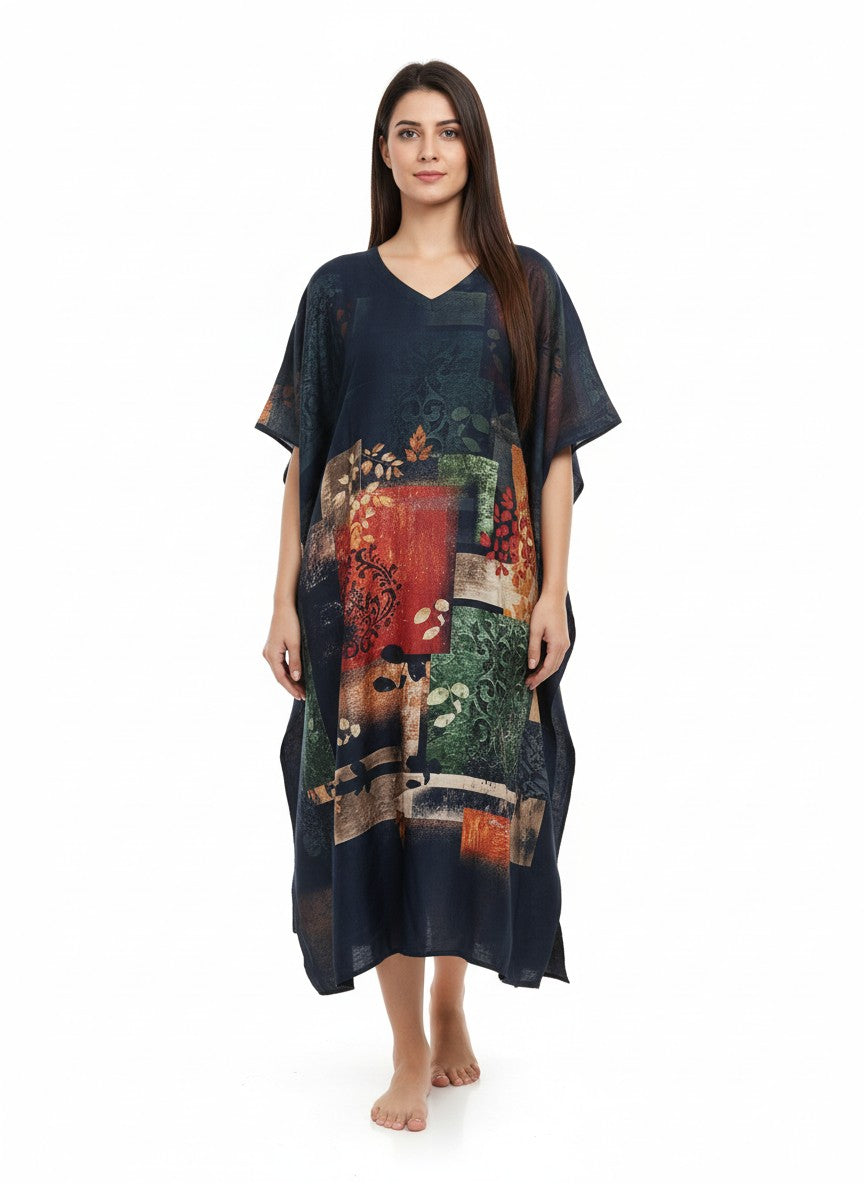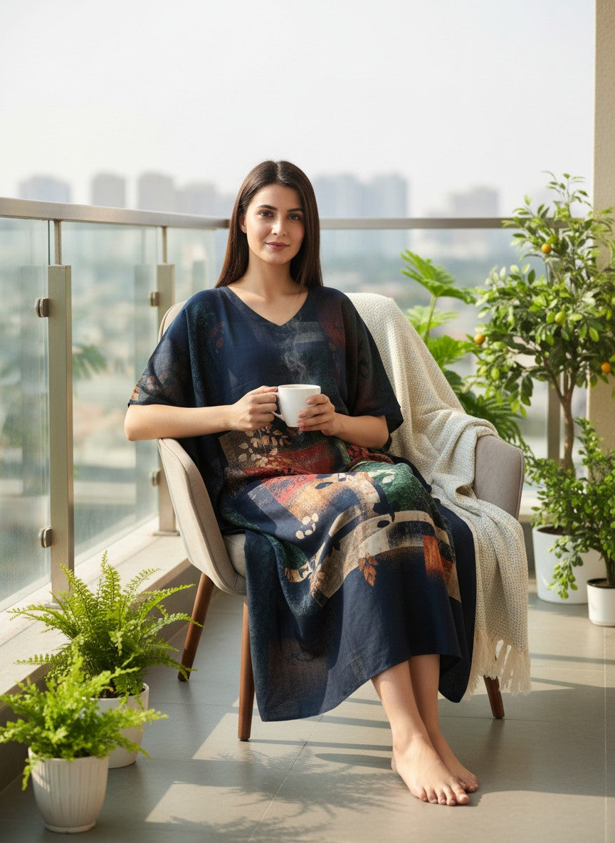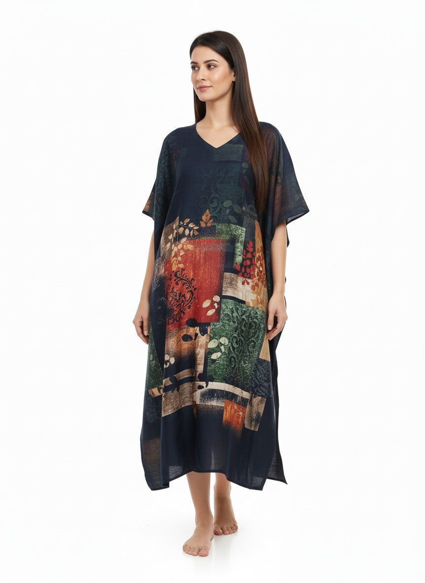 Experience ultimate comfort with this luxe lounge nightdress designed for softness and everyday wear. Featuring a loose fit silhouette with long sleeves, a flattering V-neckline, and slip-on closure, the abstract pattern adds elegant charm. Crafted from viscose fabric, it offers lightweight breathability ideal for all seasons while maintaining a non-stretchable feel. Easy care with machine wash cold instructions makes it perfect for restful nights and relaxed days.
