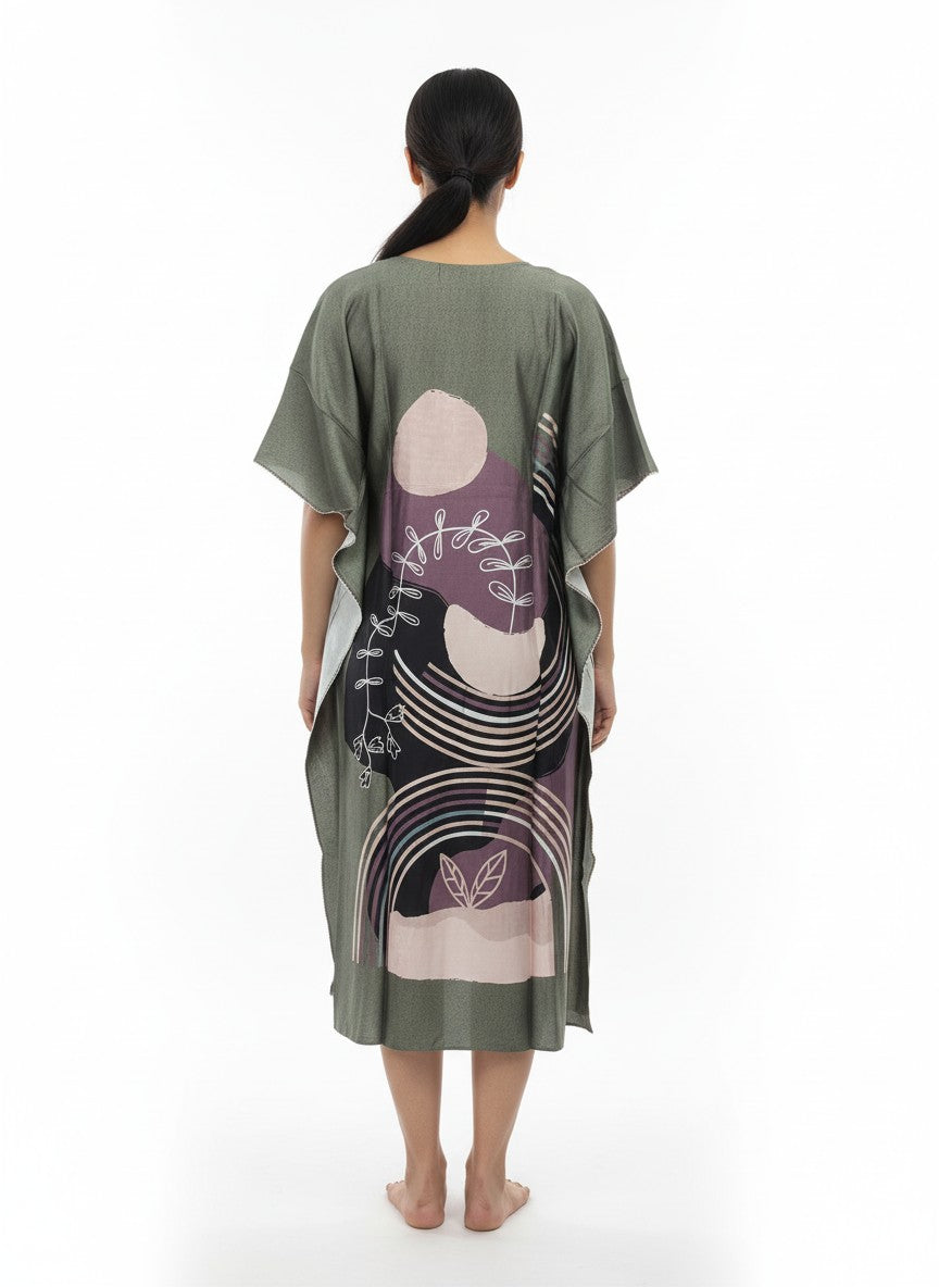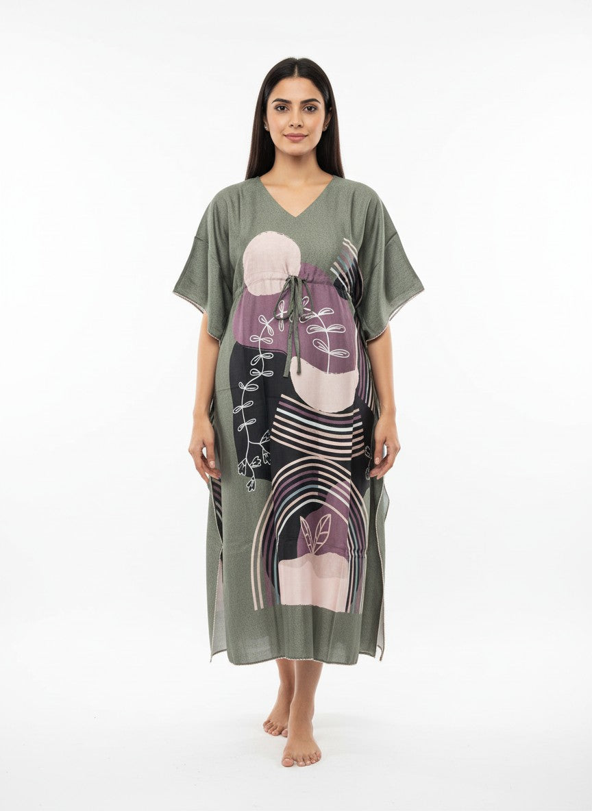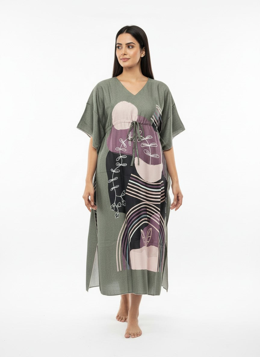 Experience ultimate comfort with this luxe lounge kaftan featuring a loose fit silhouette, long sleeves, a V-neckline, and a slip-on closure adorned with a graphic print. Crafted from lightweight viscose fabric, it ensures breathability and all-season suitability without stretch. Easy to care for with machine wash cold, this nightdress is perfect for relaxing or everyday comfort.