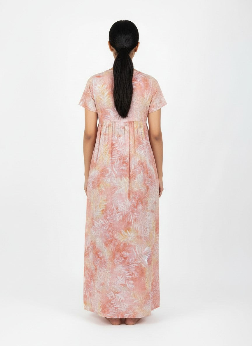 This relaxed and easy nightdress offers emotional comfort with its soft feel, perfect for lounging or a restful night's sleep. It features a regular fit silhouette with half sleeves, a round neckline, and button closure adorned with an abstract pattern. Made from lightweight viscose fabric, it ensures breathability and stretchability suitable for all seasons. Easy to care for with machine wash cold instructions, this nightdress is an ideal choice for everyday comfort.
