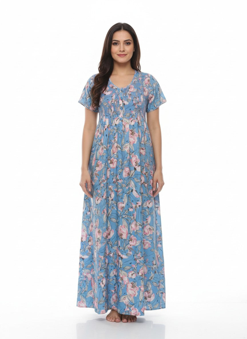 Experience relaxed and easy comfort with this BHX-EO Nighty - Frill in a soothing Denimblossom color, designed for everyday lounging and all-season wear. It features a regular fit silhouette with half sleeves, a round neckline, and button closure accented by a lovely floral pattern. Made from lightweight viscose fabric, it offers breathable comfort with stretchability, ensuring a soft touch against the skin. Easy to care for with machine wash cold instructions, this nightdress combines style and practicality for your restful moments.