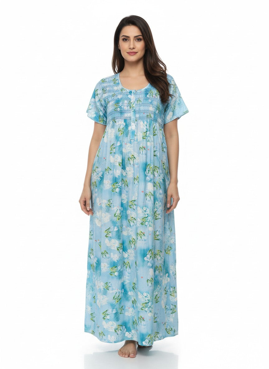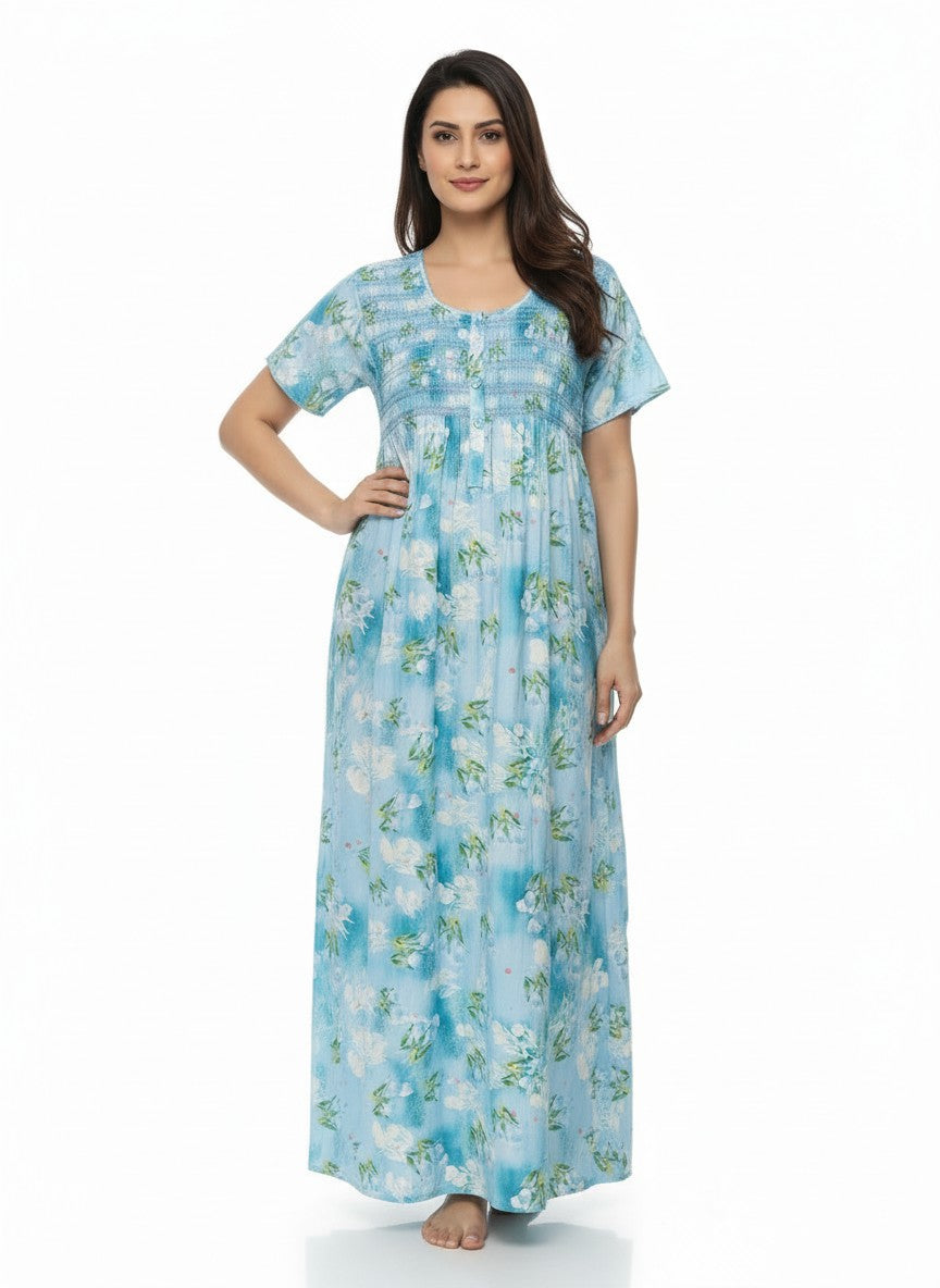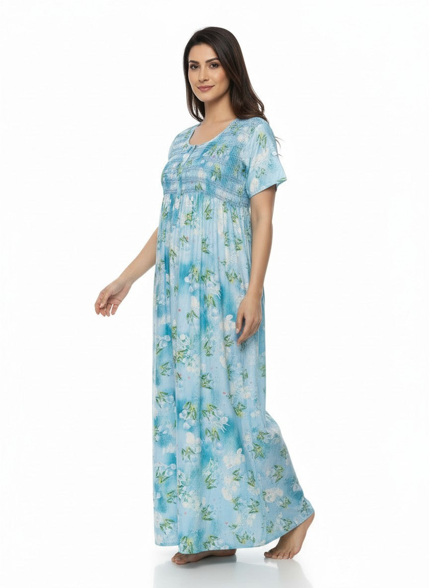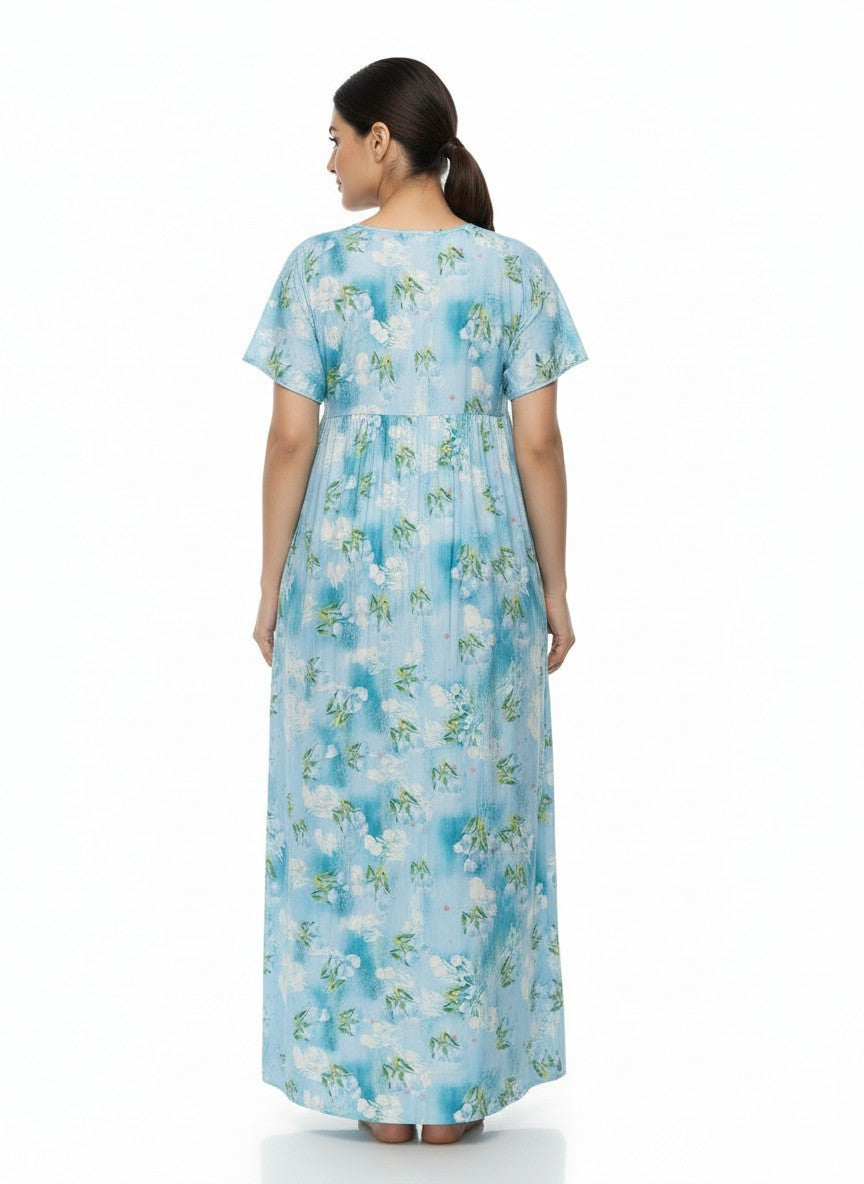 Experience relaxed comfort with this Bhx-Eo nighty featuring a regular fit silhouette, half sleeves, a round neckline, and pullover closure, adorned with a charming floral pattern. Crafted from lightweight viscose fabric, it offers breathability, stretchability, and suitable for all seasons. Easy to care for with machine wash cold instructions, this nightdress is perfect for lounging, sleeping, and everyday comfort.