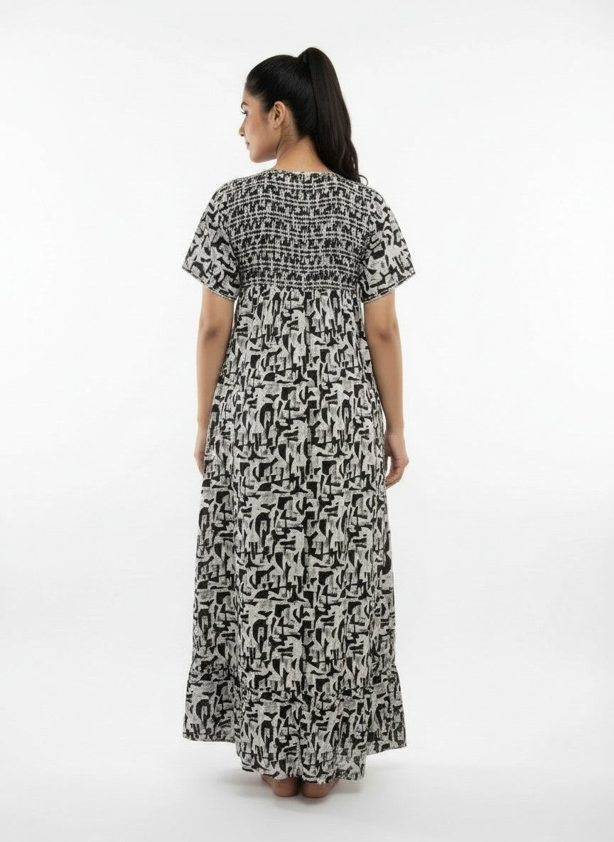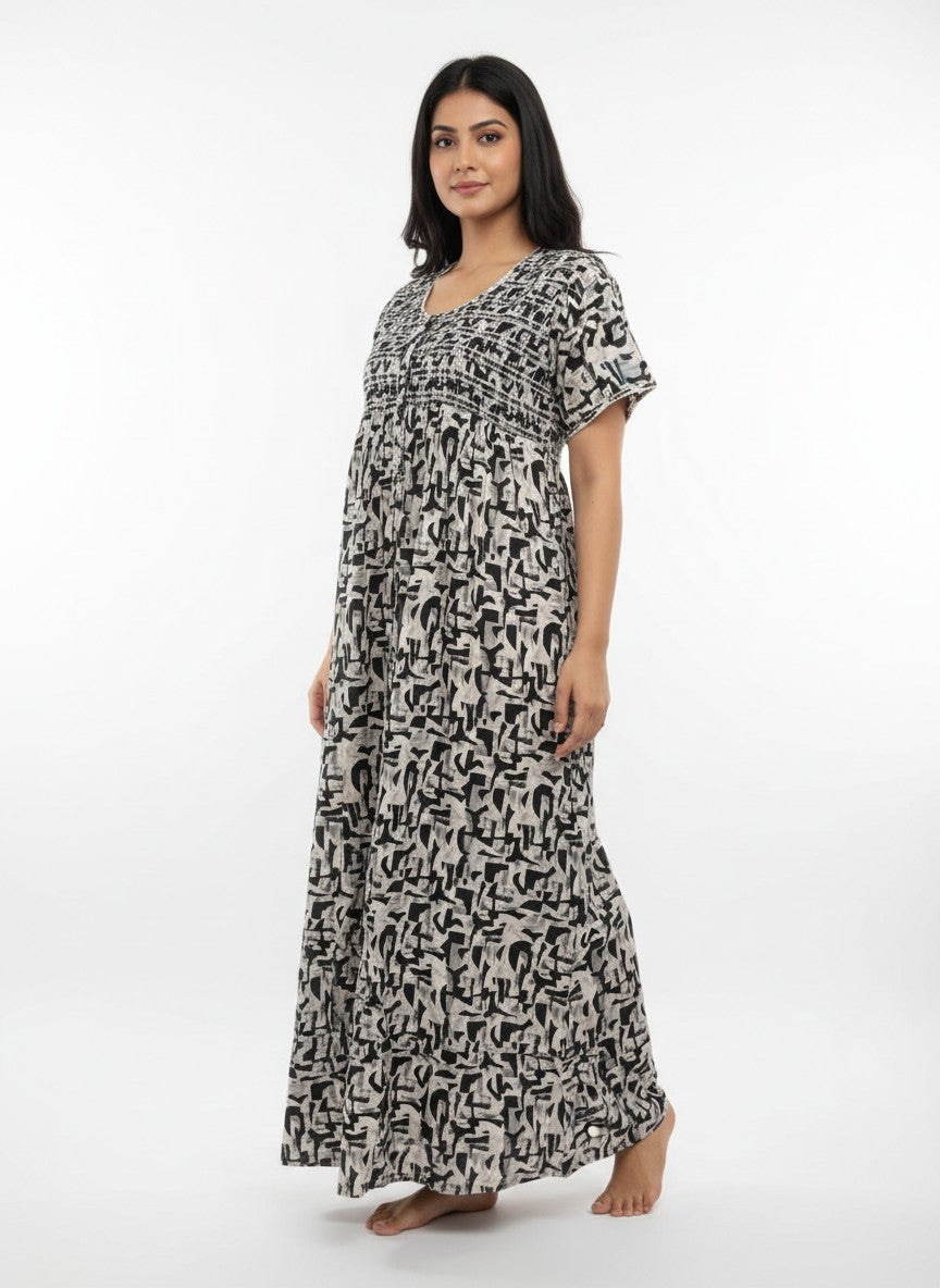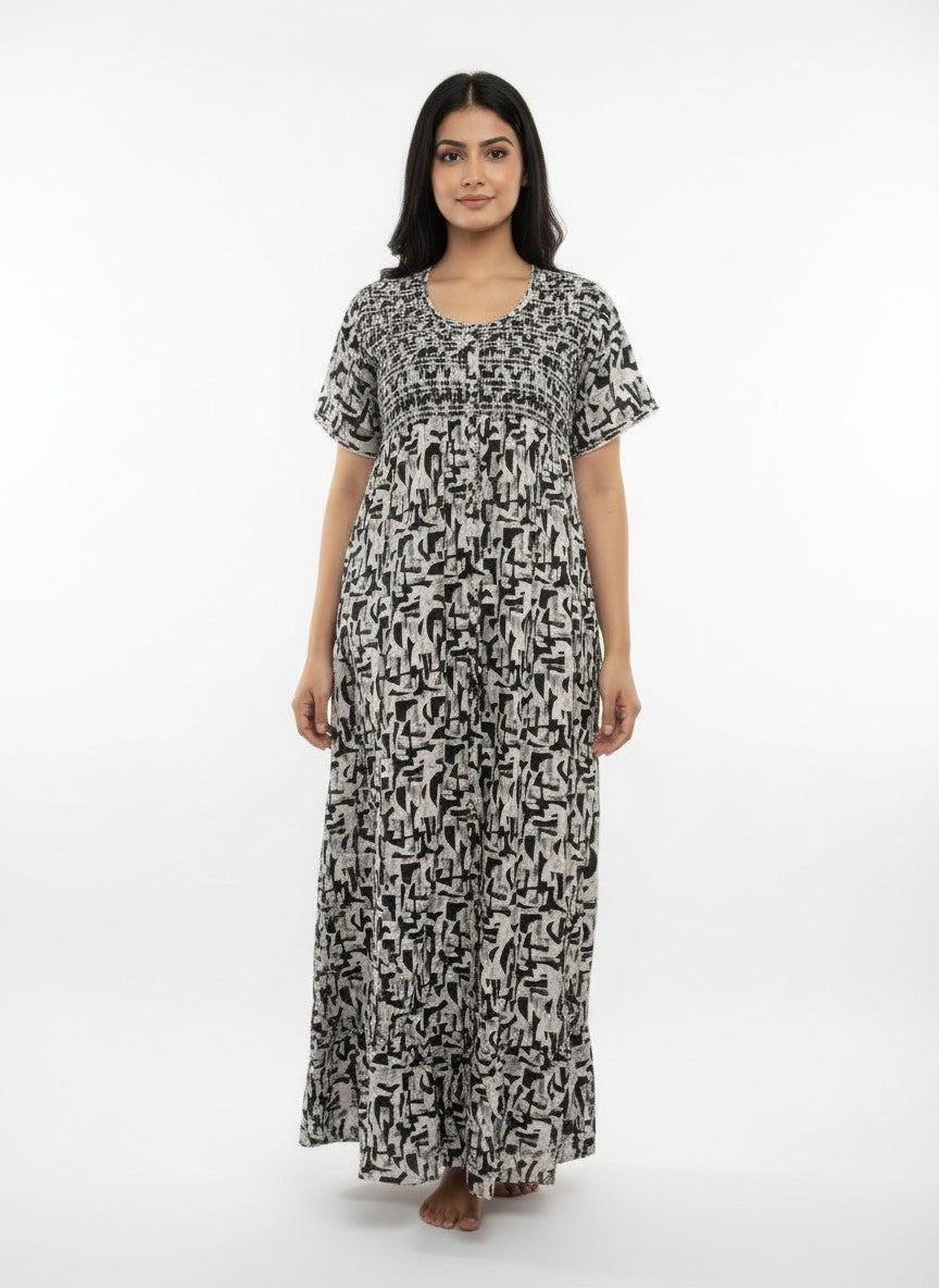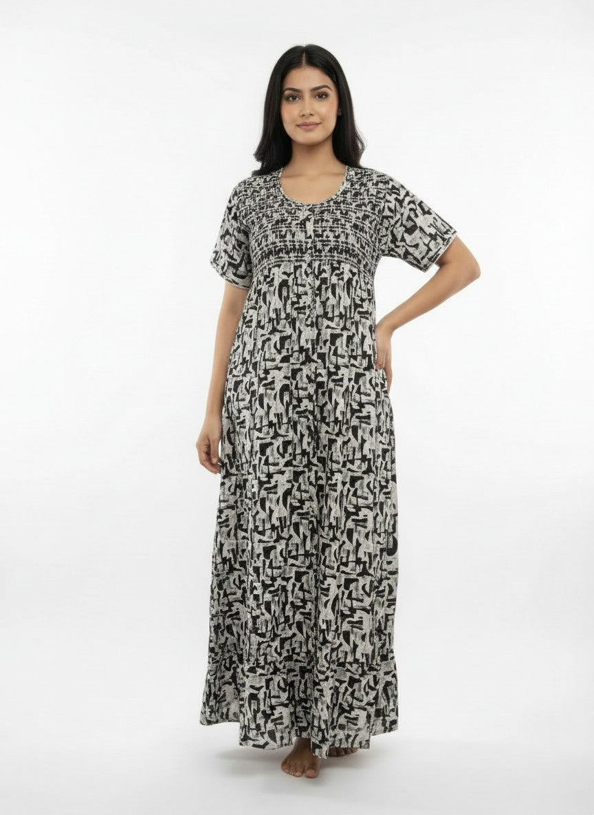 Experience the relaxed and easy comfort of this lightweight nighty featuring a regular fit silhouette with half sleeves and a round neckline, perfect for lounging or sleepwear. The pullover design offers simplicity and ease, while the abstract pattern adds artistic flair. Made from imported rayon fabric, it ensures breathability and a stretchable fit suitable for all seasons. Easy care with machine wash cold, this nighty combines style and comfort for everyday wear.