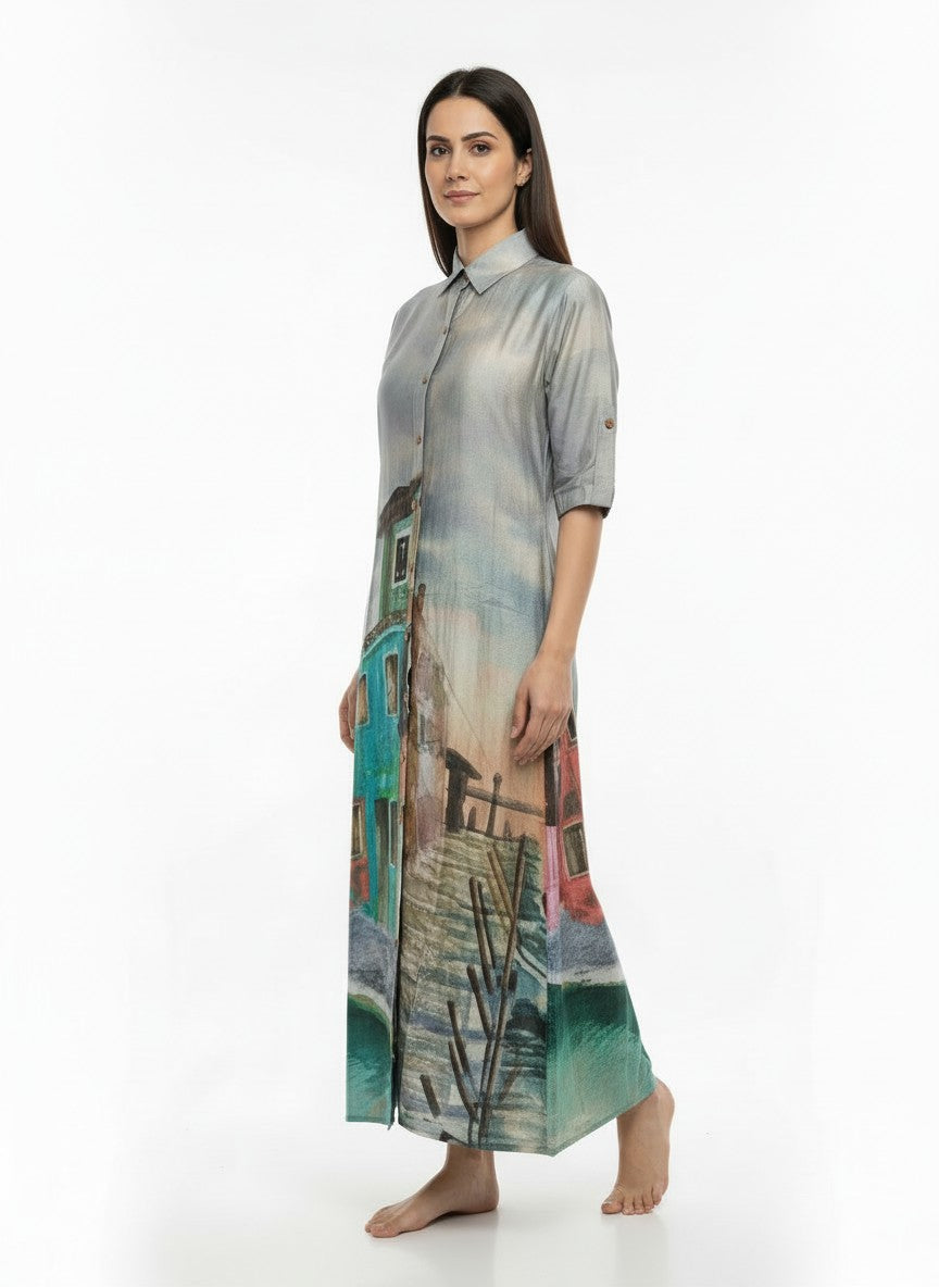 Embrace effortless comfort and relaxed luxury with this loose fit nightdress, perfect for lounging in serene softness all day or night. The design features long sleeves, a collar neck, and button closure, adorned with a tasteful graphic print that enhances its casual elegance. Crafted from viscose fabric, it offers medium weight breathability suitable for all seasons with a non-stretchable feel that maintains its shape. Easy care with machine wash cold instructions makes it a convenient choice for everyday comfort and stylish lounging.
