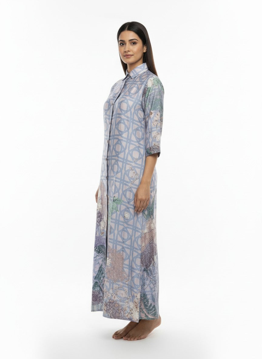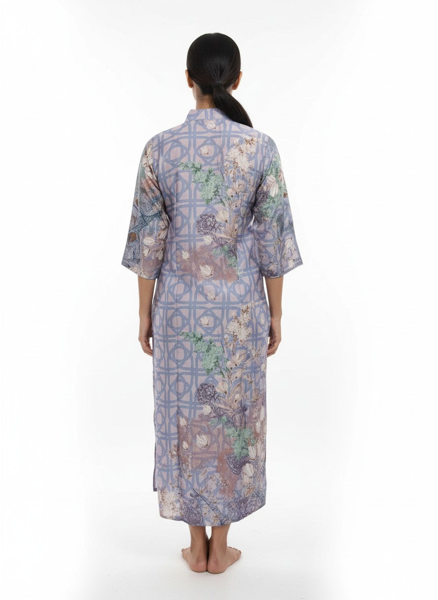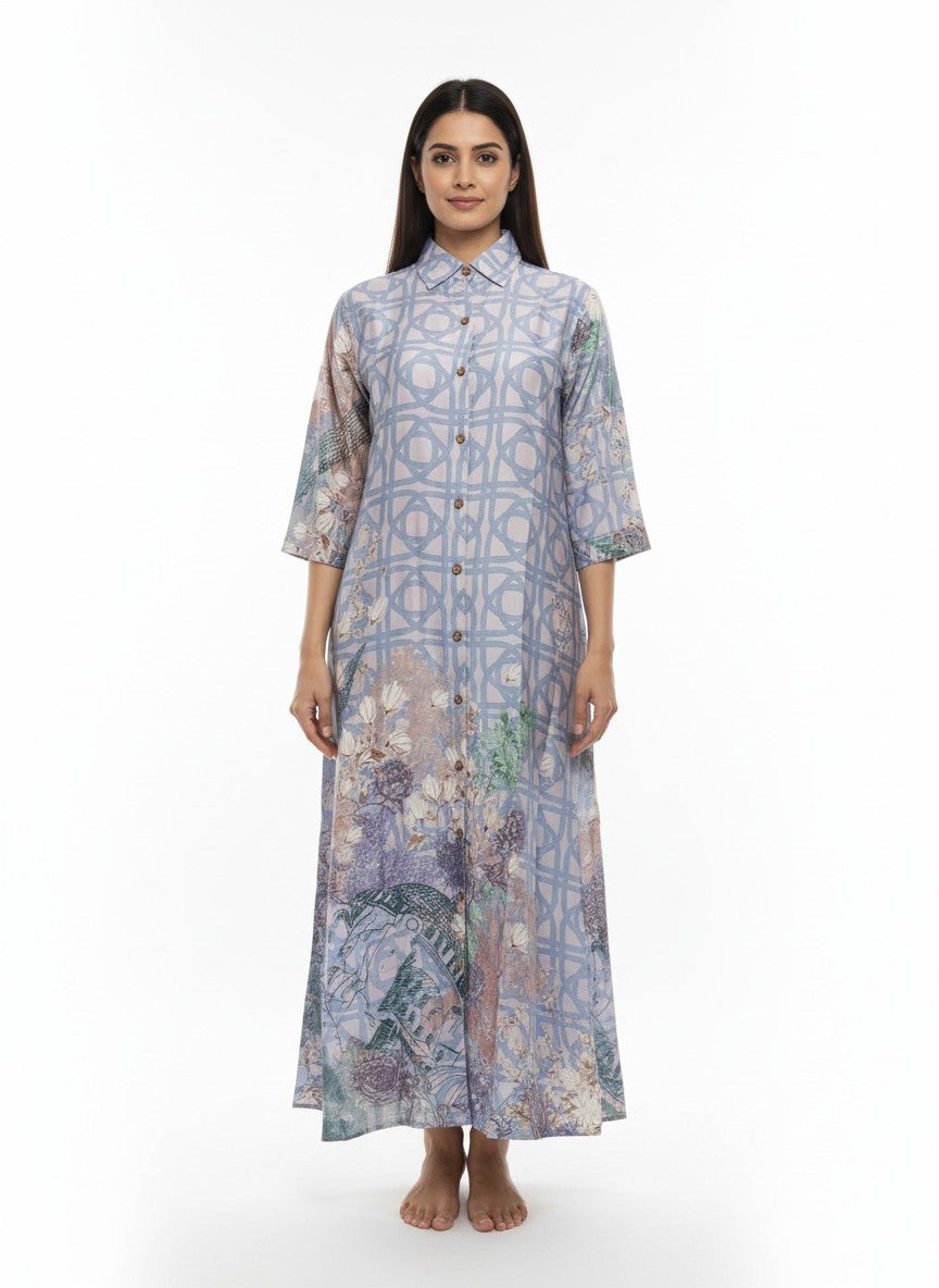 Experience ultimate emotional comfort with this loose-fit nightdress, perfect for all seasons and relaxed lounging. Designed with long sleeves, a collar neck, and button closure, the floral pattern adds a touch of elegance. Made from viscose fabric known for its medium weight, breathability, and non-stretchable qualities, it ensures day-long comfort. Easy care with machine wash cold instructions, this nightdress is an ideal choice for luxe loungewear and everyday comfort.