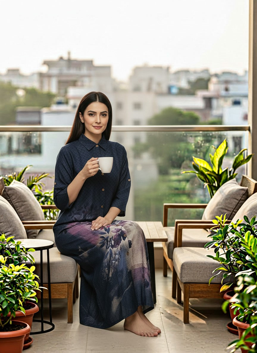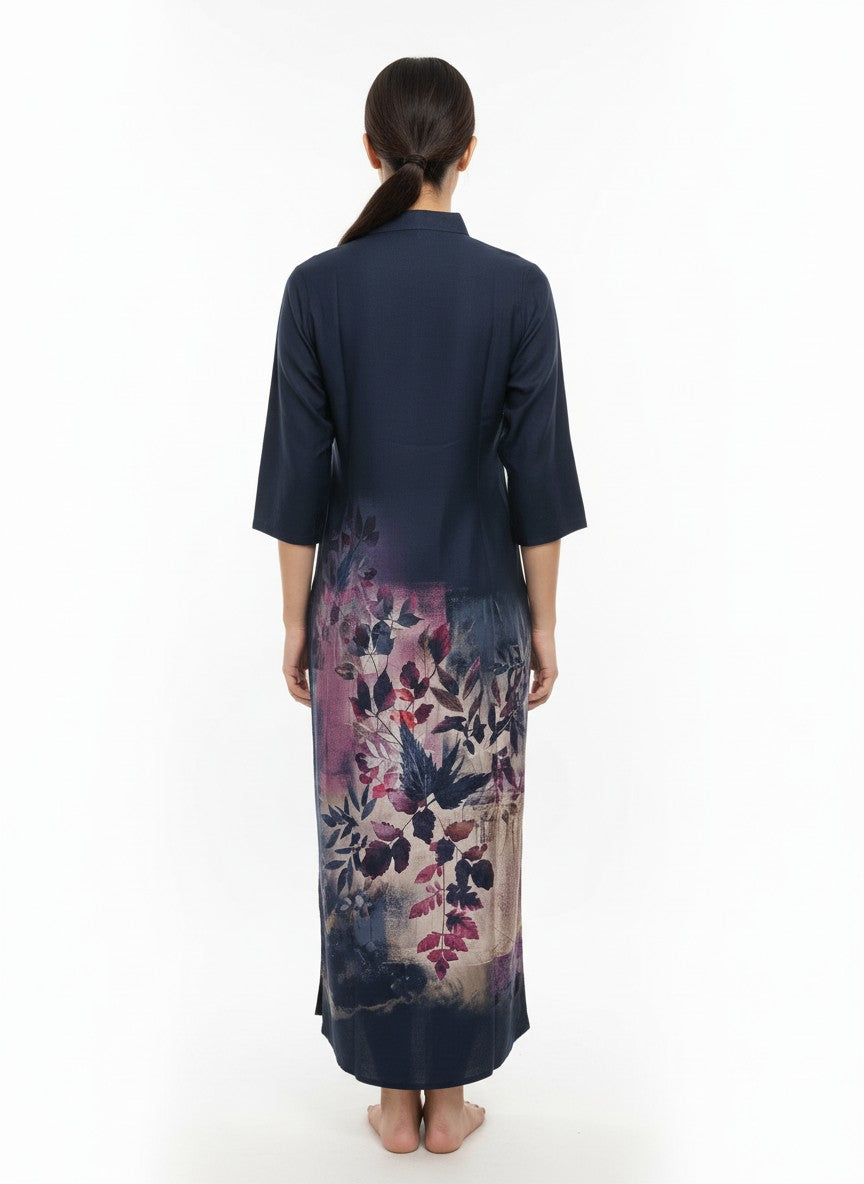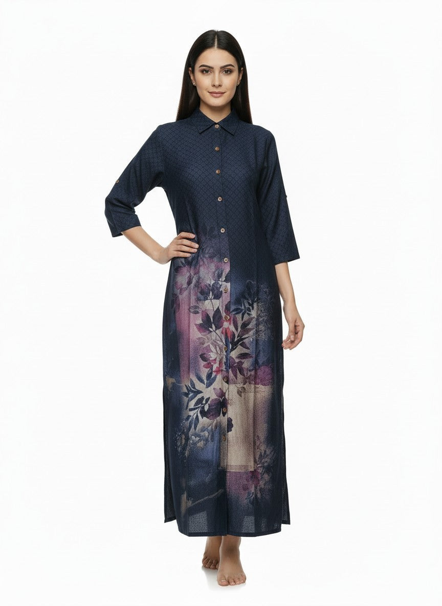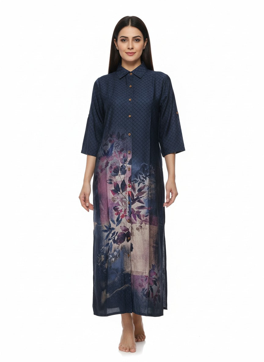 Experience ultimate comfort with this soft, loose fit nightdress featuring a floral pattern that enhances your loungewear collection. Designed with long sleeves, a collar neck, and button closure, it offers ease and style for all seasons. Made from breathable viscose fabric with medium weight and non-stretchable comfort, this nightdress is perfect for machine wash cold care, making it an ideal choice for relaxed evenings and everyday luxury lounging.