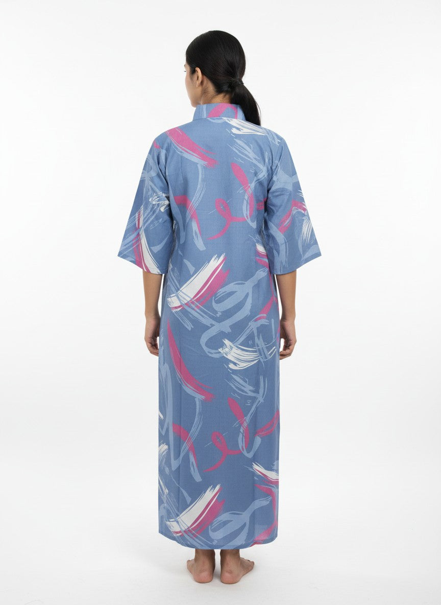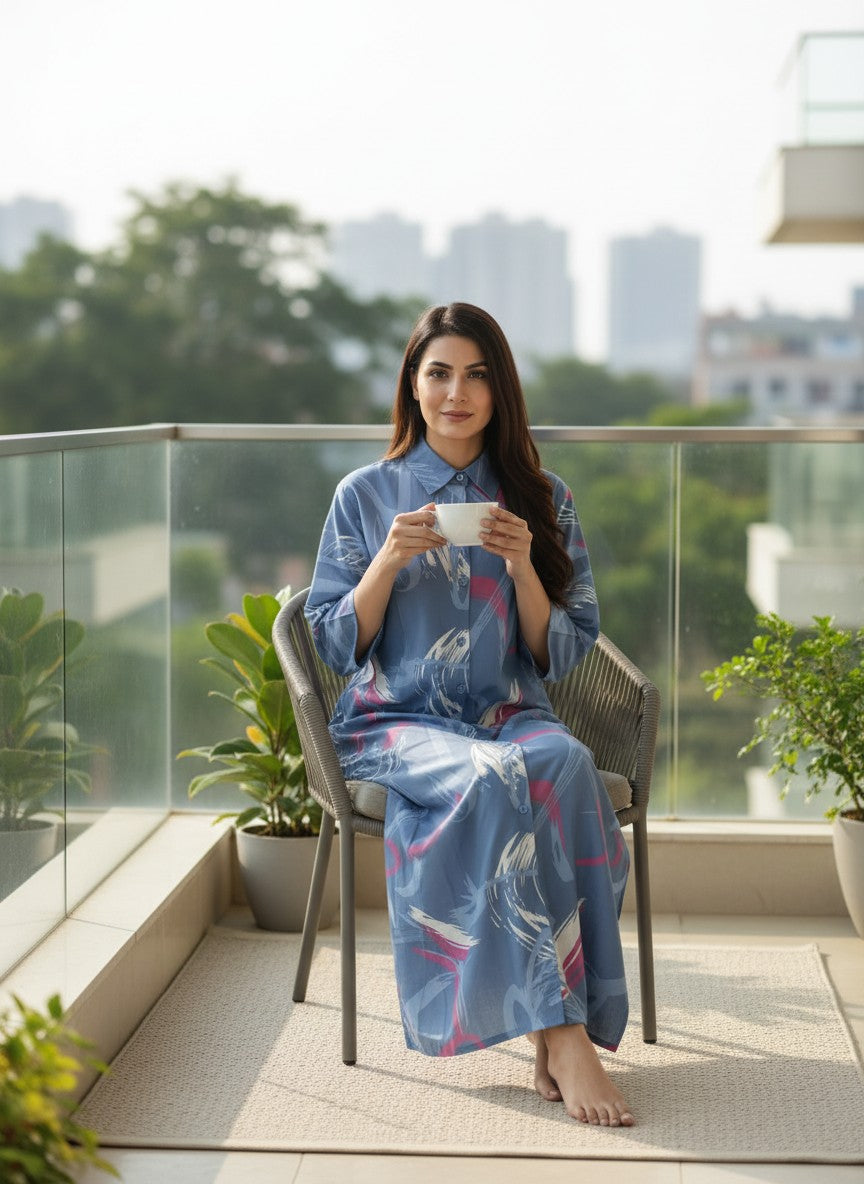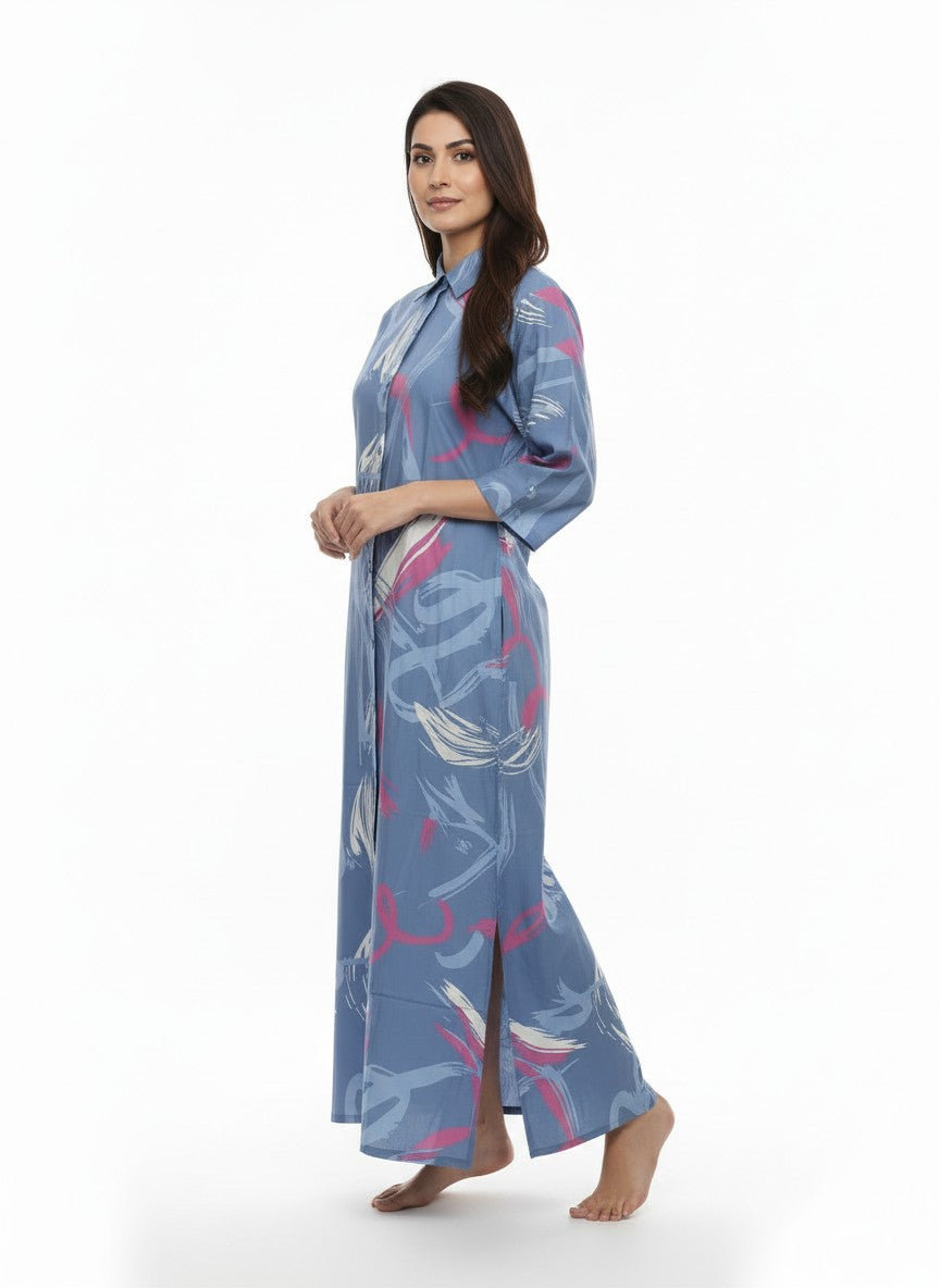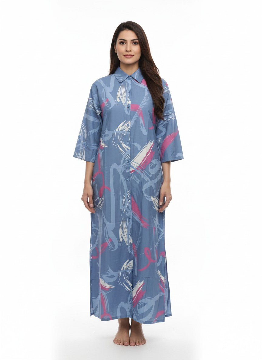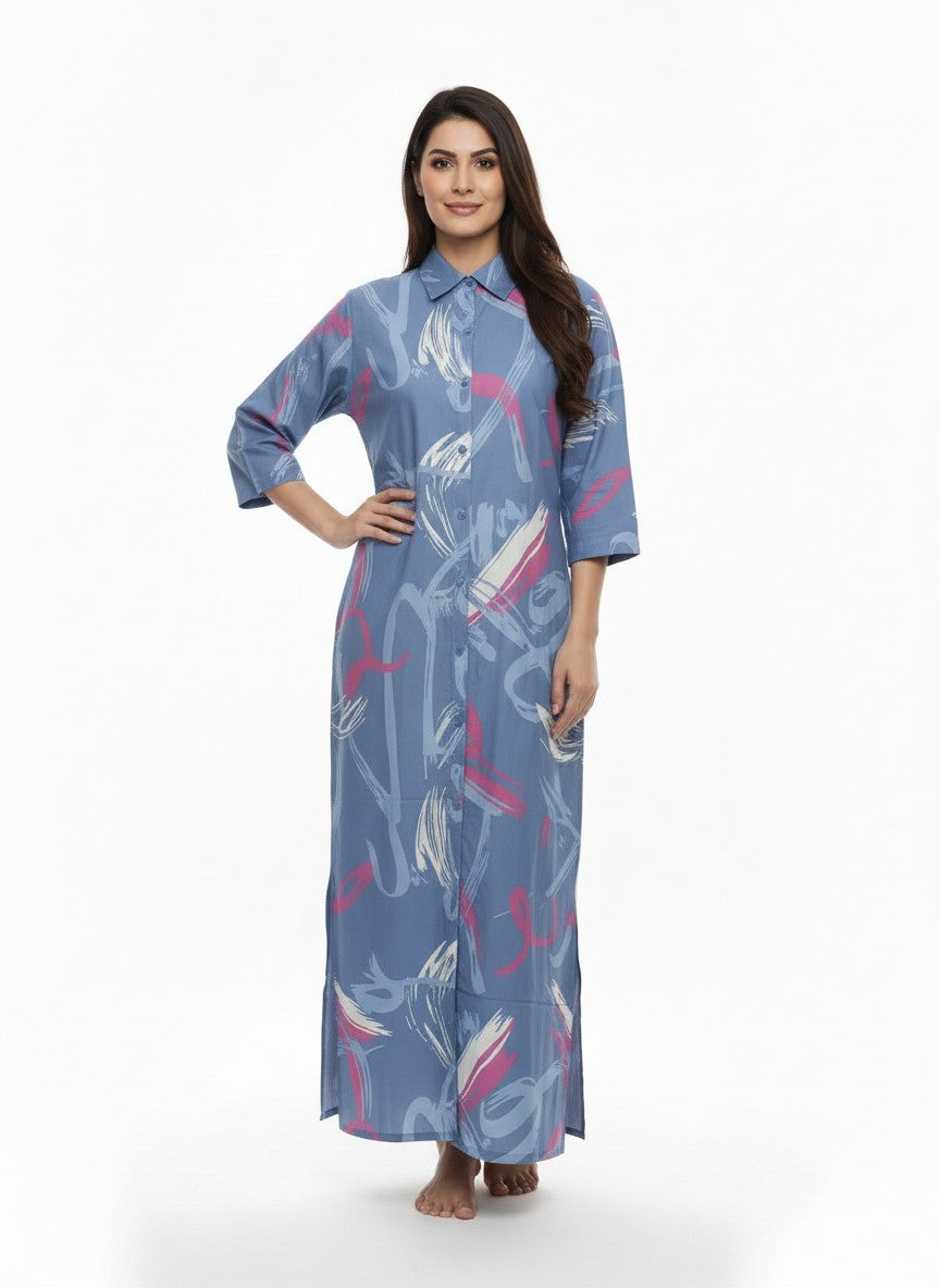 Experience ultimate comfort with this loose fit nightdress designed for relaxed lounging and restful sleep. Featuring long sleeves, a collar neck, and button closure, its abstract pattern adds a touch of elegance. Crafted from breathable viscose fabric with medium weight and non-stretchable properties, it is suitable for all seasons. Easy to care for with machine wash cold instructions, this piece is perfect for everyday comfort and luxe lounging.