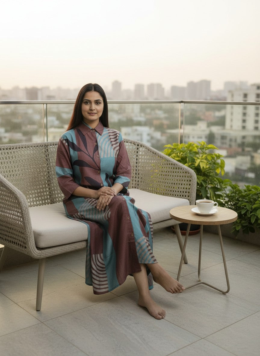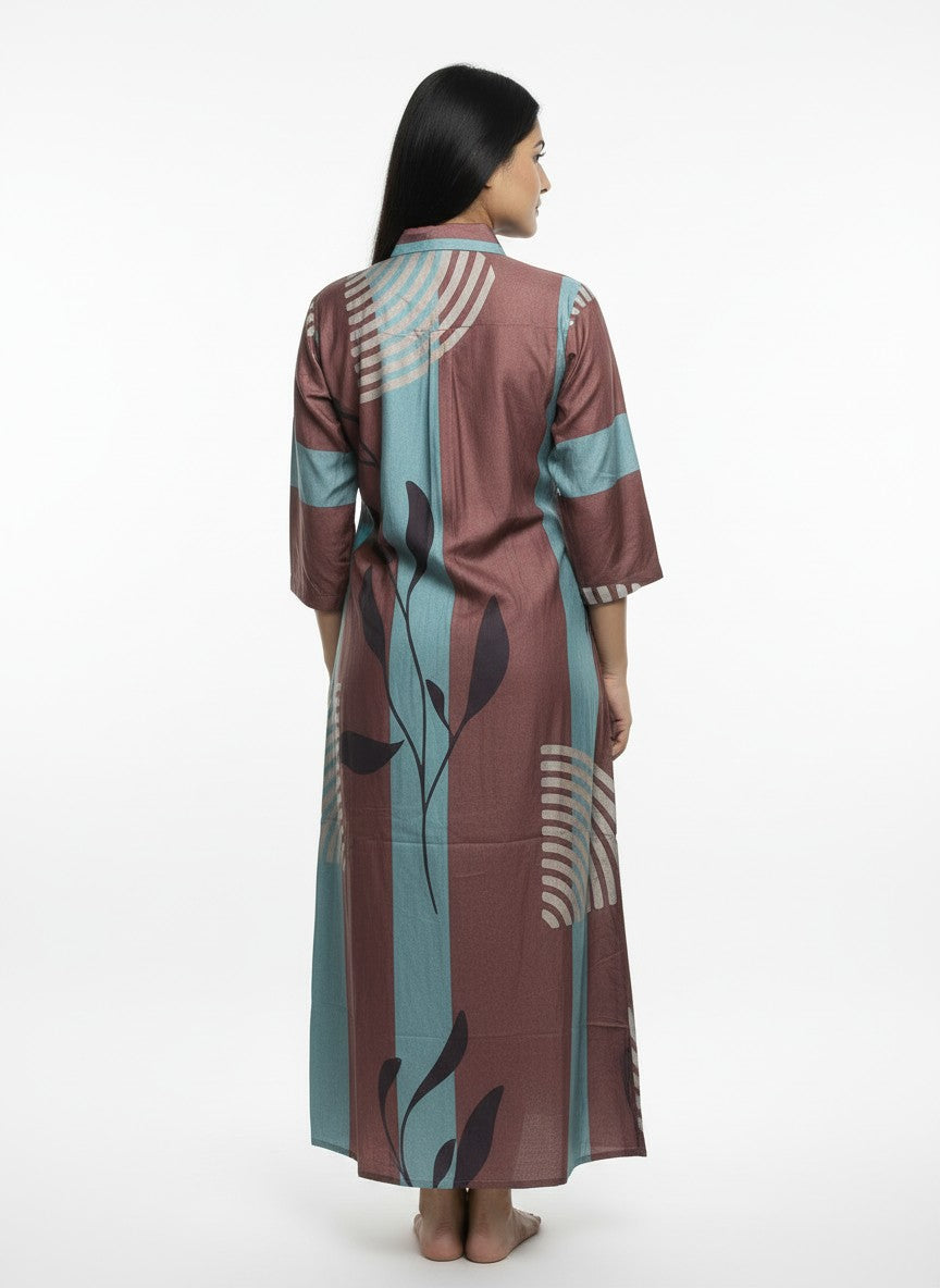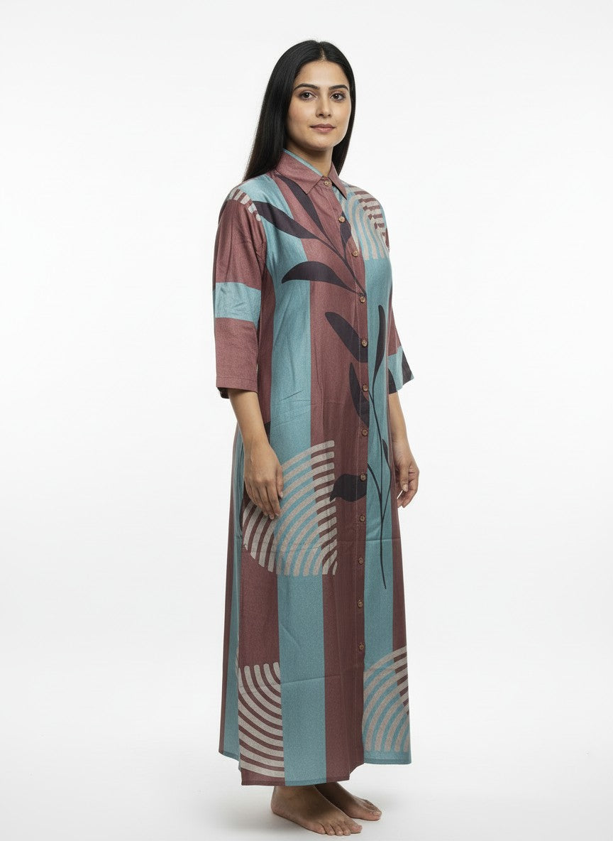 Experience ultimate comfort and an inviting mood with this BHX-EO nightdress in a loose fit silhouette perfect for lounging or sleep. Featuring long sleeves, a collar neck, and button closure, it showcases an abstract pattern for a stylish touch. Crafted from breathable, medium weight viscose, it offers non-stretchable comfort suitable for all seasons. Easy to care for with machine wash cold instructions, this piece is an ideal choice for everyday luxury and cozy relaxation.