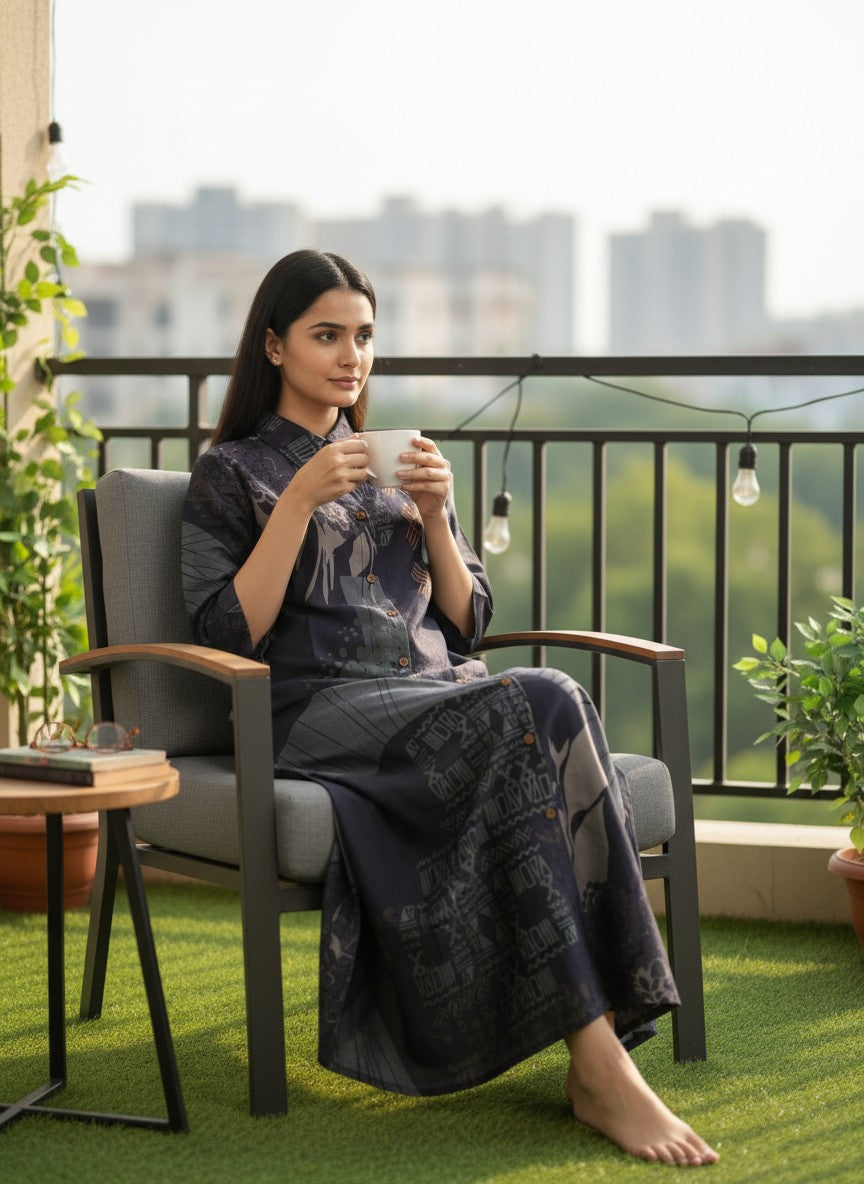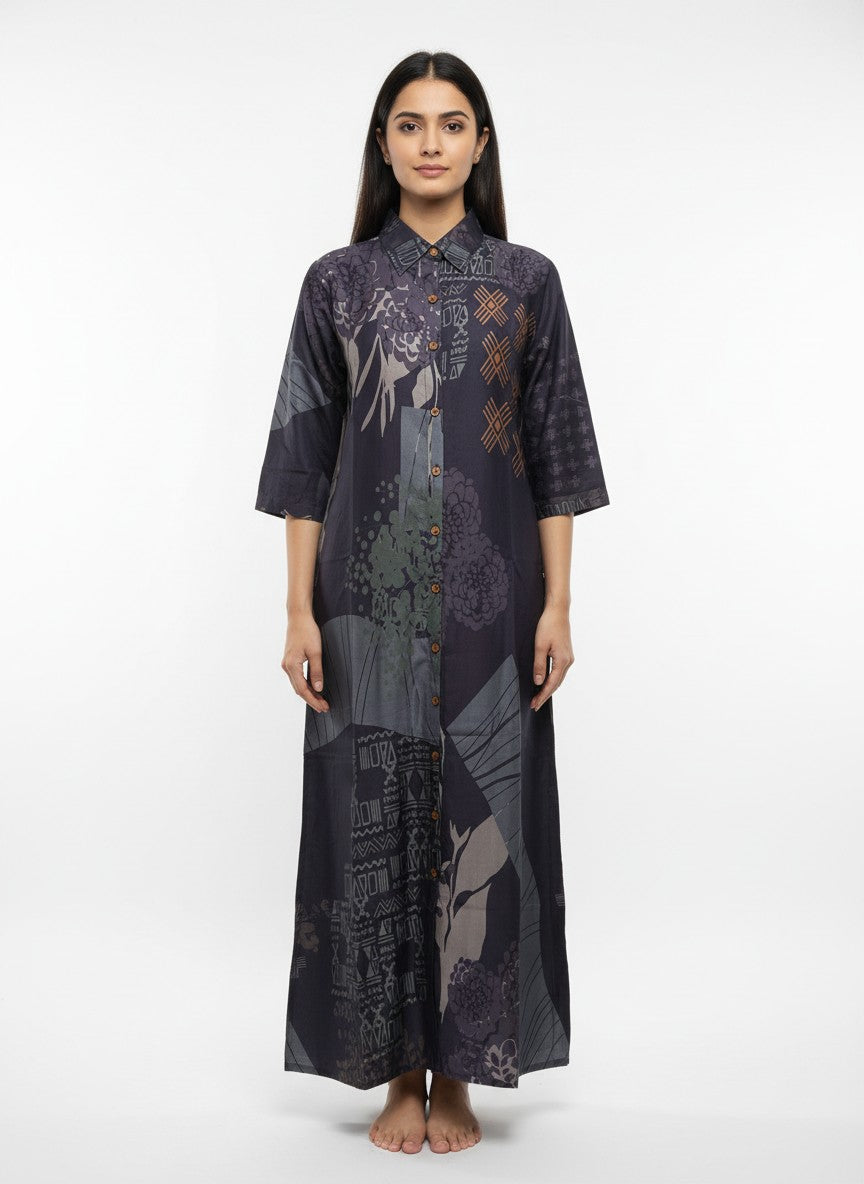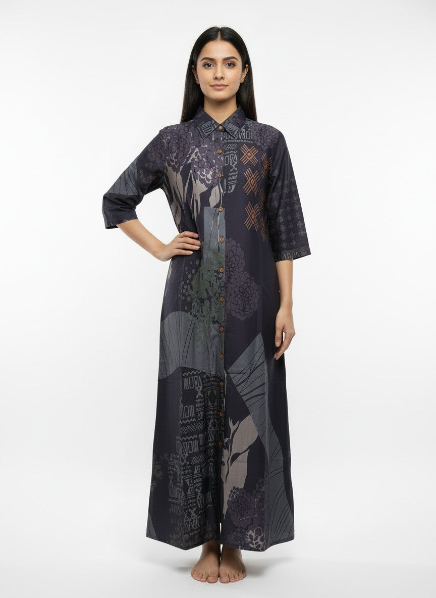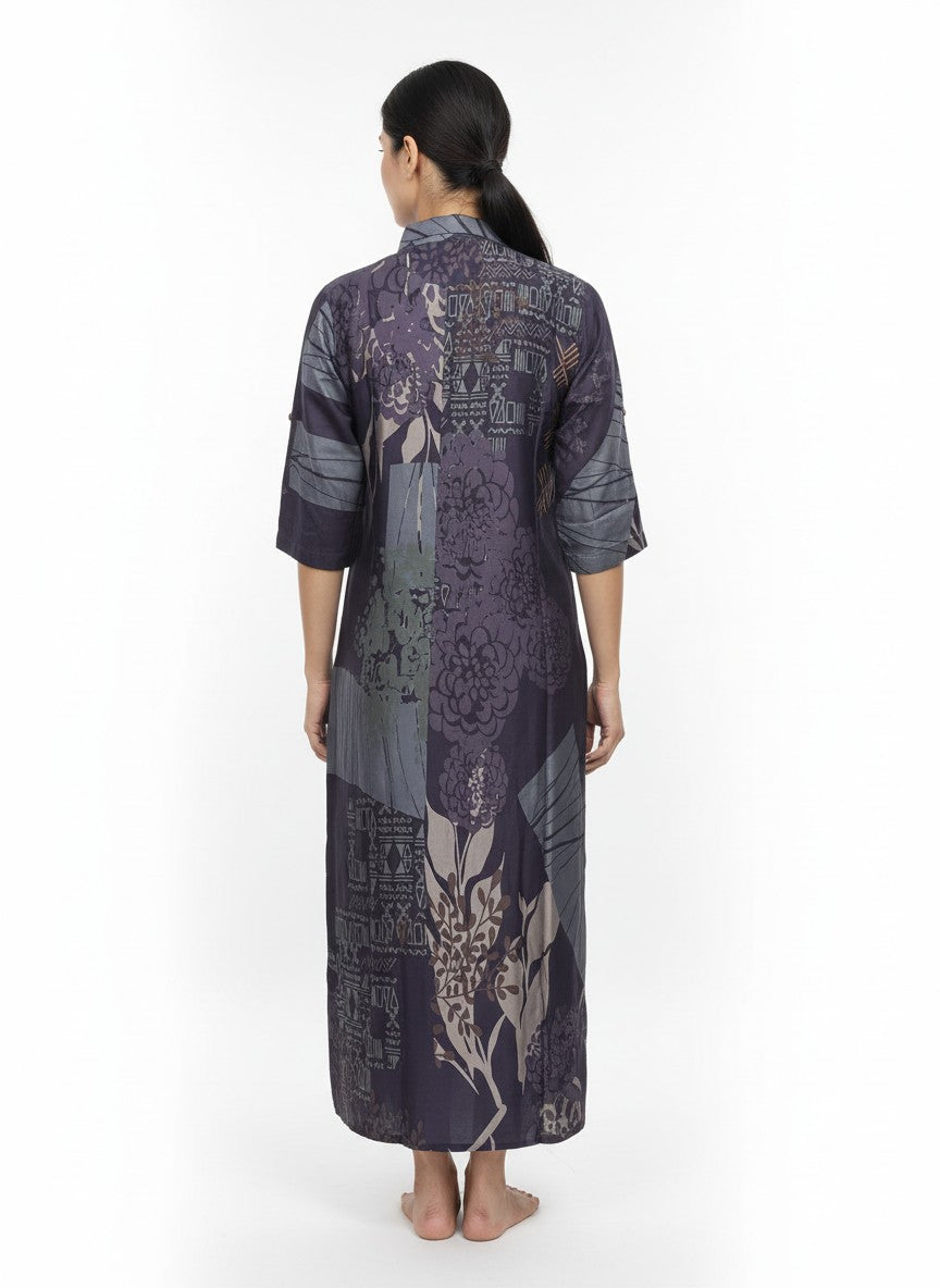 Experience soft and dreamy comfort with this BHX-Eo nightdress perfect for summer lounging and sleep. The relaxed fit silhouette features long sleeves, a collar neck, and button closure with an abstract pattern. Made from breathable viscose fabric with medium weight and non-stretchable characteristics, it ensures comfortable wear. Easy to care for with machine wash cold instructions, this nightdress combines style and everyday comfort seamlessly.