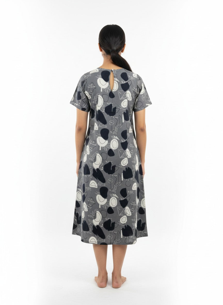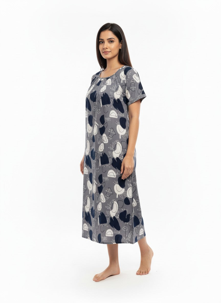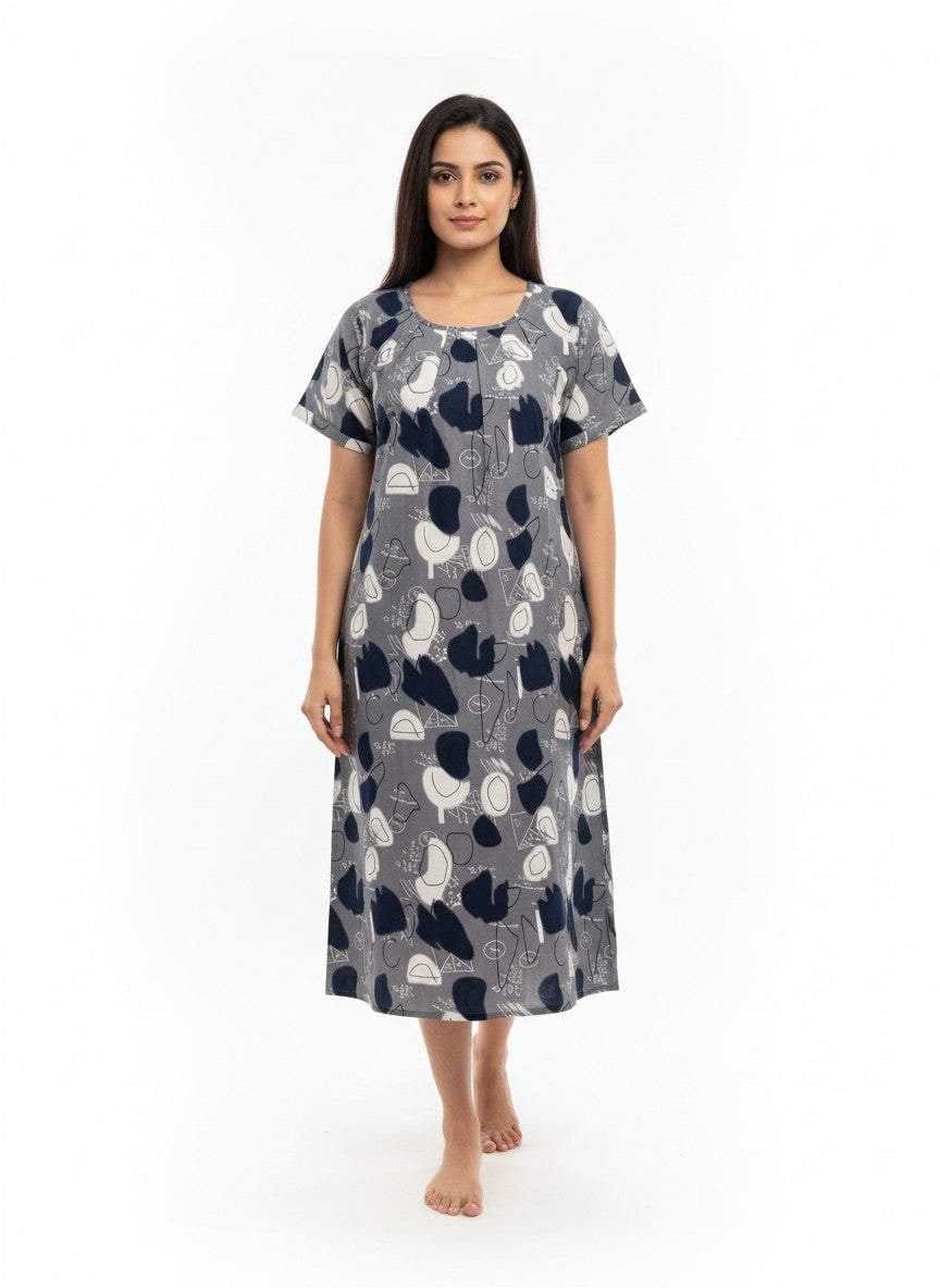 Experience ultimate comfort and a soft dreamy vibe perfect for all seasons with this loose fit short nighty from BHX-EO. Featuring half sleeves, a round neckline, and pullover closure, its abstract pattern adds a touch of design elegance. Made from breathable, lightweight imported rayon fabric that stretches comfortably, it is ideal for lounging or sleep. Easy care with machine wash cold ensures convenience and lasting wear.