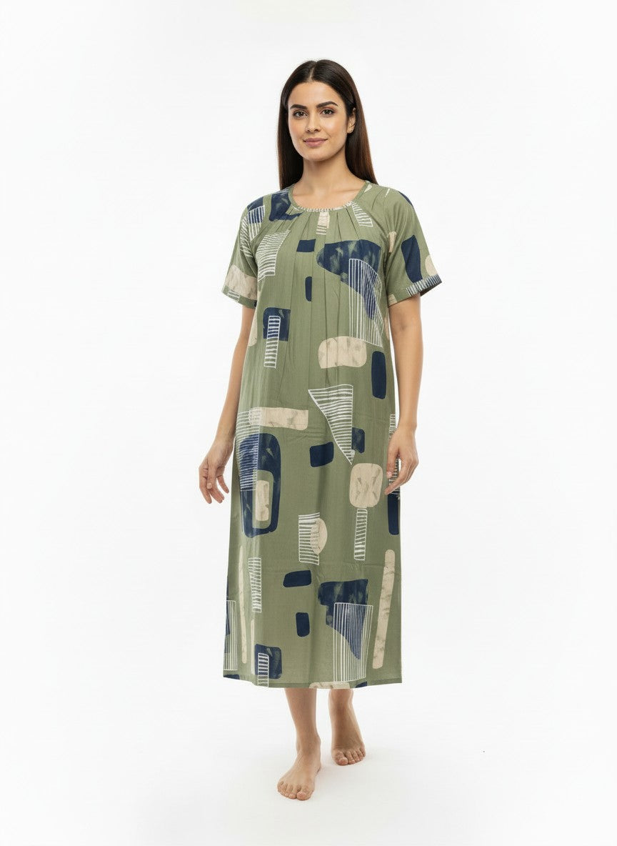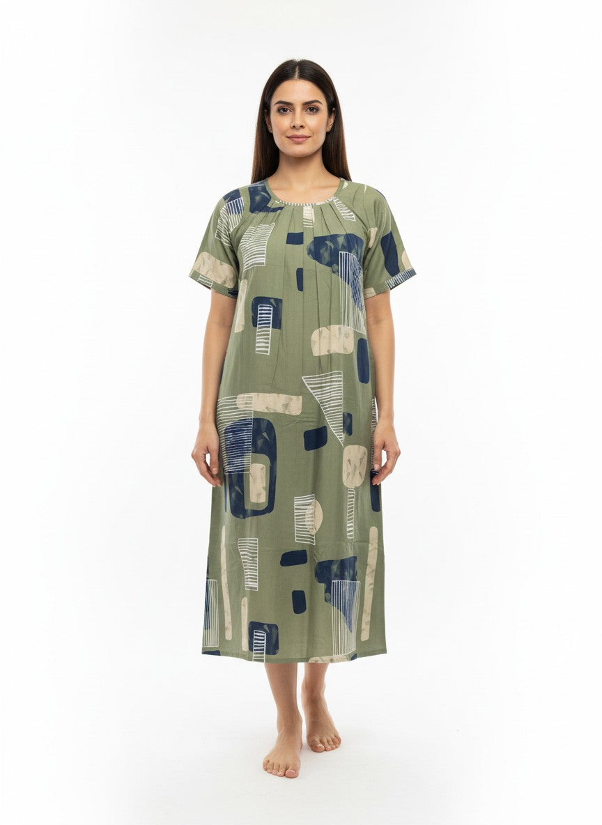 Experience a soft and dreamy comfort ideal for lounging and sleeping with this loose fit short nightie featuring half sleeves, a round neckline, and a pullover design adorned with an abstract pattern. Made from imported rayon, this lightweight, breathable, and stretchable fabric ensures comfort across all seasons. Easy to care for with machine wash cold instructions, it combines everyday ease with stylish comfort.