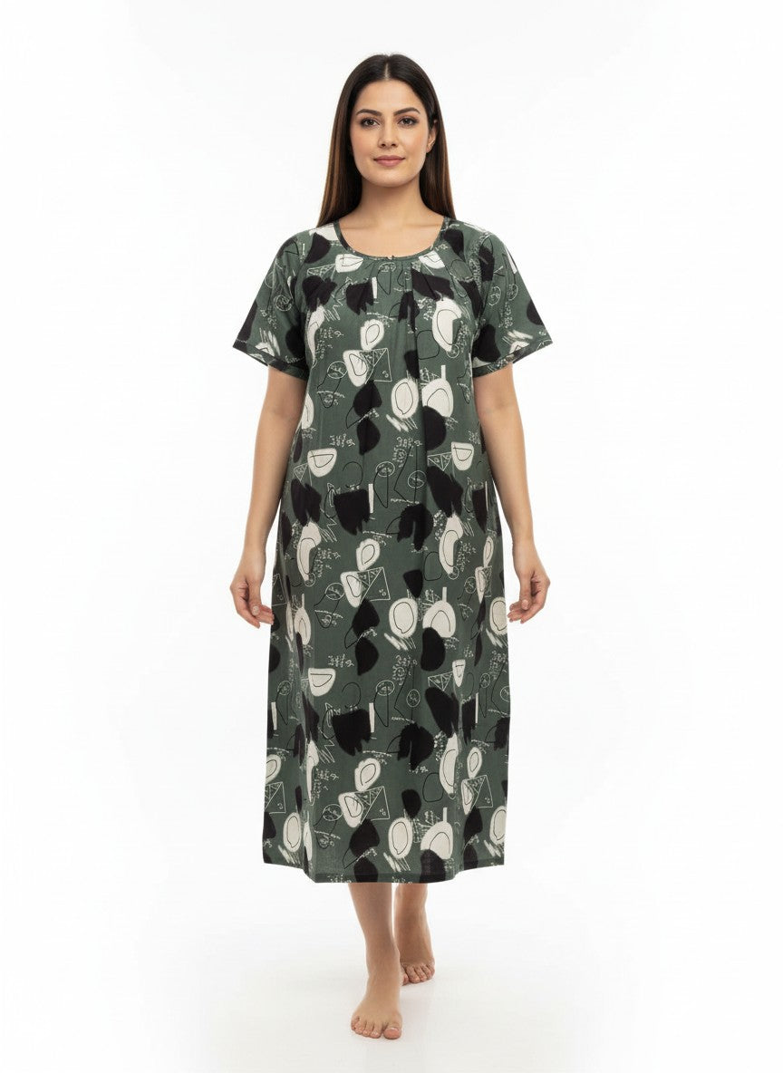 Experience unmatched soft and dreamy comfort with this loose fit short nightie, designed with half sleeves and a round neck pullover style featuring an abstract pattern. Crafted from imported viscose, it offers breathable, lightweight, and stretchable fabric suitable for all seasons. Easy to care for with machine wash cold instructions, this nightdress is perfect for restful sleep and everyday lounging.
